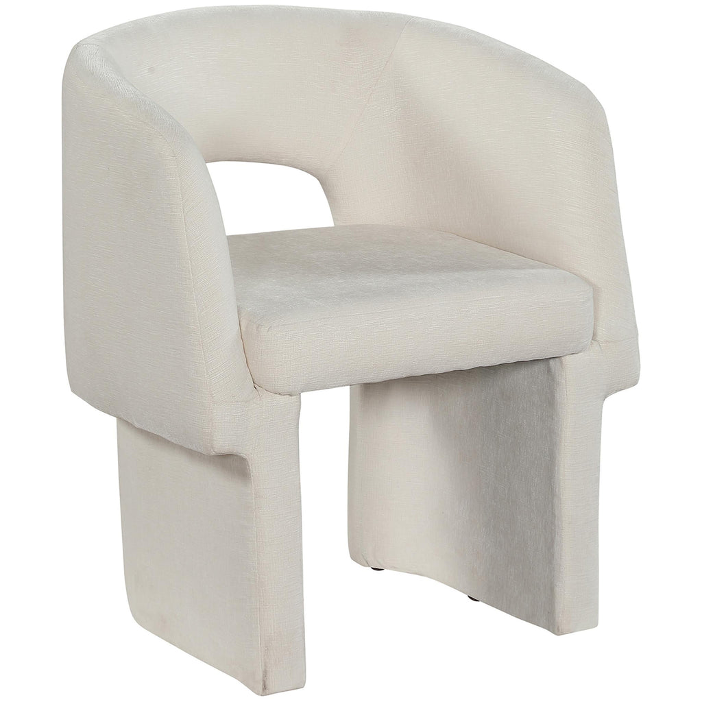 Give your dining room a blast of contemporary energy with his Emmet chenille fabric dining chair. Rich cream chenille fabric upholstery covers this chair from top to bottom, giving it a luxe feel that's soft to the touch and to the skin. The curvy back adds visual interest, and a steel inner frame ensures long-lived resilience and support. Buy this chair in multiples and pair it with the table of your choice for a fast and fabulous dining room rehab.