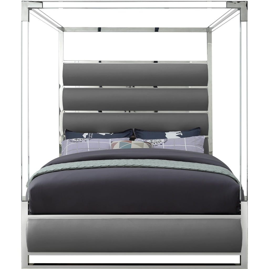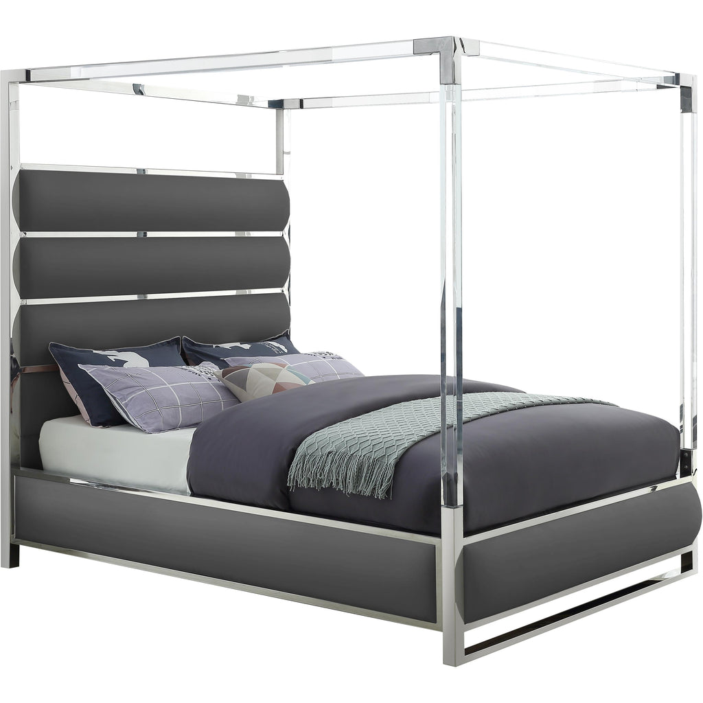 Give your bedroom a modern makeover with this Encore grey vegan leather queen bed. Eye-catchingly elegant, this bed features a boxy canopy design for a grand presentation in your space. Acrylic posts add a contemporary feel to the bed's overall look, and the heavily padded headboard is upholstered in soft grey vegan leather that's durable and tough yet gives the same supple effect as real leather. The matching footboard is also padded for a cohesive presentation in your room.