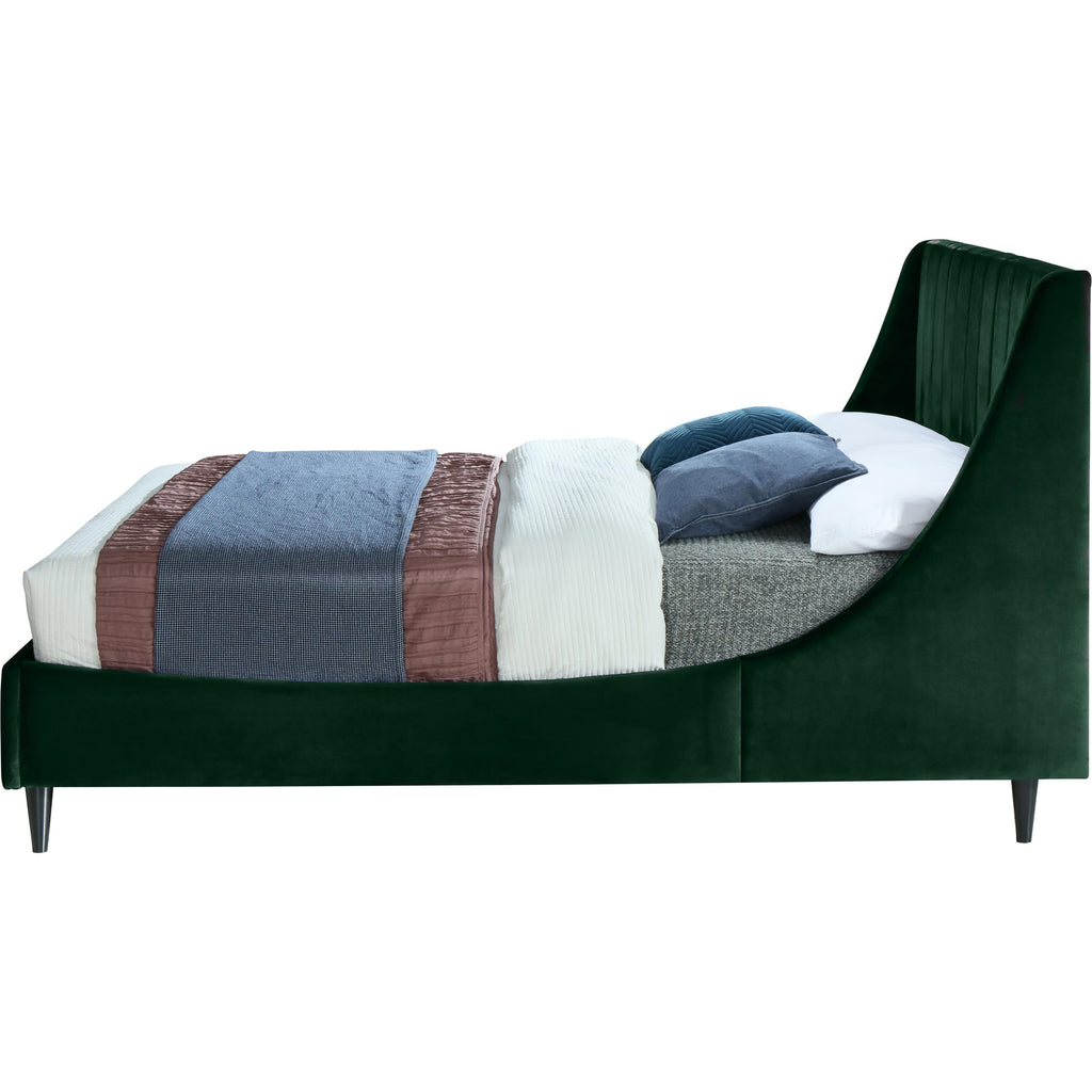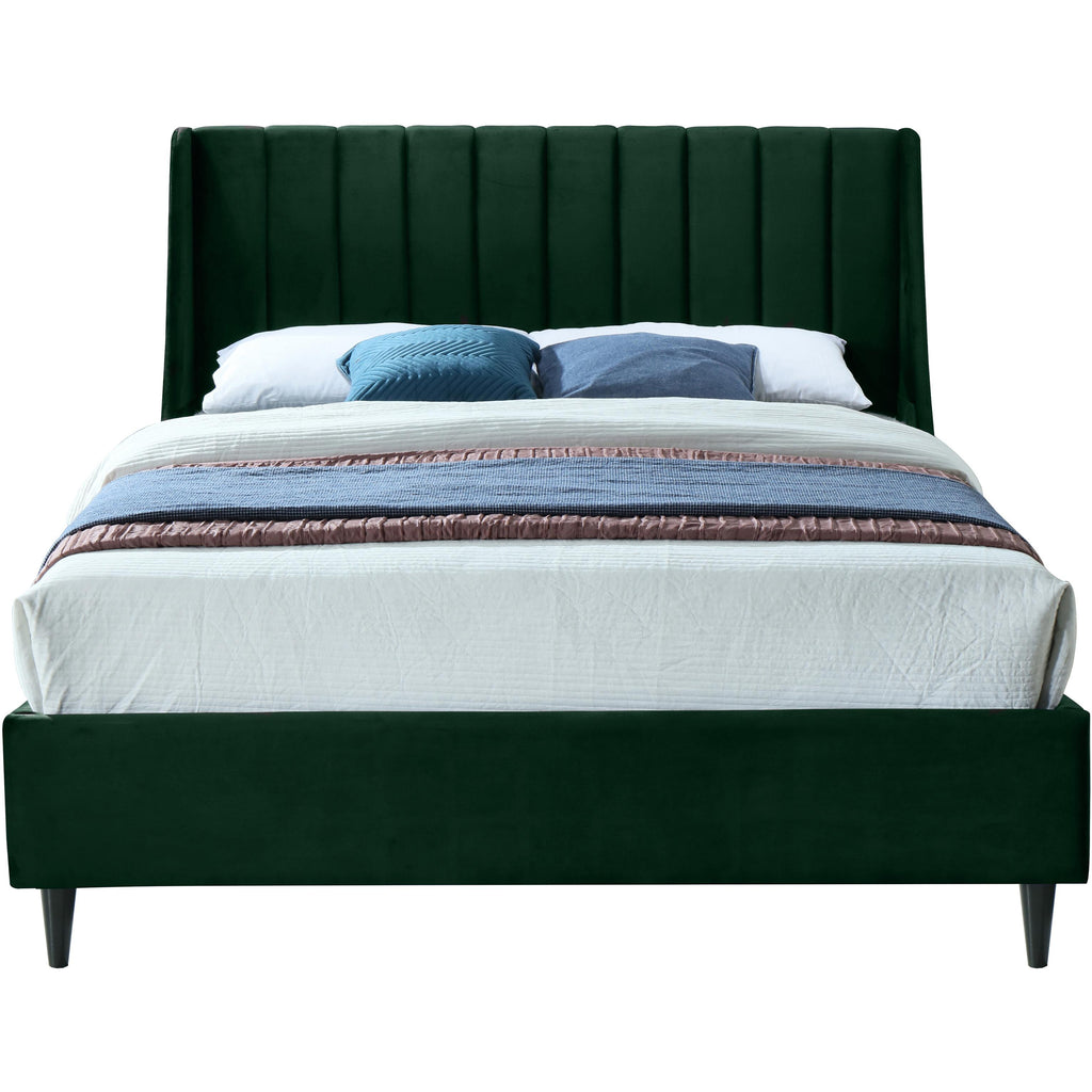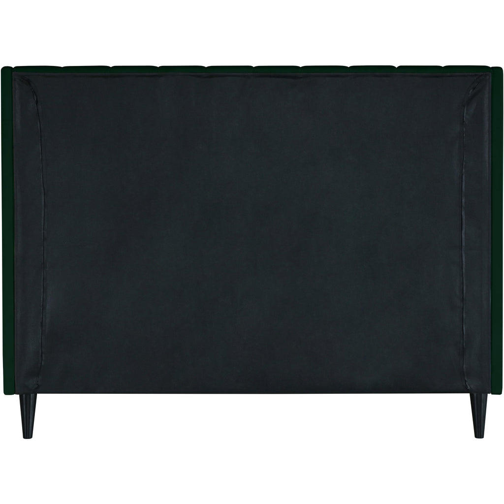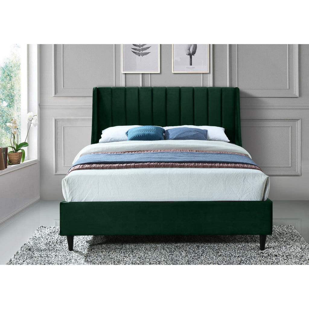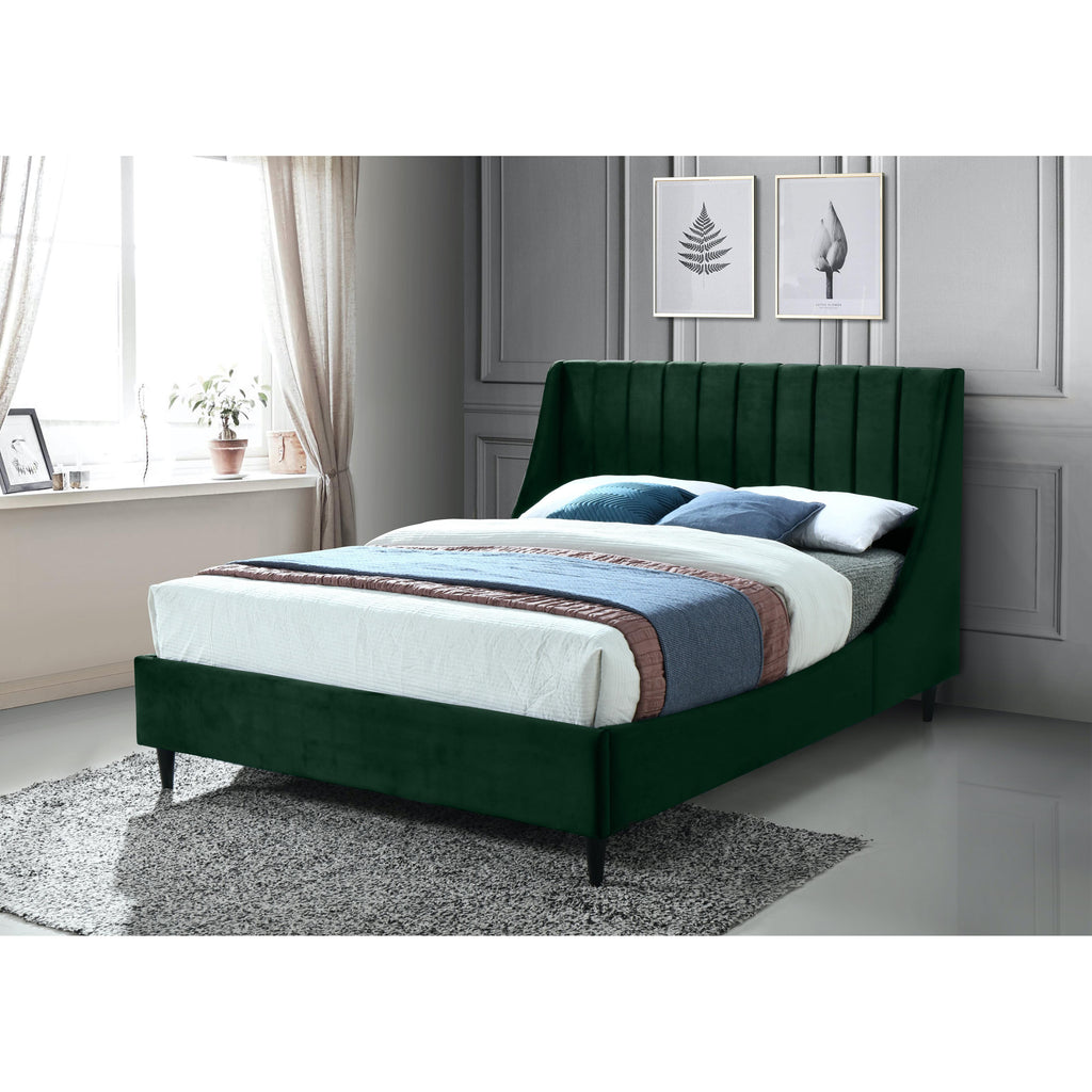 Snuggle up to a pet or other loved one in this richly upholstered Eva green velvet queen size bed for the ultimate in rest and relaxation. The wing back headboard has cushioned vertical deep channel tufting, and both the side rails and footboard are upholstered too for your comfort. Tapered black wood legs match the upholstery and support this contemporary bed, elevating it sufficiently that you can store items underneath.