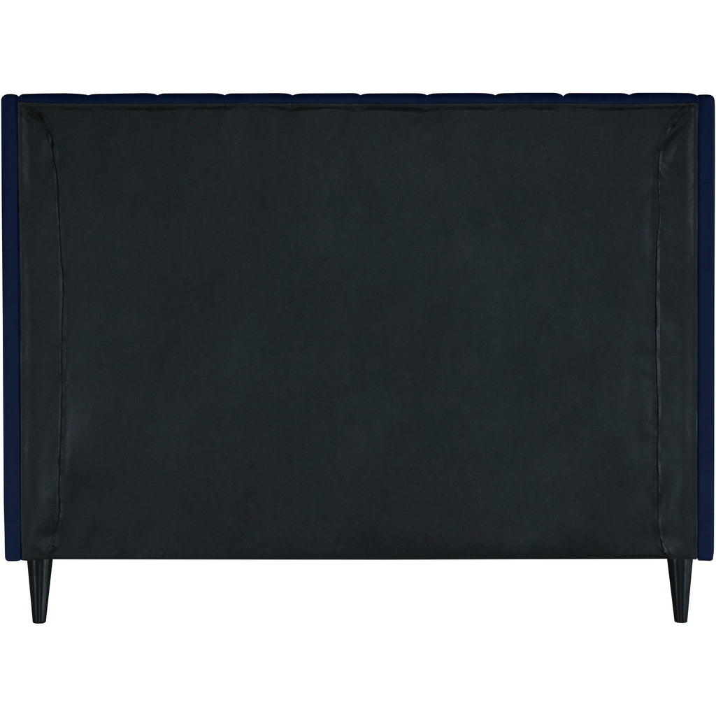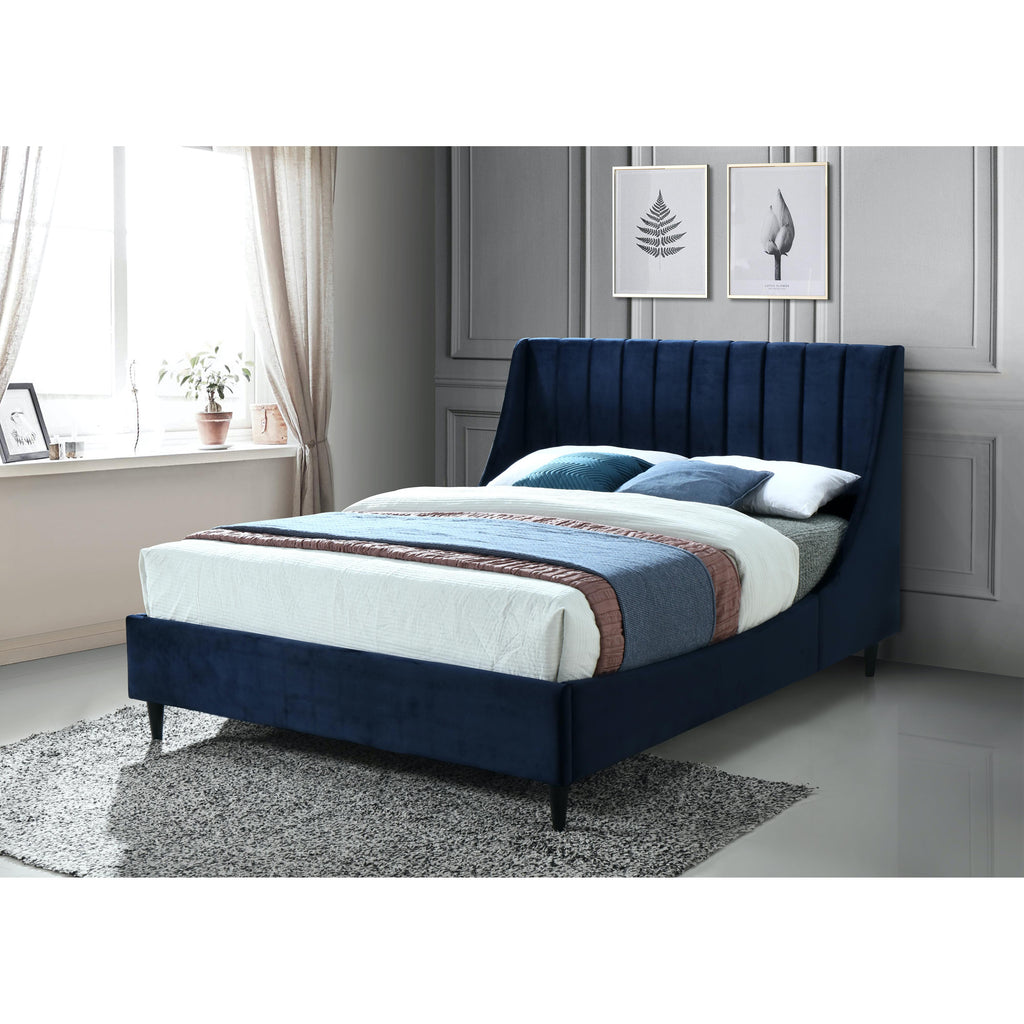 Snuggle up to a pet or other loved one in this richly upholstered Eva navy velvet queen size bed for the ultimate in rest and relaxation. The wing back headboard has cushioned vertical deep channel tufting, and both the side rails and footboard are upholstered too for your comfort. Tapered black wood legs match the upholstery and support this contemporary bed, elevating it sufficiently that you can store items underneath.