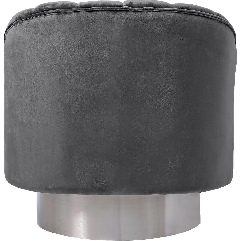 Relax and unwind in this Farrah grey velvet swivel accent chair. A beautifully modern design with hints of retro flair epitomize this lovely chair, which rests on a stainless steel base that's finished in chrome for a sleek, modern touch. The grey velvet upholstery gives the chair a sumptuous look, while beveled tufting lends it a plush, welcoming feel and keeps the foam inside aloft. For added fun, the chair swivels from side to side.