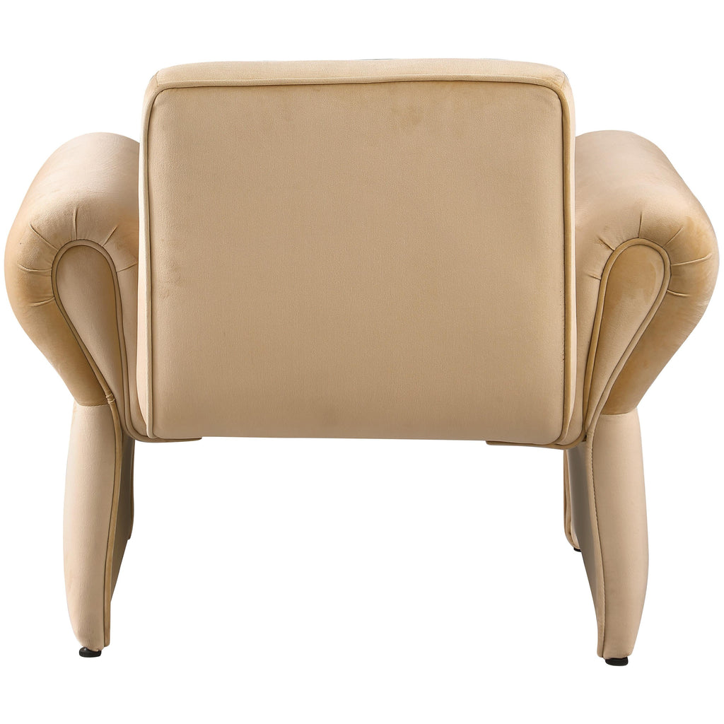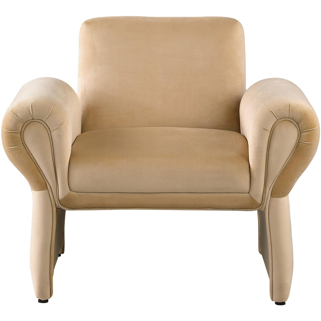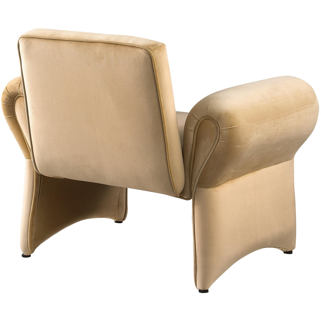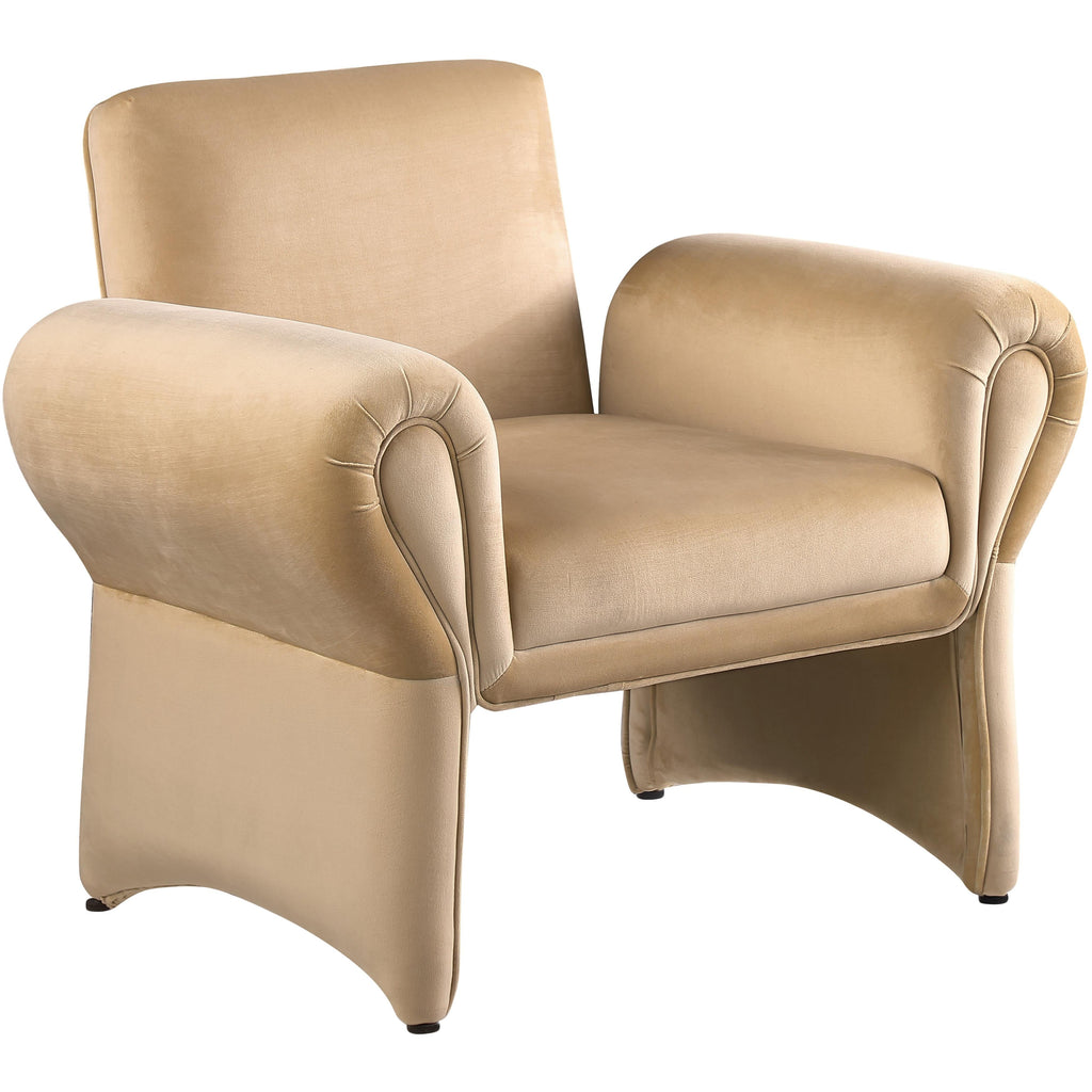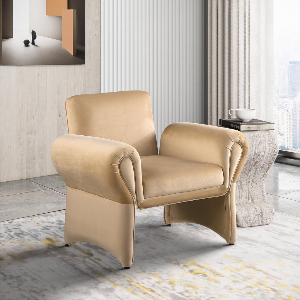 Kick back in this Fleurette velvet accent chair to get comfortable and cozy after a hard day at the office. Soft camel velvet upholstery covers every square inch of this lovely chair, making it the perfect spot for curling up with a bestseller or just relaxing. An iron frame and foam padding add to the chair's long-lived beauty and performance, and the curved arms make for an uber contemporary look. The chair's design allow lots of clearance below for cleaning.
