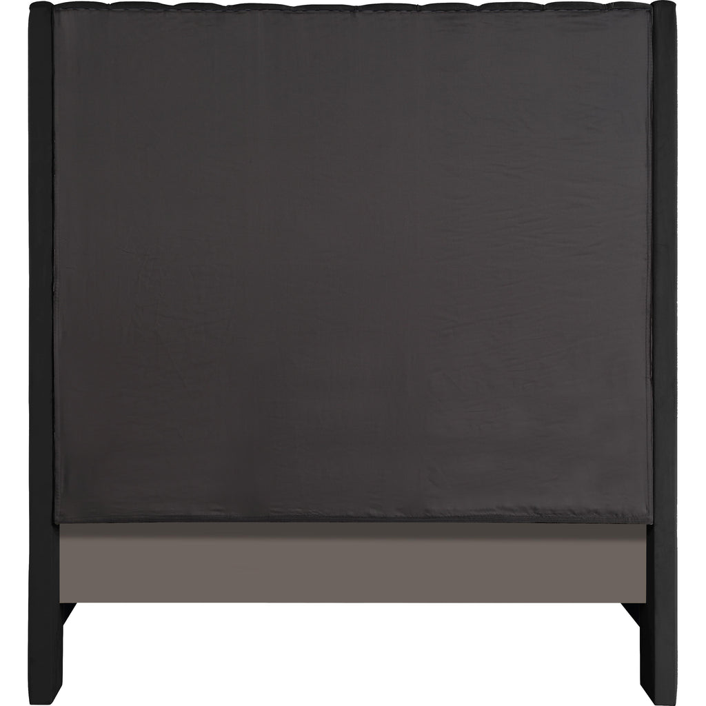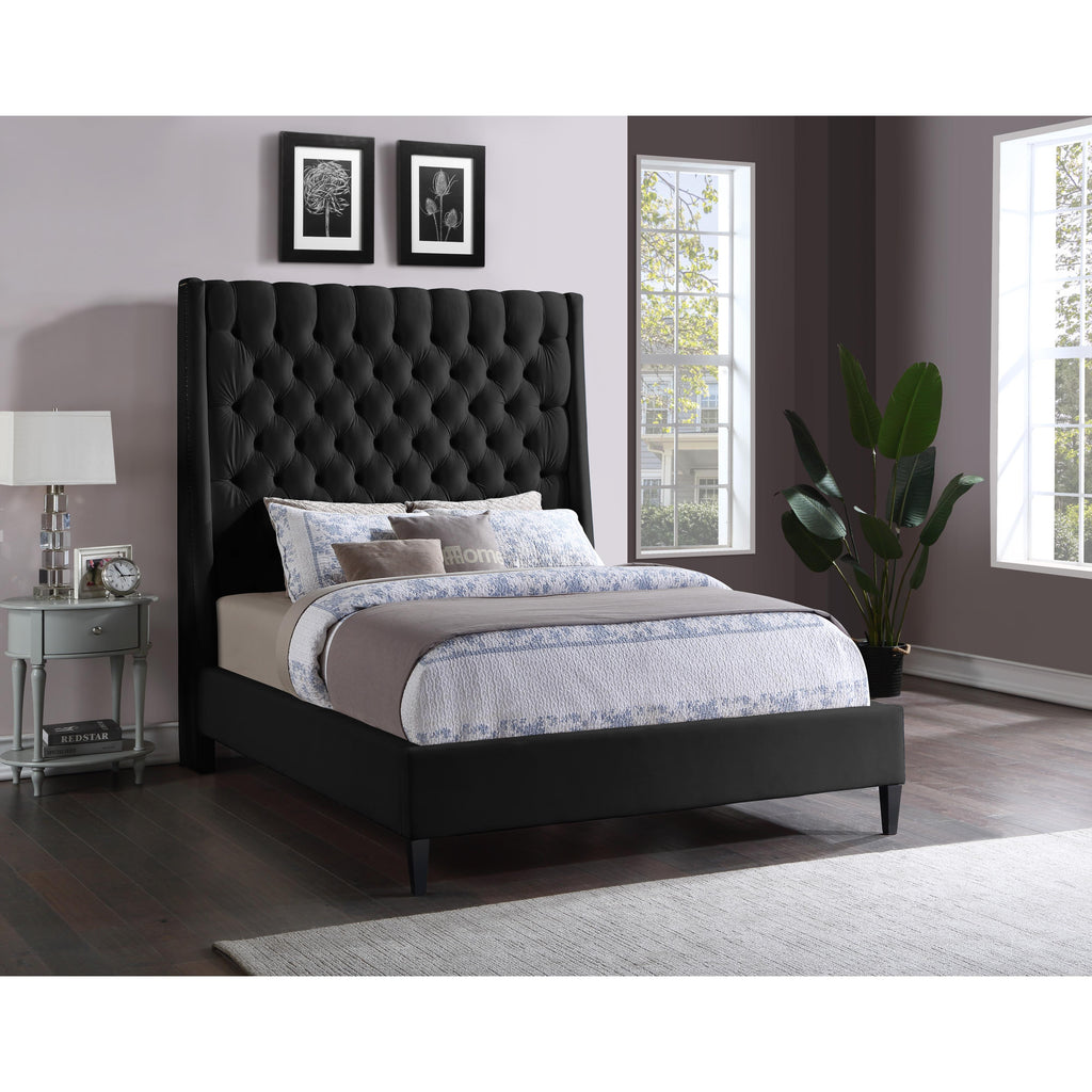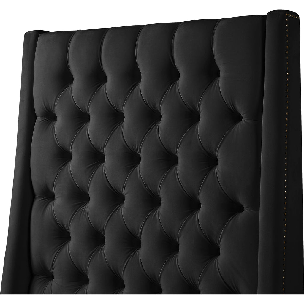 Count on this Fritz velvet bed to bring a modern look to life in your bedroom sanctuary. This lovely bed features soft black velvet upholstery for a sumptuously elegant feel and an upscale look. The extra-tall headboard lends your space an element of drama, and the brass nail-head trim accentuate the sophisticated demeanor of this modern bed. Tufting on the wingback headboard helps keep its padding aloft while adding a textural design that draws the eye.