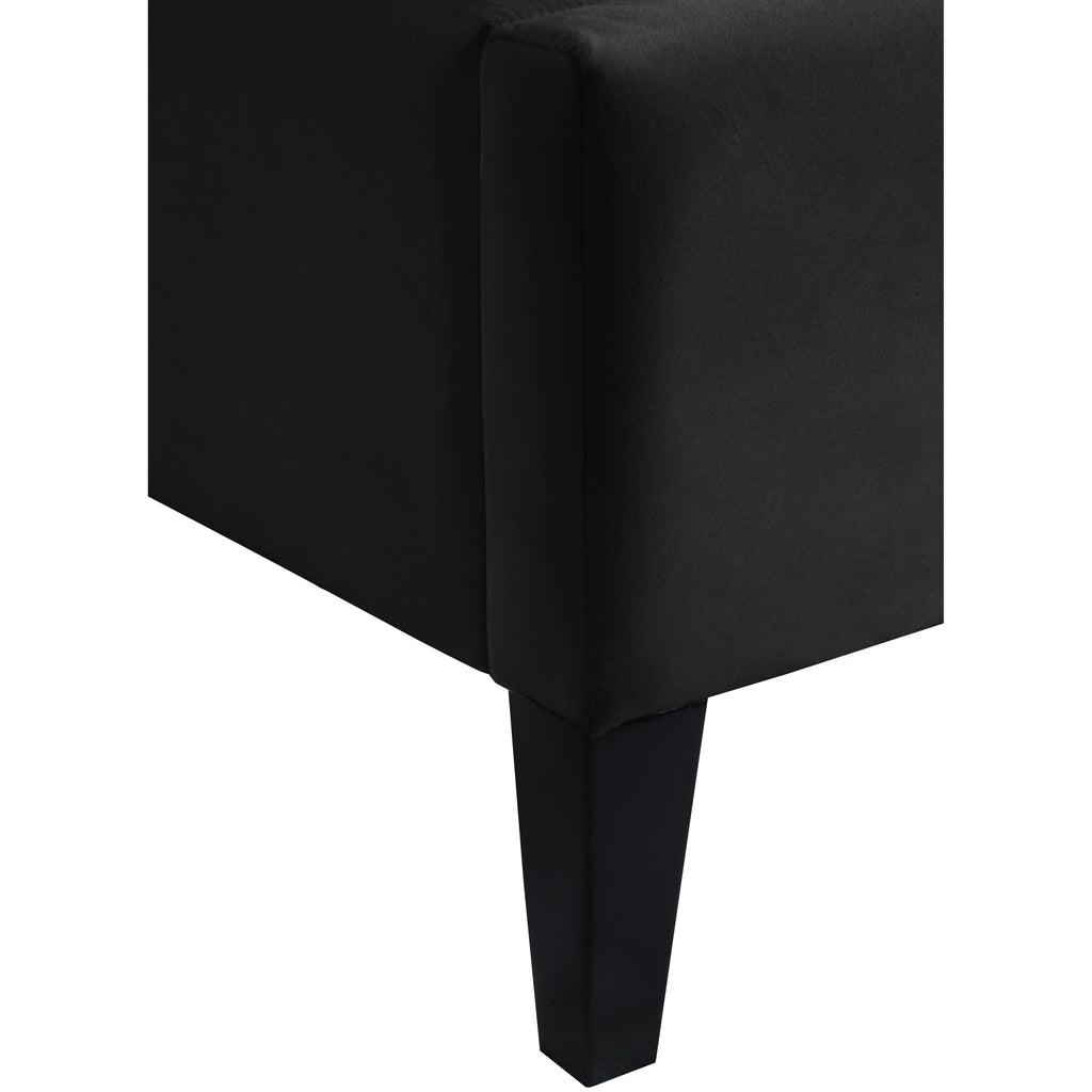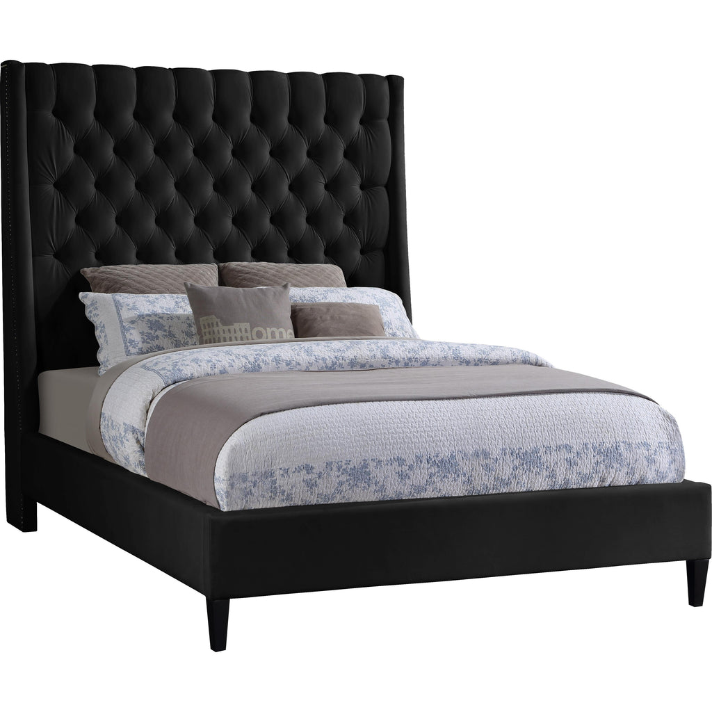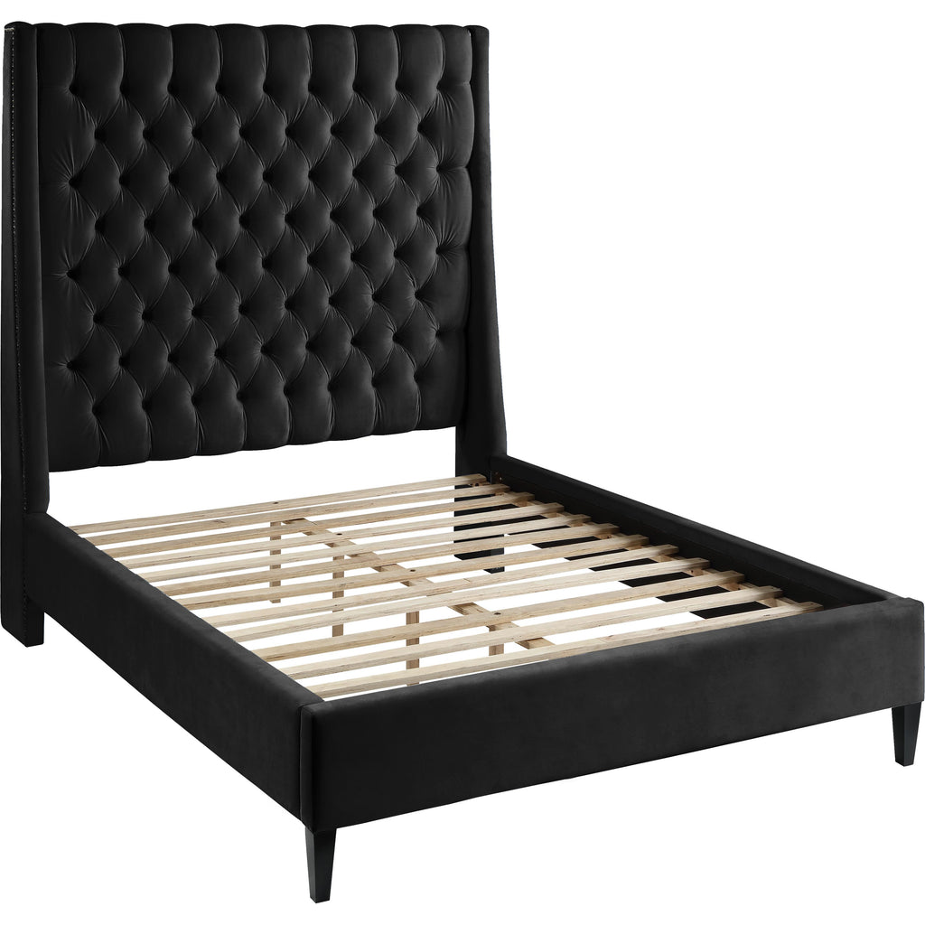 Count on this Fritz velvet bed to bring a modern look to life in your bedroom sanctuary. This lovely bed features soft black velvet upholstery for a sumptuously elegant feel and an upscale look. The extra-tall headboard lends your space an element of drama, and the brass nail-head trim accentuate the sophisticated demeanor of this modern bed. Tufting on the wingback headboard helps keep its padding aloft while adding a textural design that draws the eye.