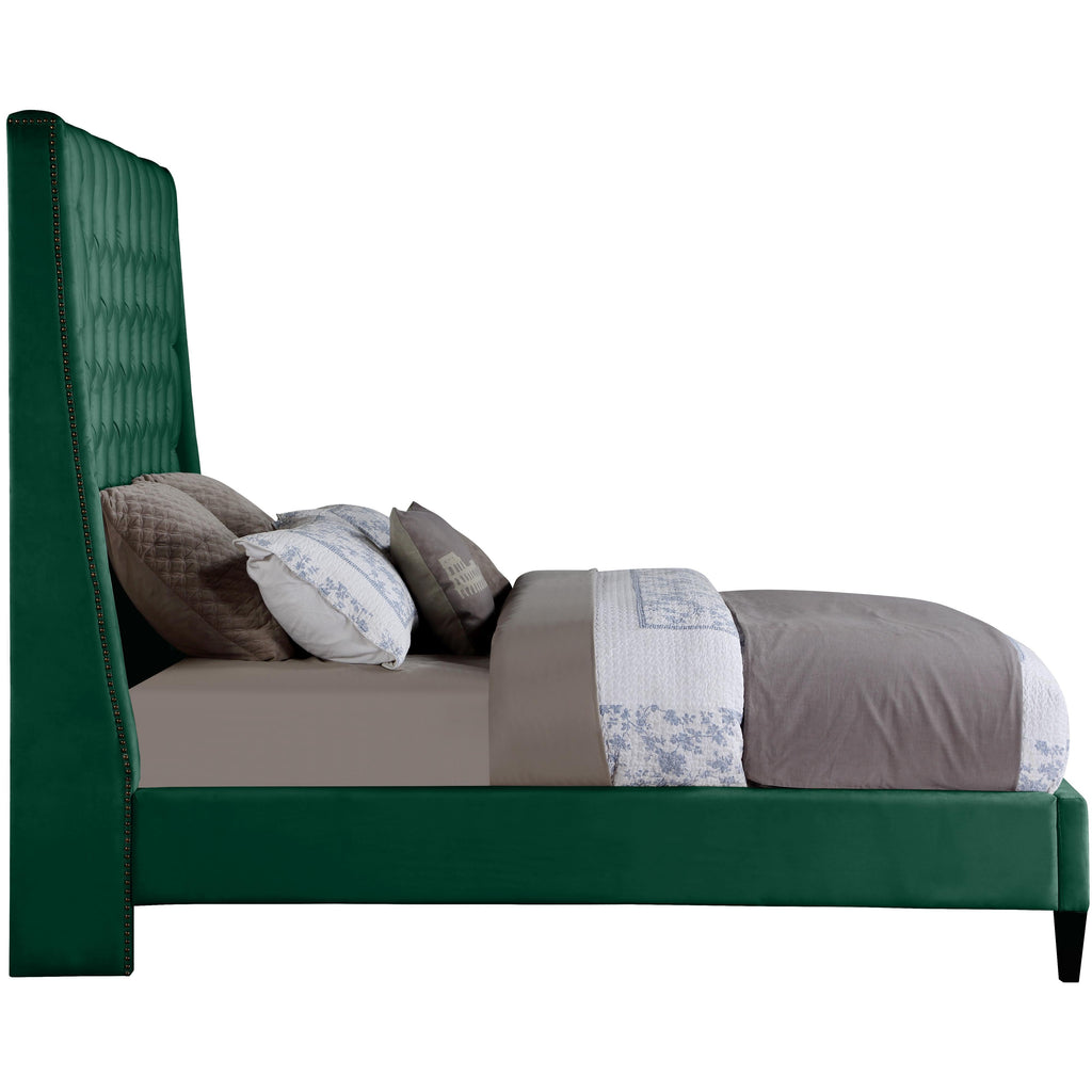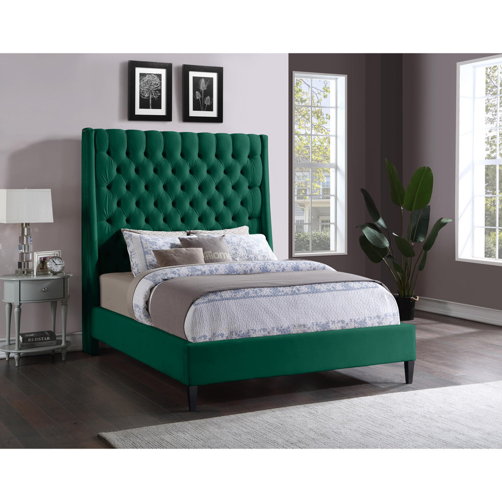 Count on this Fritz velvet bed to bring a modern look to life in your bedroom sanctuary. This lovely bed features soft green velvet upholstery for a sumptuously elegant feel and an upscale look. The extra-tall headboard lends your space an element of drama, and the brass nail-head trim accentuate the sophisticated demeanor of this modern bed. Tufting on the wingback headboard helps keep its padding aloft while adding a textural design that draws the eye.
