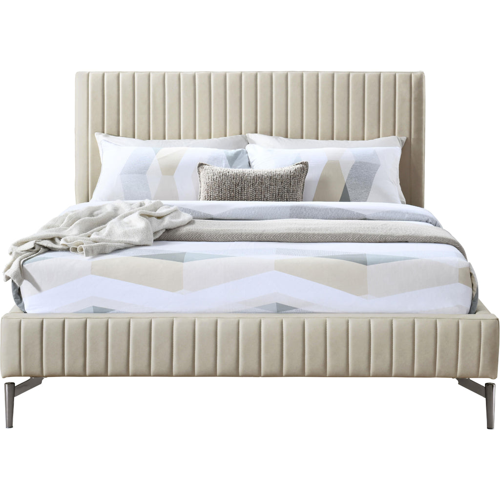 Indulge in the comfort and luxury of the Gallo Vegan Leather Queen Bed, and transform your bedroom into a haven of relaxation. This exquisite piece boasts a luscious premium soft beige vegan leather exterior that exudes elegance and sophistication. Its water-resistant and anti-scratch properties ensure durability and long-lasting beauty. The deep channel tufting adds depth and texture to the overall design, while the sleek black metal legs elevate its character and charm to new heights.