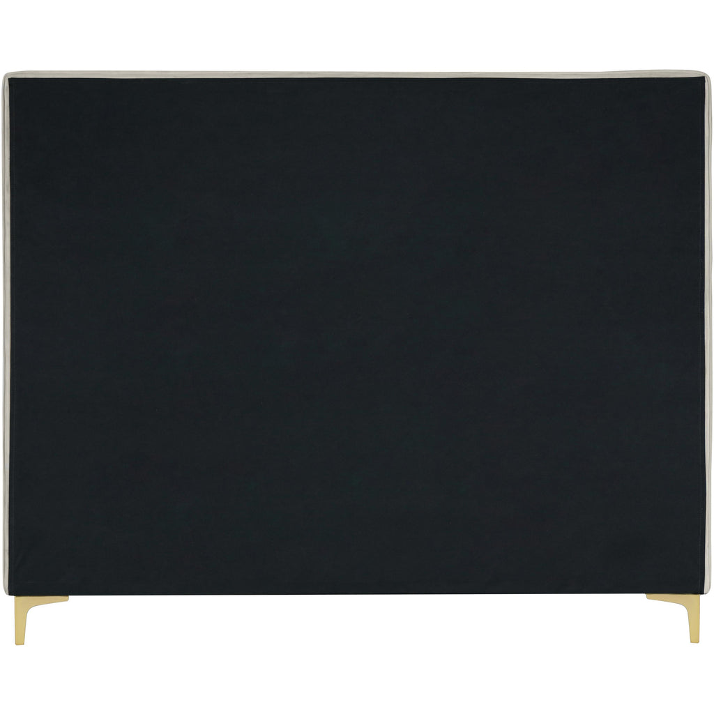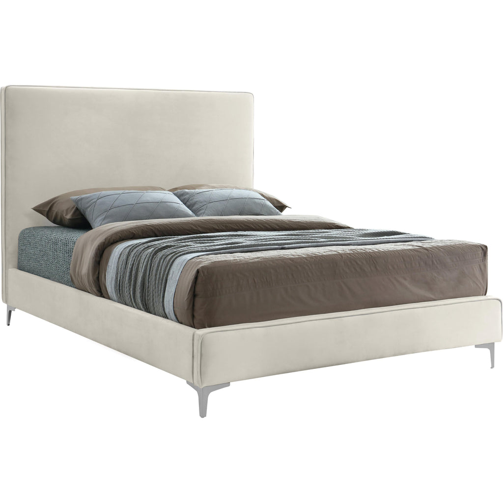 Provide yourself with a few options when you choose the sleek Geri cream velvet queen size bed. The headboard, side rails and footboard are all cushioned and upholstered, with snazzy decorative piping on the headboard and footboard. This bed comes with two different sets of legs so you can match your other decor. Use the gold ones, the chrome ones, or two of each color for a truly contemporary approach.