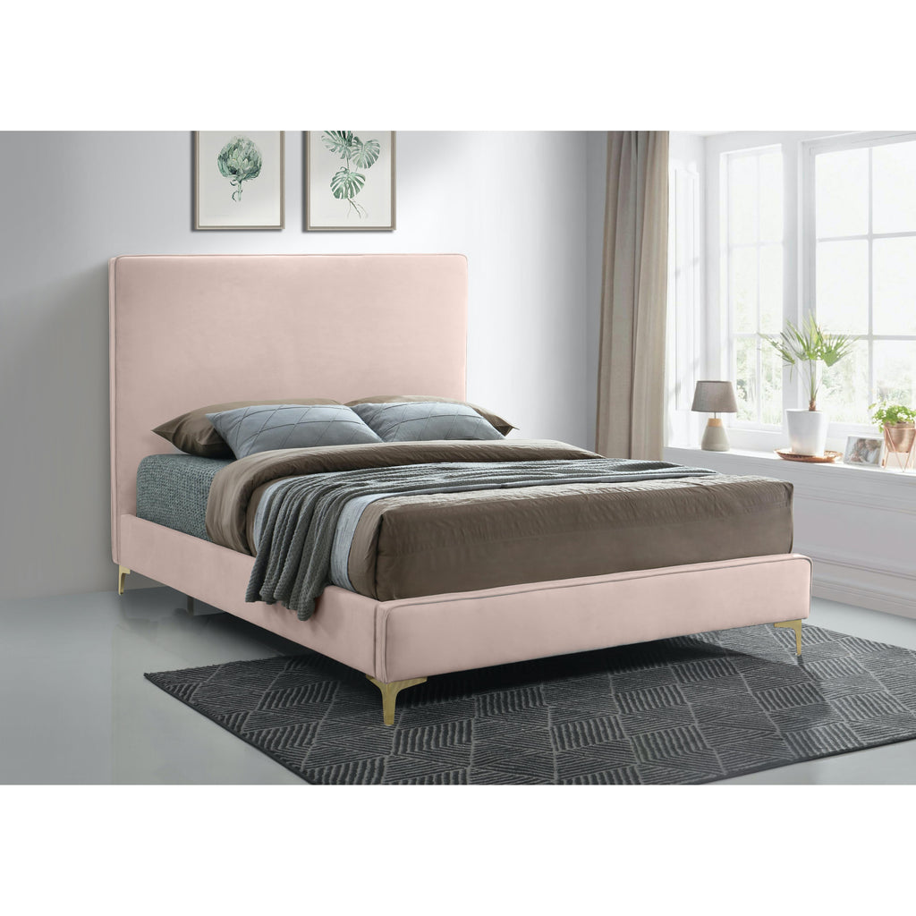 Provide yourself with a few options when you choose the sleek Geri pink velvet queen size bed. The headboard, side rails and footboard are all cushioned and upholstered, with snazzy decorative piping on the headboard and footboard. This bed comes with two different sets of legs so you can match your other decor. Use the gold ones, the chrome ones, or two of each color for a truly contemporary approach.