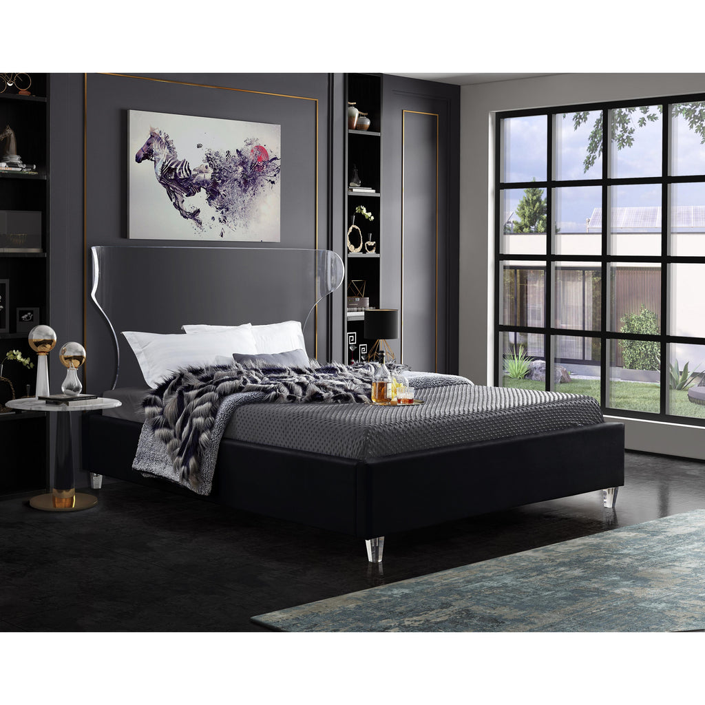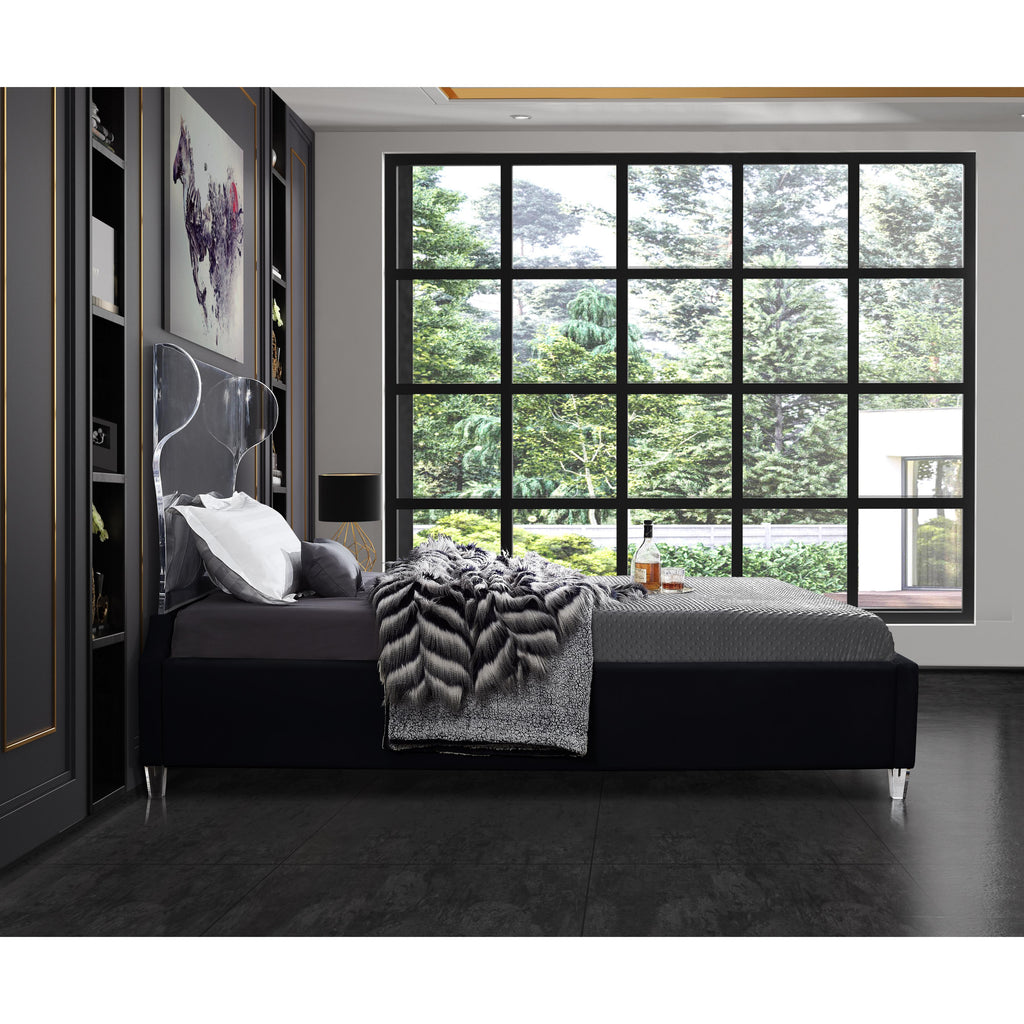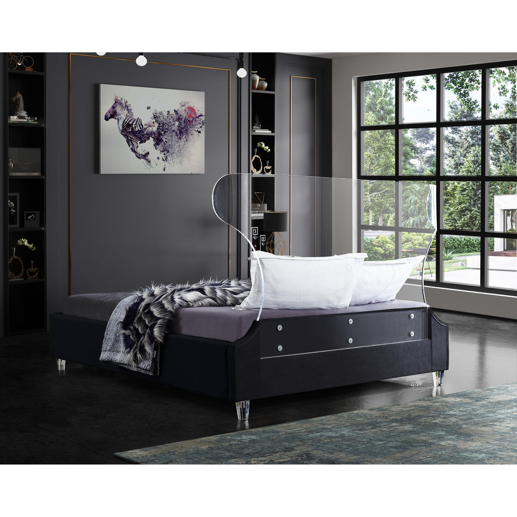 There's nothing scary about the Ghost black velvet queen size bed, with its plush cushioned and upholstered side rails and footboard. A curved transparent acrylic headboard allows you to situate it in front of a window without blocking the view, and matching acrylic legs offer a beautiful contemporary appearance. This bed has a complete set of slats included for your convenience, so you won't need to purchase a box spring.