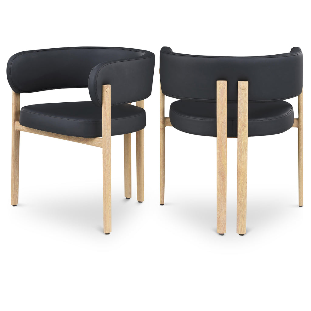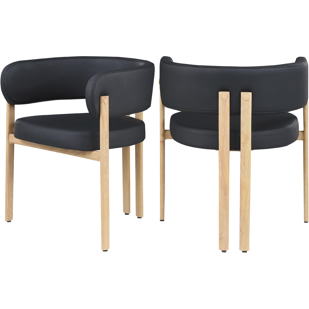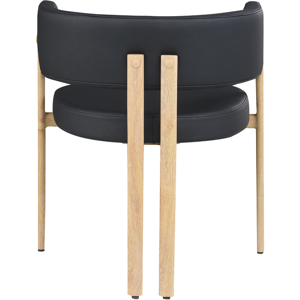 Refresh your dining space with the black Gideon vegan vegan leather dining chairs. This set of two casual dining chairs have black vegan leather upholstered seats and backs for a comfortable feel against your body while you enjoy meals big and small. Rounded backs offer a stylish slant while supporting your back at mealtime. The chairs' frames are made from metal but have a natural wood look for added aesthetic appeal and remarkable sturdiness.