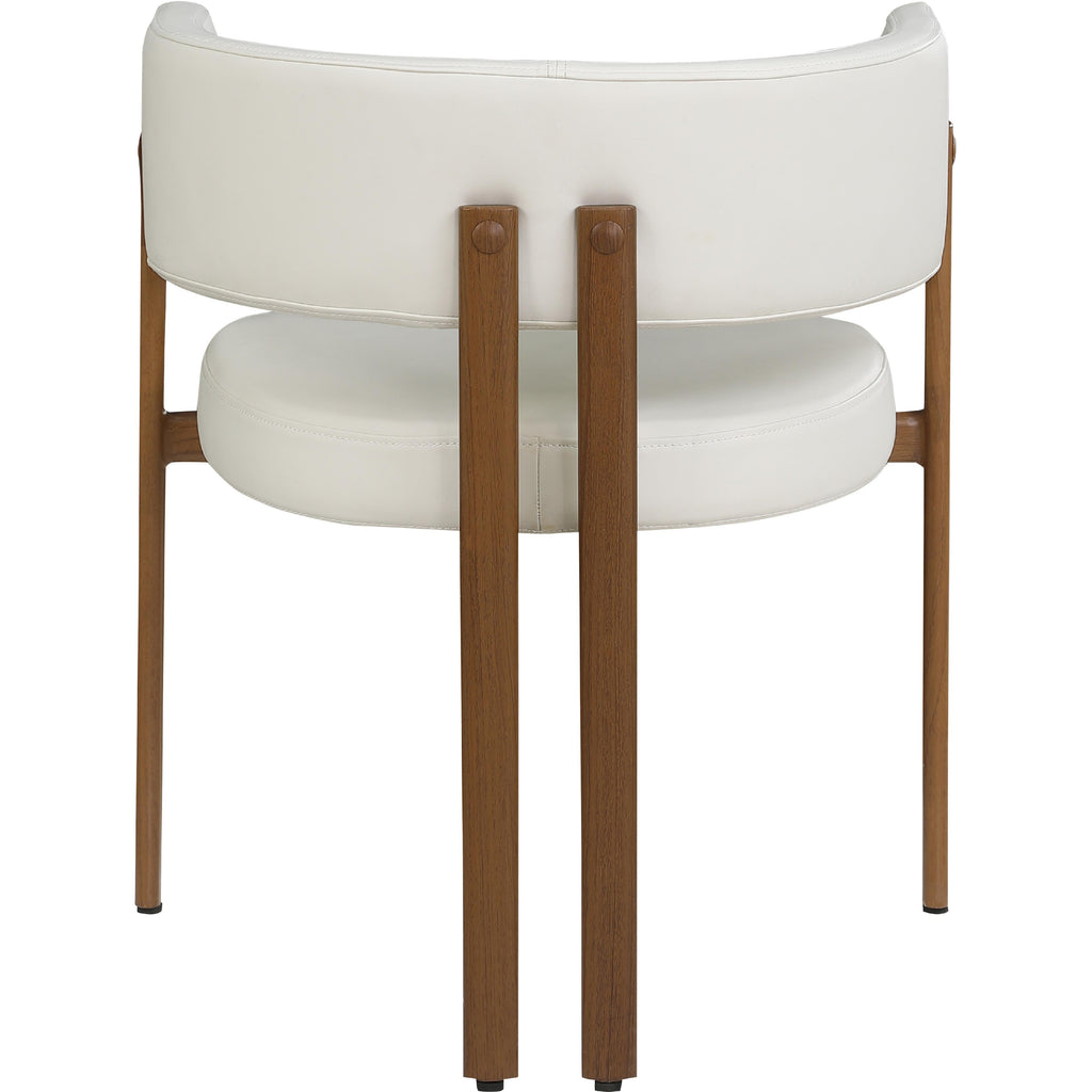 Refresh your dining space with the cream Gideon vegan vegan leather dining chairs. This set of two casual dining chairs have cream vegan leather upholstered seats and backs for a comfortable feel against your body while you enjoy meals big and small. Rounded backs offer a stylish slant while supporting your back at mealtime. The chairs' frames are made from metal but have a natural walnut wood look for added aesthetic appeal and remarkable sturdiness.