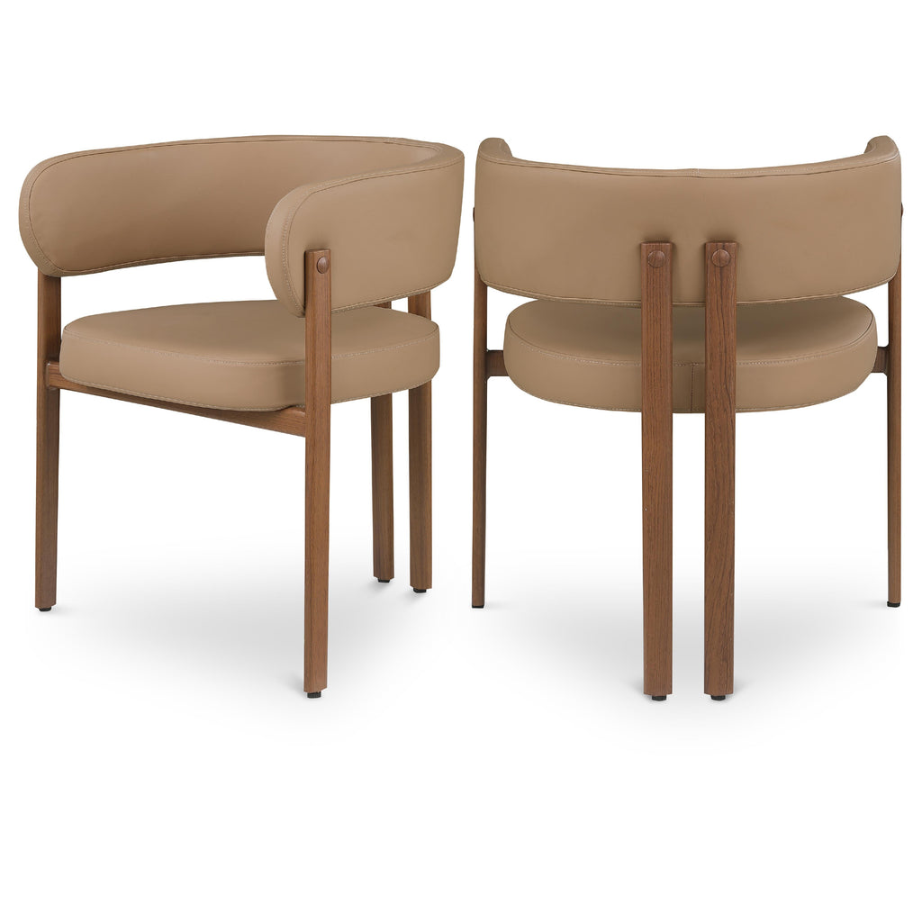 Refresh your dining space with the tan Gideon vegan vegan leather dining chairs. This set of two casual dining chairs have tan vegan leather upholstered seats and backs for a comfortable feel against your body while you enjoy meals big and small. Rounded backs offer a stylish slant while supporting your back at mealtime. The chairs' frames are made from metal but have a natural walnut wood look for added aesthetic appeal and remarkable sturdiness.