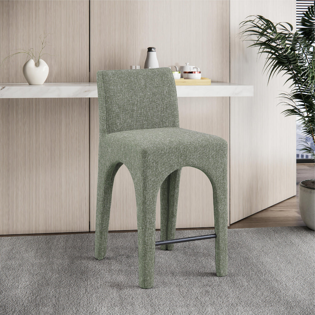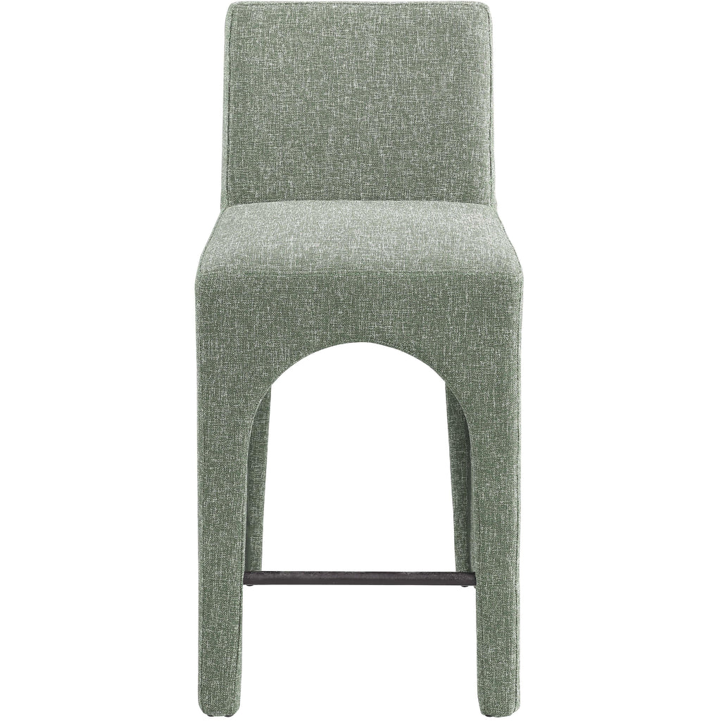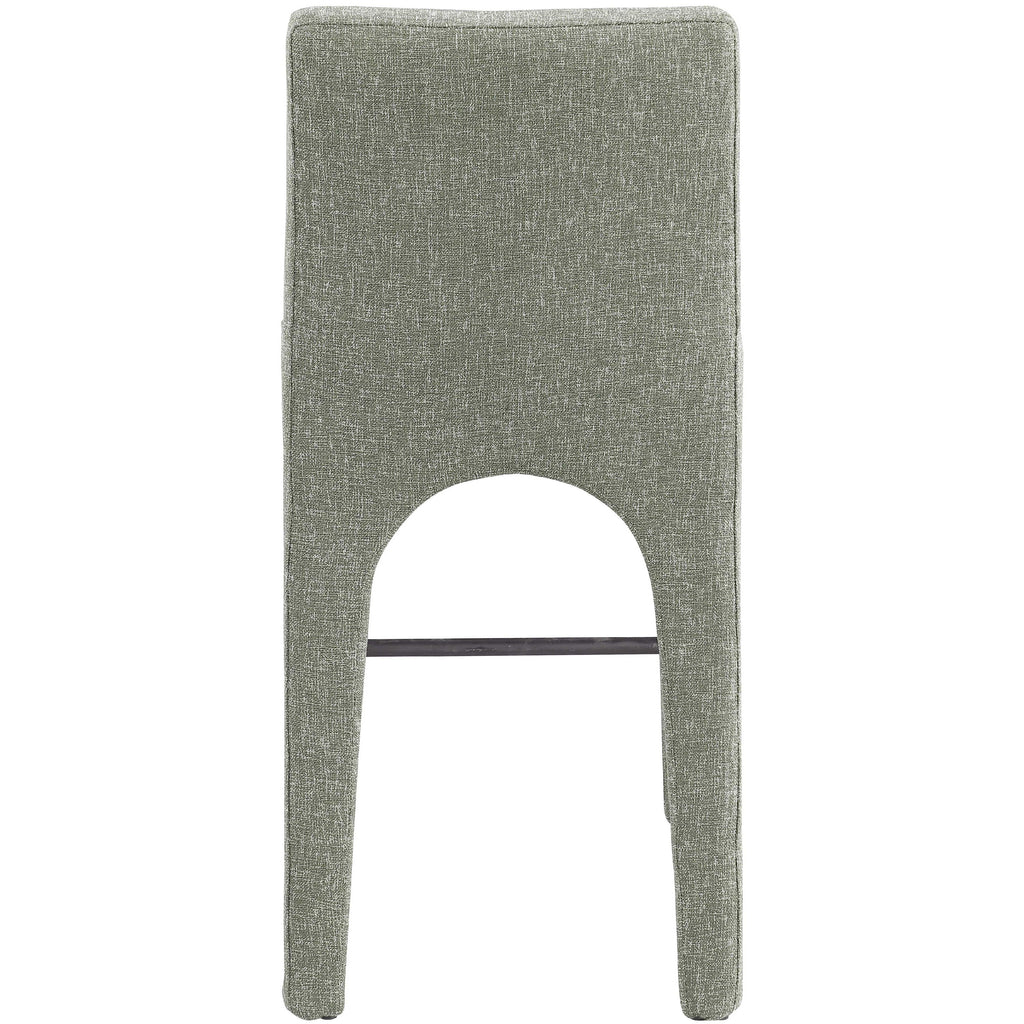 Give your kitchen counter or home bar a makeover with these green Gramercy linen textured fabric bar/counter stools. Rich green linen textured fabric upholstery feels comfortable to the touch, helping ensure that these stools quickly become everyone's favorite seat. The arched iron inner frame complements the pair's art deco look, while the low-back design ensures an inviting seating experience. With a convenient footrail for resting your feet, these stools offer both style and practicality.