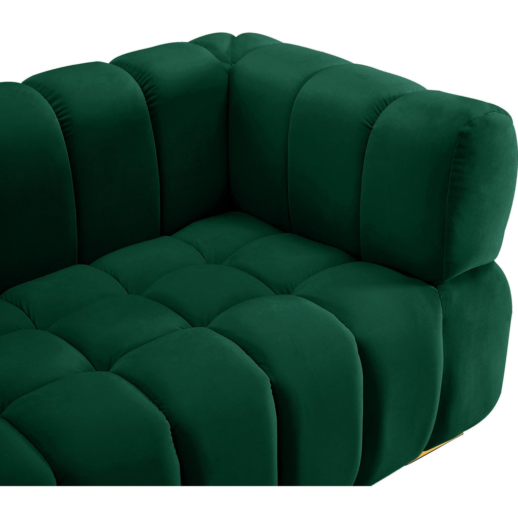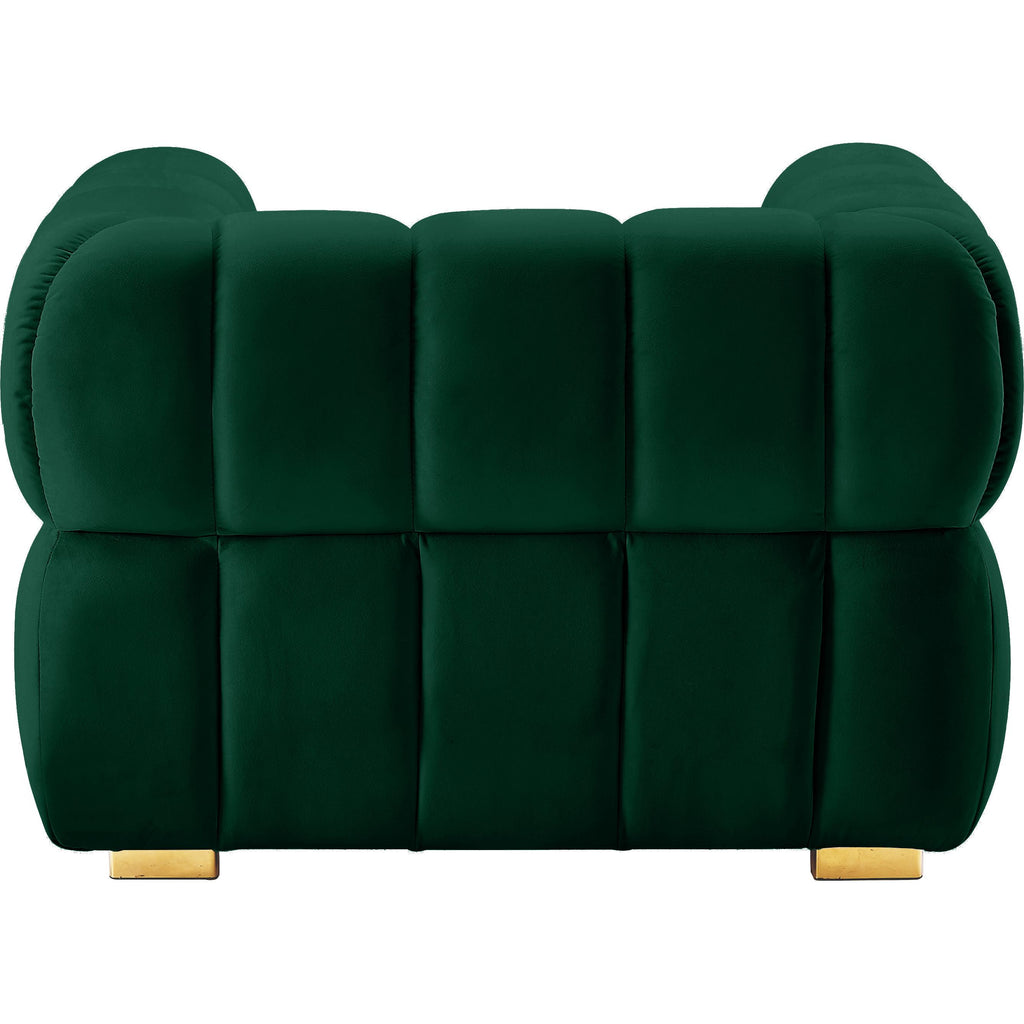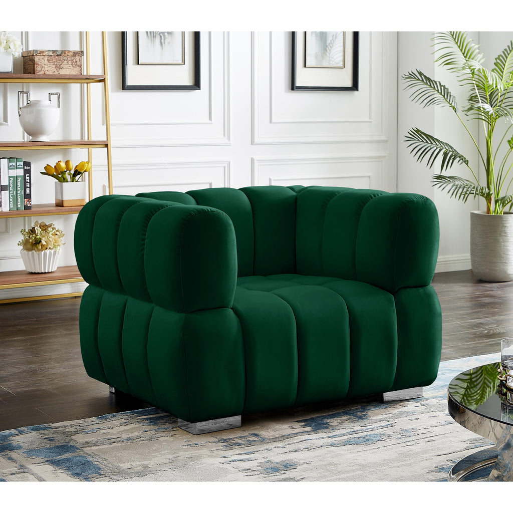 Experience untold comfort blended with impeccable style when you bring home this Gwen velvet chair. Rich green velvet upholstery covers the chair, giving it a sleek feel that meshes well with its heavily padded designthe combination of which beckons you to sit down and take a load off. Deep biscuit tufting adds to the oversized look of this welcoming chair, with tufting also serving to keep the fill inside aloft. Two sets of legs come with the Gwen chair for a custom finish in gold or chrome.
