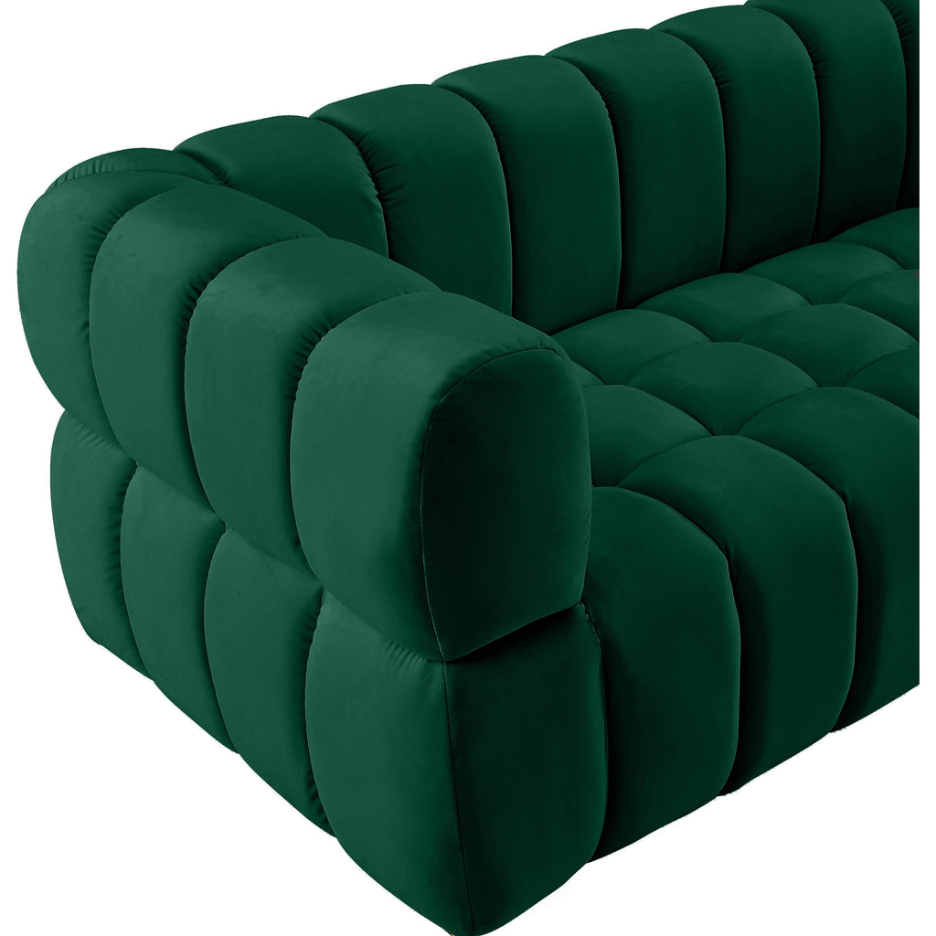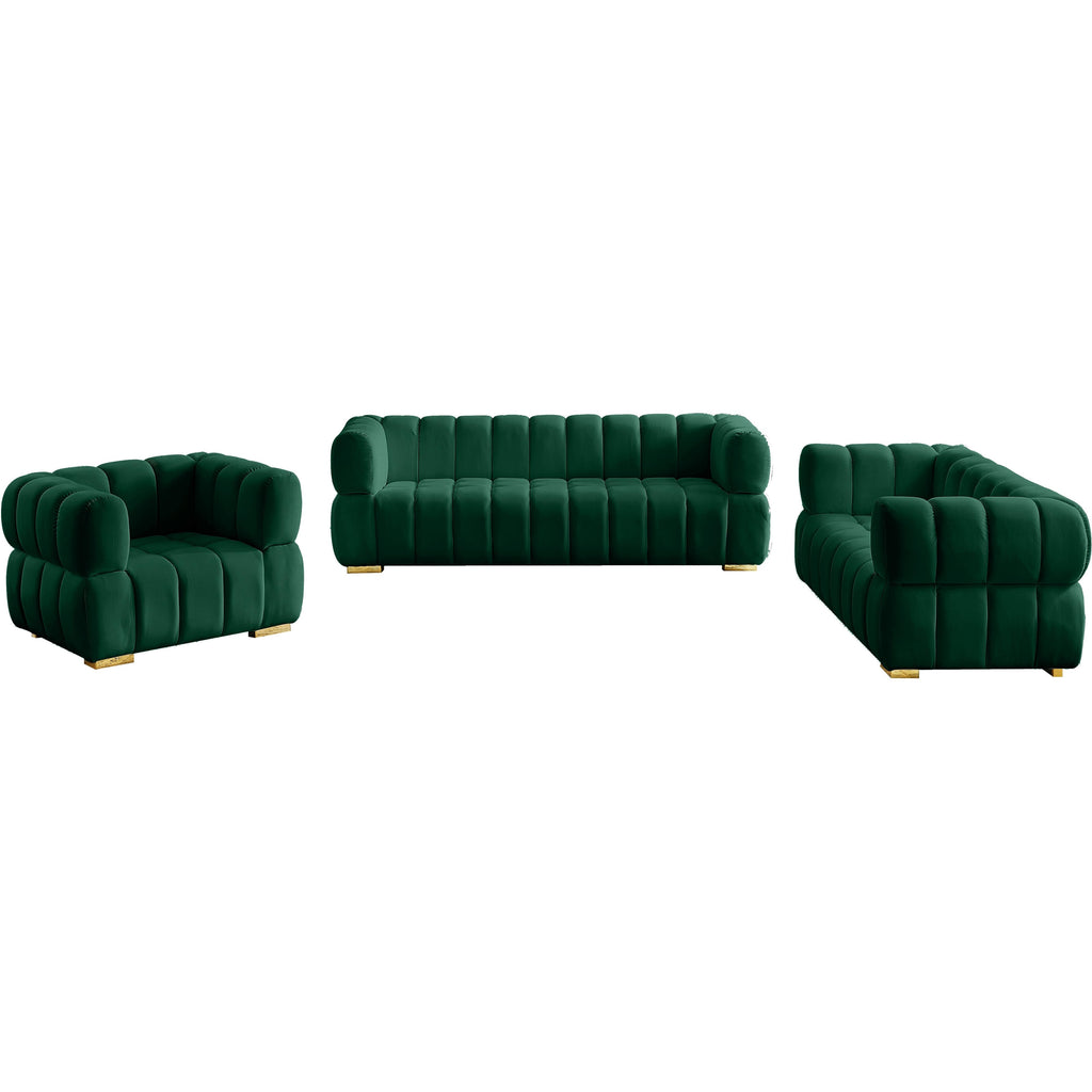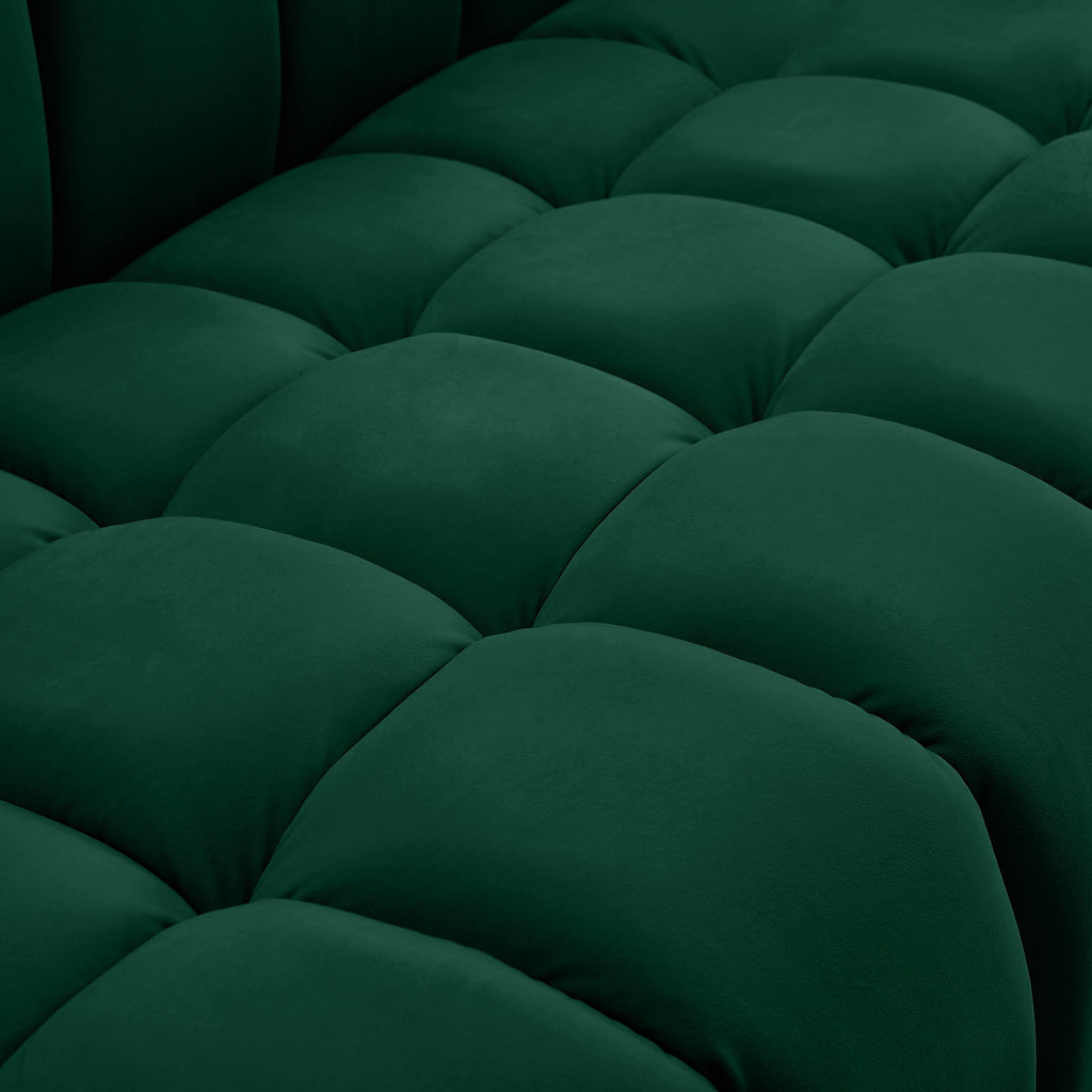 Experience untold comfort blended with impeccable style when you bring home this Gwen velvet chair. Rich green velvet upholstery covers the chair, giving it a sleek feel that meshes well with its heavily padded designthe combination of which beckons you to sit down and take a load off. Deep biscuit tufting adds to the oversized look of this welcoming chair, with tufting also serving to keep the fill inside aloft. Two sets of legs come with the Gwen chair for a custom finish in gold or chrome.
