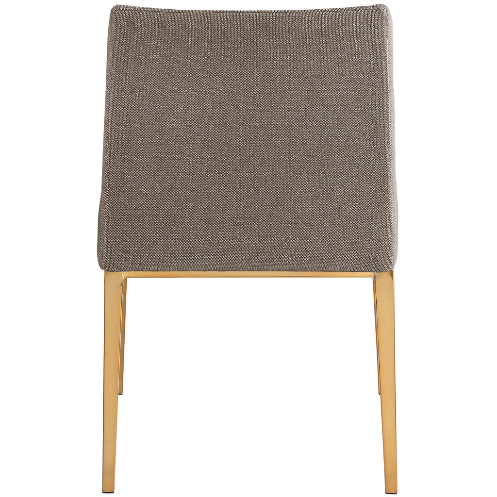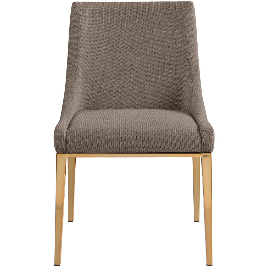 Give your dining room a touch of contemporary charm with this Haines polyester fabric dining chair. Exuding beautiful refinement and elegance from all angles, this chair gives your dining room an instant makeover. soft brown polyester fabric covers every square inch of the back and seat, giving the chair a luxurious feel against the skin while making maintenance a breeze. Brushed gold legs on the chairs' metal frames add an elegant finish to the design.