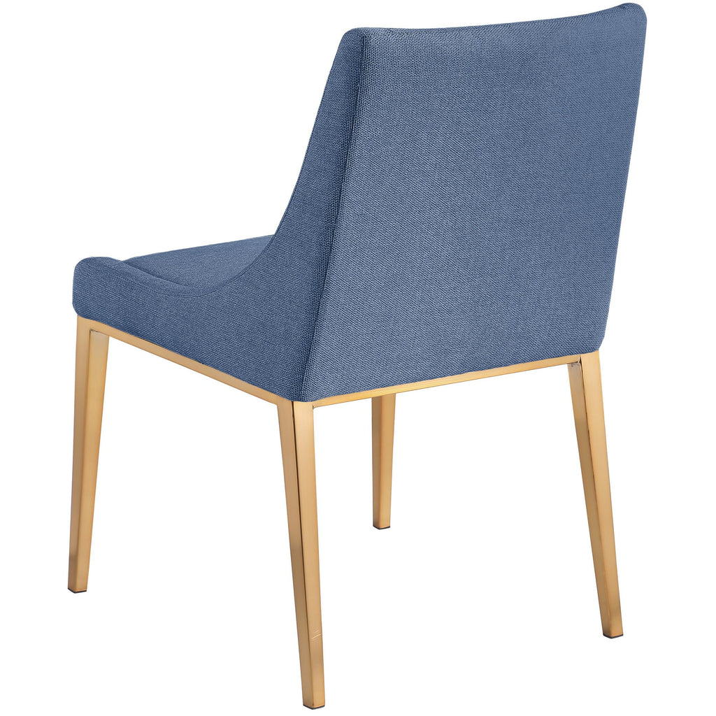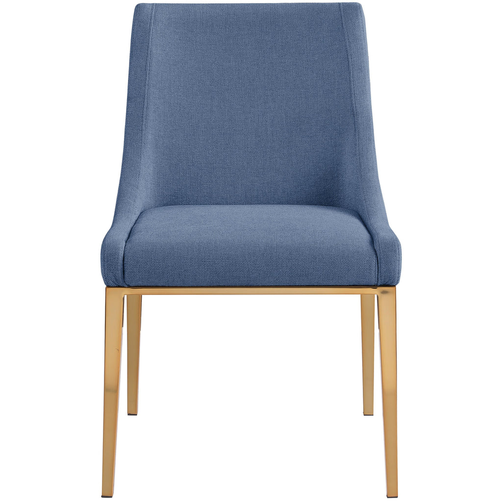 Give your dining room a touch of contemporary charm with this Haines polyester fabric dining chair. Exuding beautiful refinement and elegance from all angles, this chair gives your dining room an instant makeover. Soft navy polyester fabric covers every square inch of the back and seat, giving the chair a luxurious feel against the skin while making maintenance a breeze. Brushed gold legs on the chairs' metal frames add an elegant finish to the design.