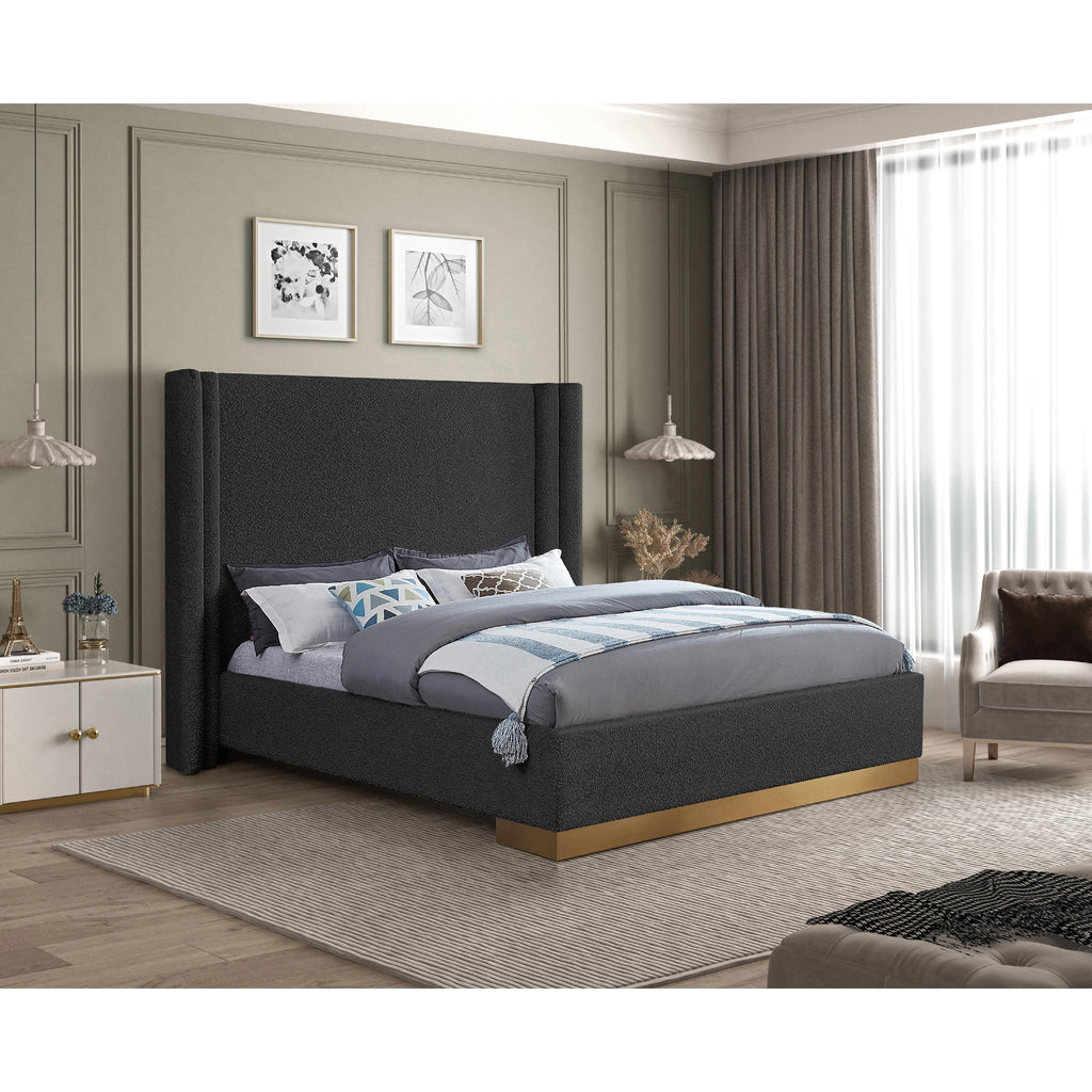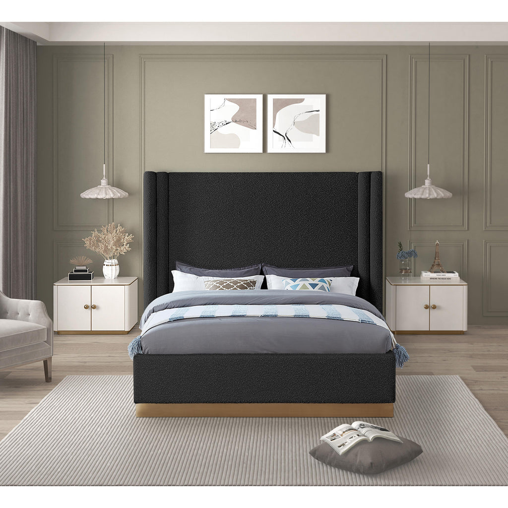 Settle in like royalty each night when you make this Halton boucle fabric bed yours. This eye-grabbing bed is destined to become the centerpiece of your bedroom sanctuary with its rich black boucle fabric upholstery covering every square inch of its super-tall headboard and sides. This bed features a sturdy frame, so you can count on it weathering the sands of time and being a beautiful part of your bedroom for years to come.