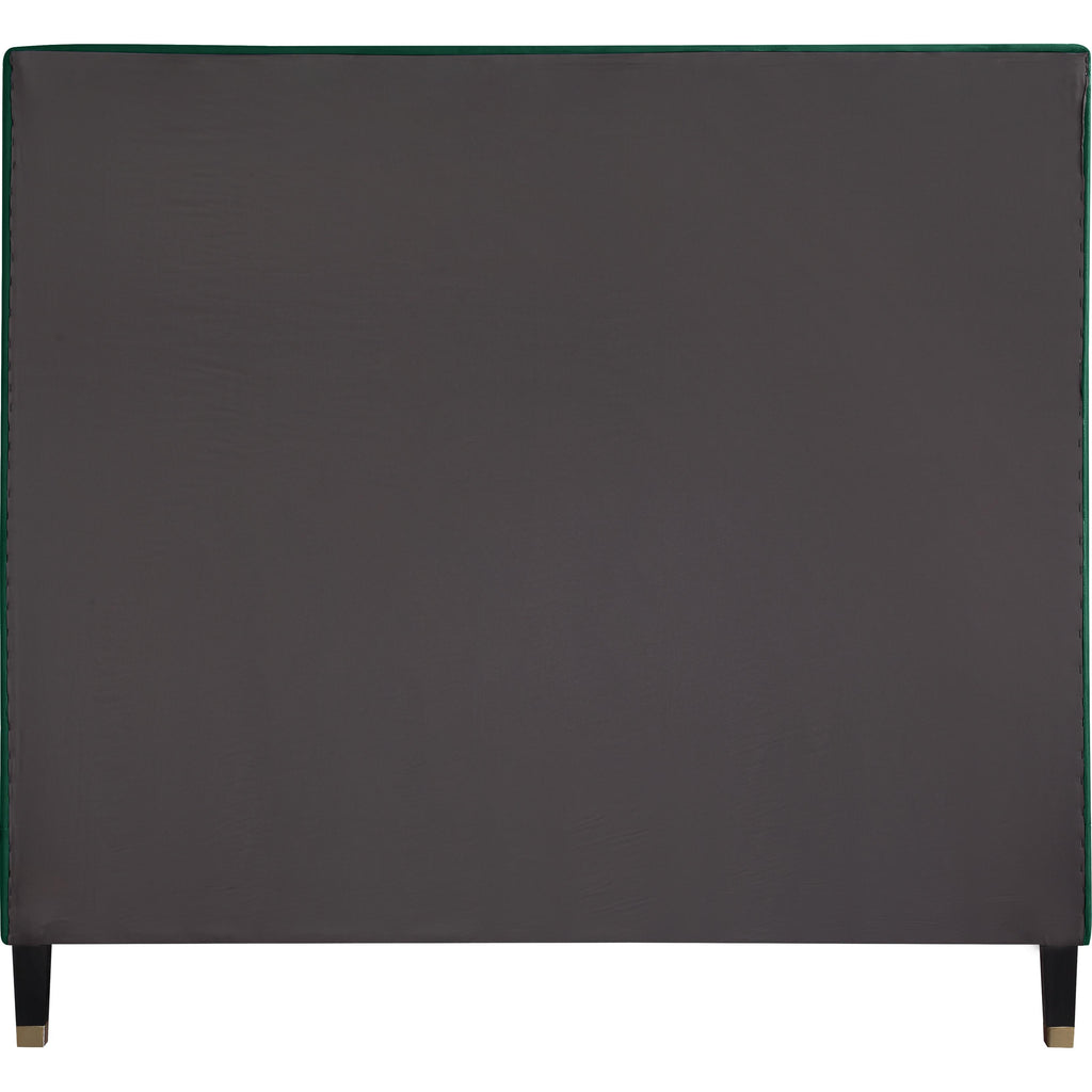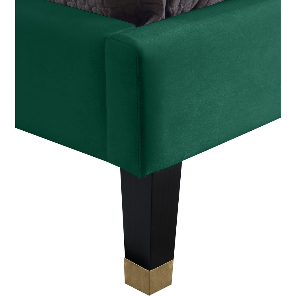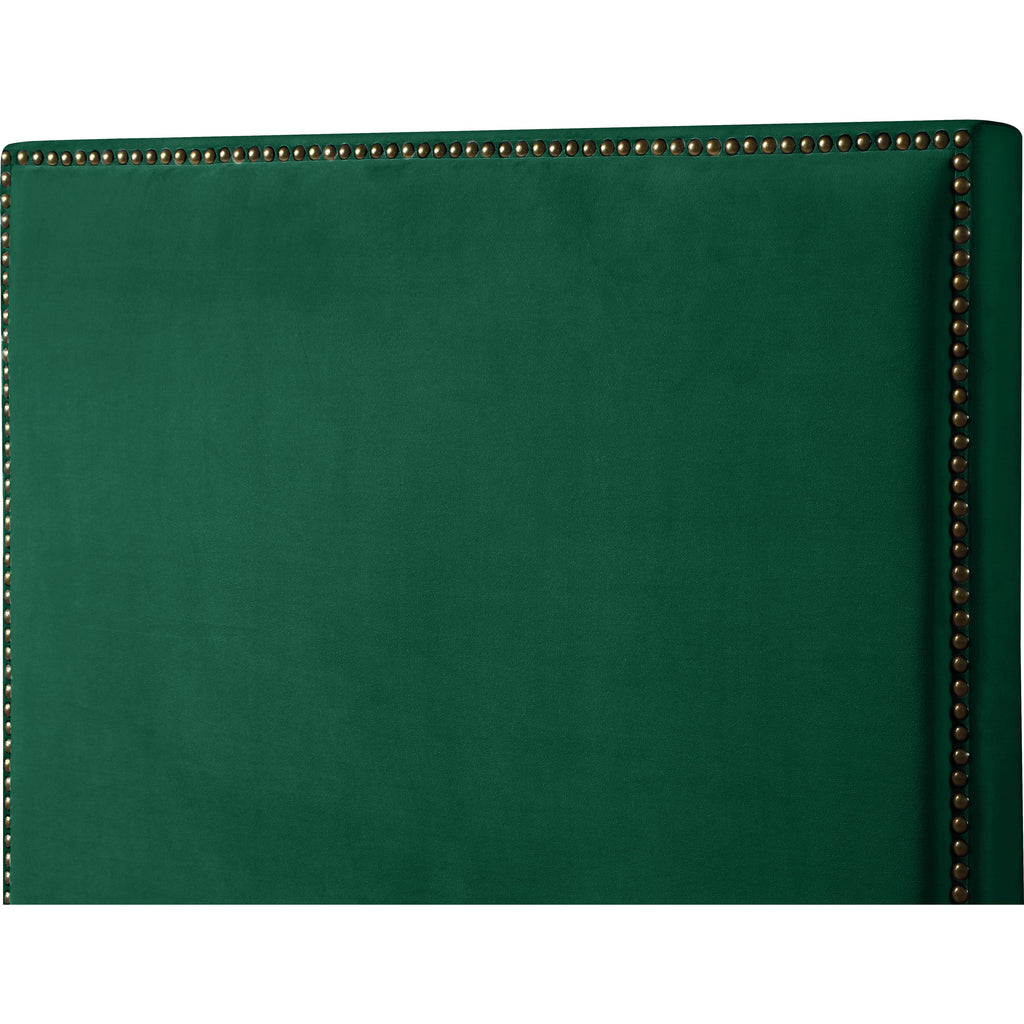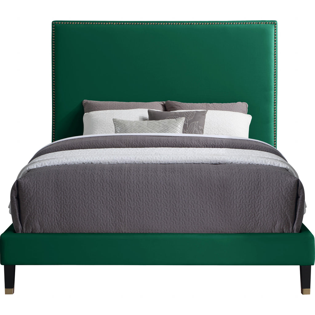 Give your room an instant boost of drama and style when you add this Harlie bed to the mix. This queen-size bed features a soft green velvet exterior that's both chic and sleekand just the thing to add modern beauty to your decor. Brass nailheads lend this magnificently crafted bed an elegant vibe, while brass caps on the leg amplify its sophisticated demeanor. An extra-tall design makes sure this Harlie bed gets the bulk of attention in your bedroom.
