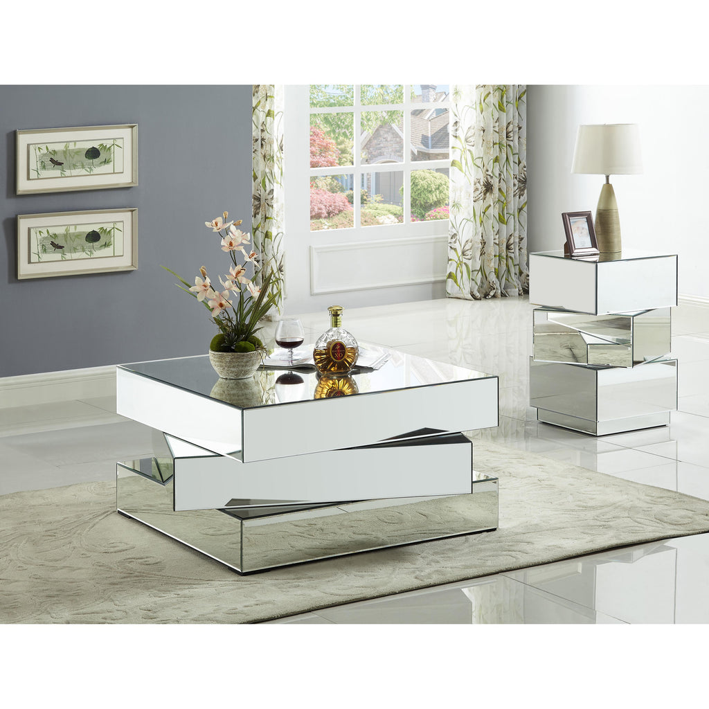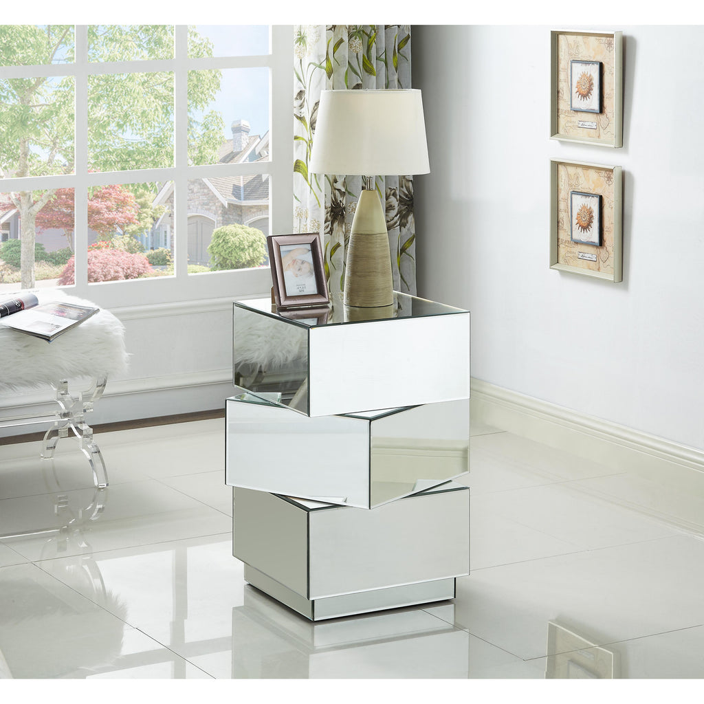 Bring home this Haven end table to add a distinctly modern look to your living room or den. This eye-grabbing end table from Meridian Furniture features a triple-stacked platform design in a square shape for a geometric look that's more like a piece of fine sculpture than the true utilitarian item it truly is. The surfaces of the table are mirrored, adding a light, airy touch to your space and giving it a beautiful aesthetic in contemporary decor.