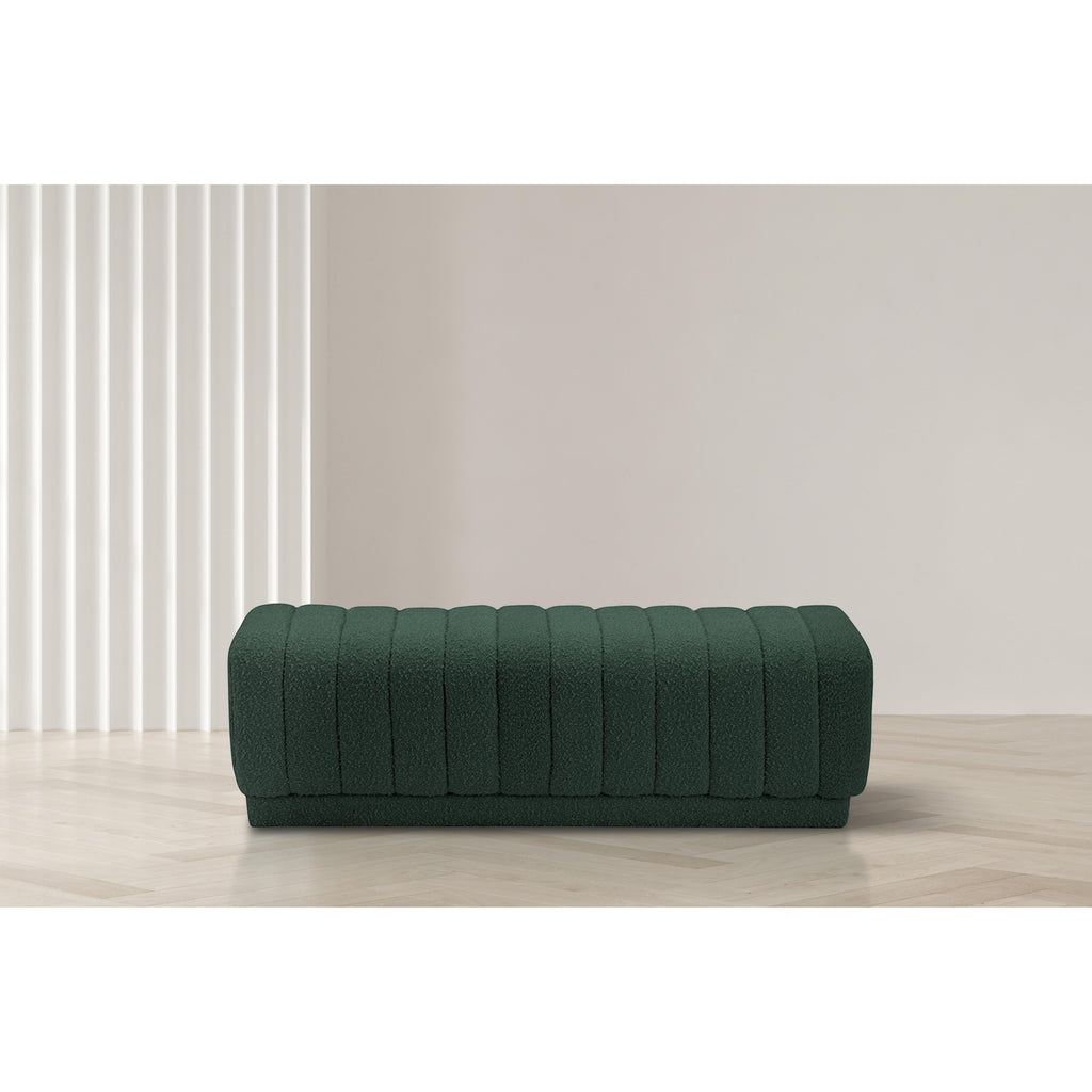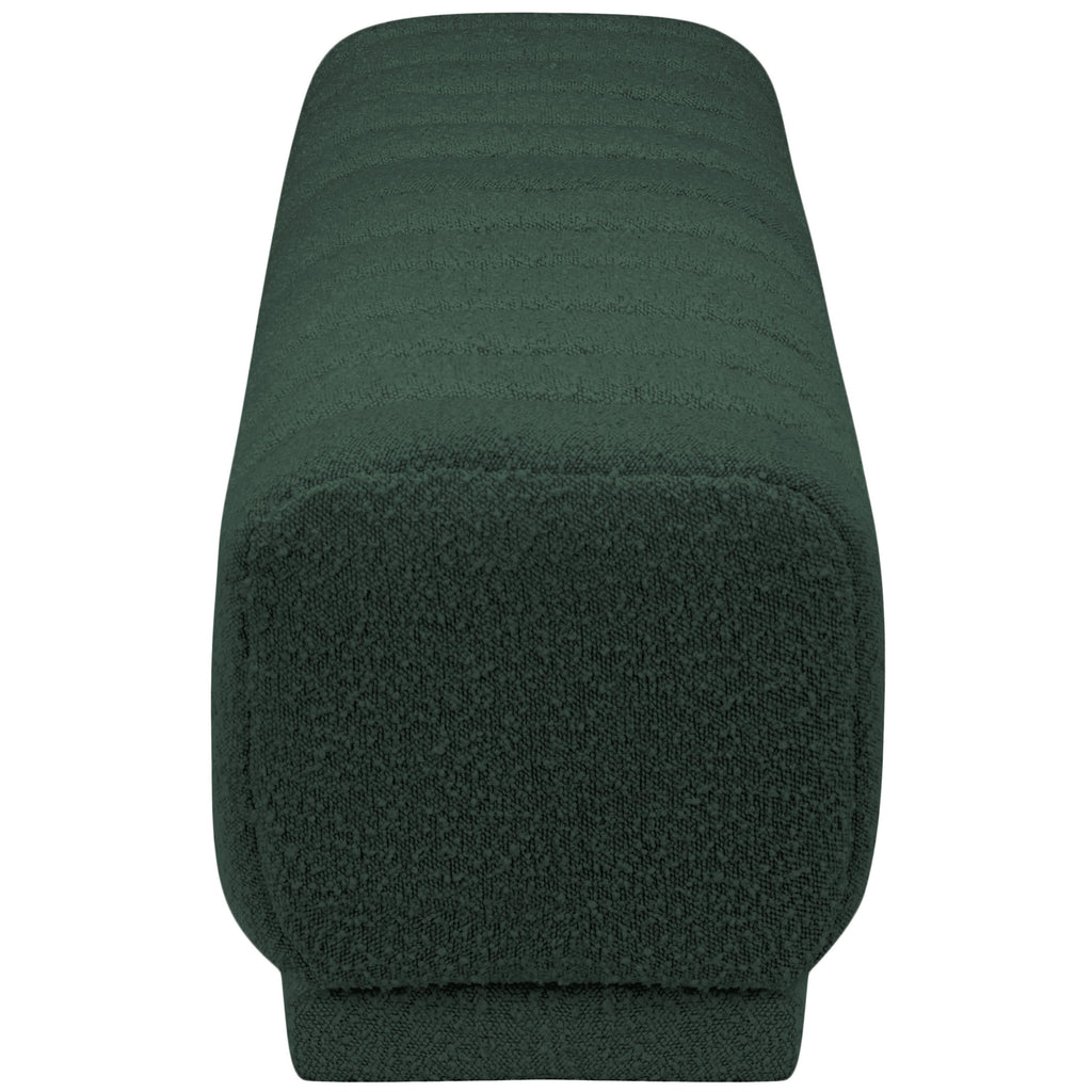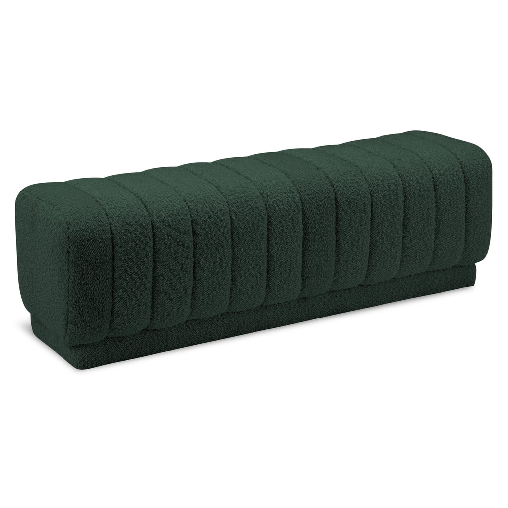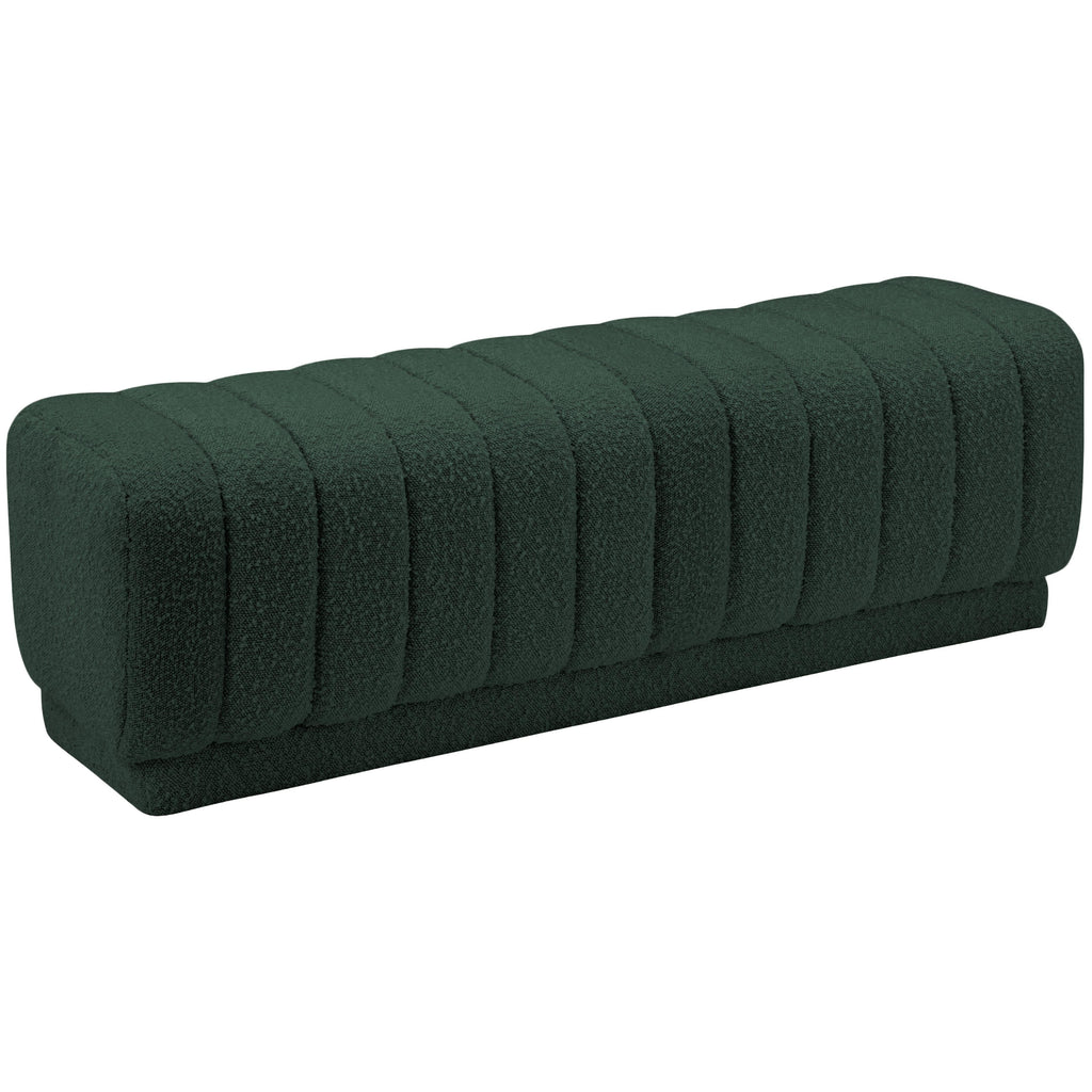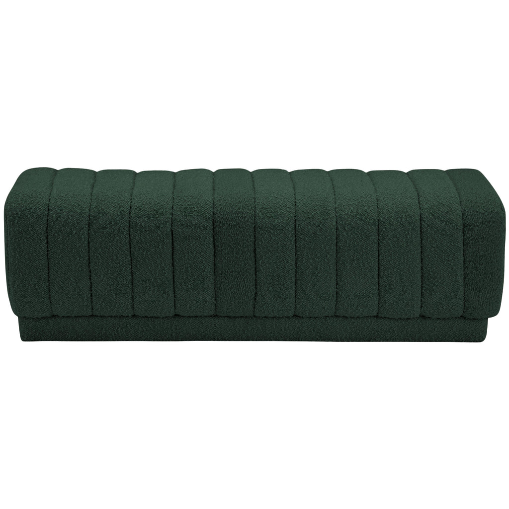 Place this lovely Heathrow ottoman at the foot of your bed or elsewhere to provide impromptu seating when you need it most. This elegant ottoman features rich green boucle fabric covering every inch of its exterior, so its soft and welcoming to the touch. Deep channel tufting gives the ottoman texture while adding to its overall durability and longevity. This ottoman/bench is a wonderful addition to nearly any space.