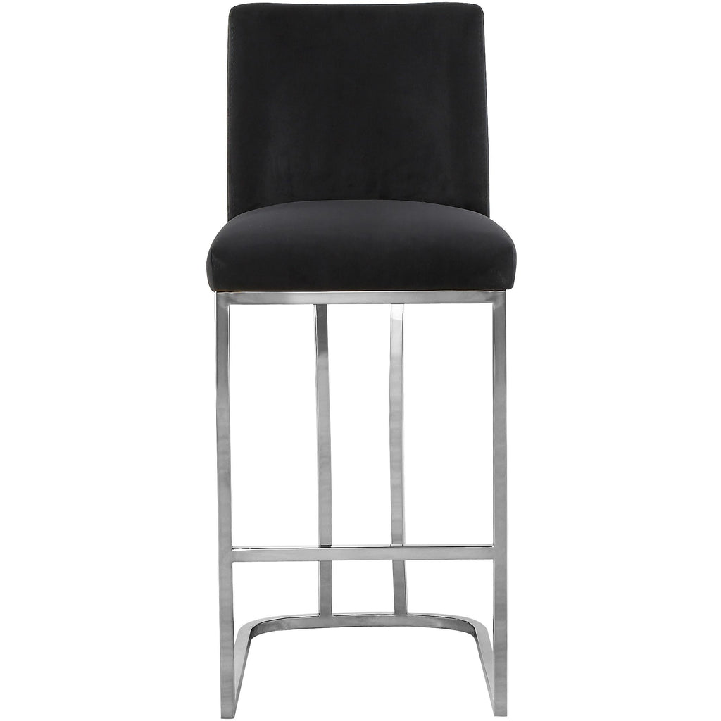 Make sure guests stay comfortable as they wine and dine from this Heidi Black Velvet Stool. This stool has a sleek metal base finished in chrome for a chic look and is upholstered in sumptuous black velvet for a touch of glam. The upholstery is top quality and has a sleek, velvety feel against the skin for a refined and elegant presentation. The armless design facilitates conversation, and a footrail on the bottom gives you a spot to rest your feet while you dine.