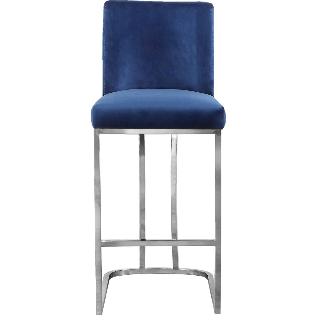 Make sure guests stay comfortable as they wine and dine from this Heidi Grey Velvet Stool. This stool has a sleek metal base finished in chrome for a chic look and is upholstered in sumptuous grey velvet for a touch of glam. The upholstery is top quality and has a sleek, velvety feel against the skin for a refined and elegant presentation. The armless design facilitates conversation, and a footrail on the bottom gives you a spot to rest your feet while you dine.