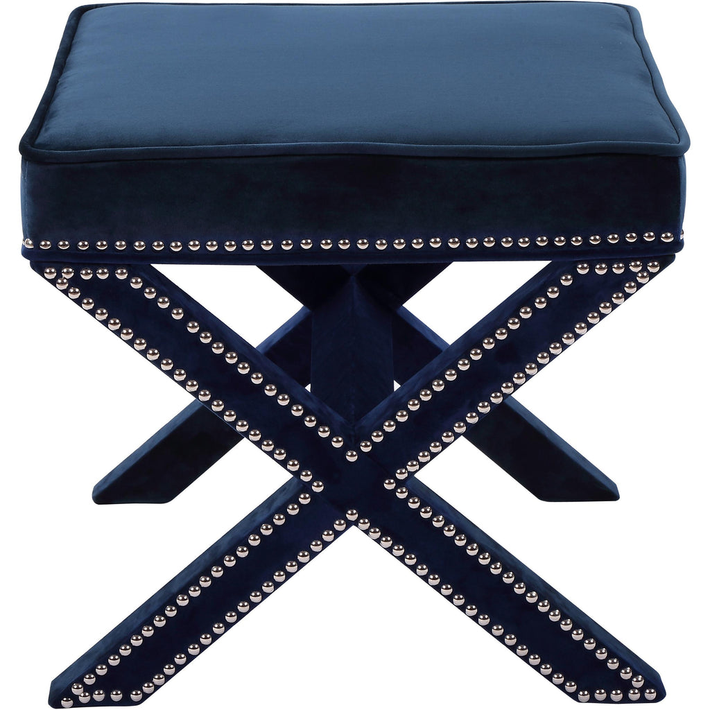 You'll be sitting pretty on this Nixon navy velvet ottoman/bench. This beautiful piece has a stunning look with its navy velvet upholstery and chrome nail head trim that gives your room a decidedly contemporary vibe. The X-shaped legs are sturdy and stout, making it a beautifully durable addition to your space. The ottoman's large top accommodates your feet while you relax and unwind with a good book, or pull it out on game night for an extra seat.