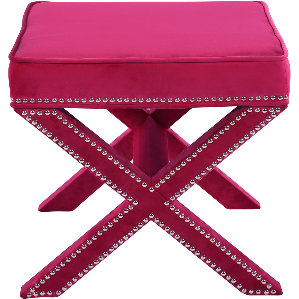 You'll be sitting pretty on this Nixon pink velvet ottoman/bench. This beautiful piece has a stunning look with its pink velvet upholstery and chrome nail head trim that gives your room a decidedly contemporary vibe. The X-shaped legs are sturdy and stout, making it a beautifully durable addition to your space. The ottoman's large top accommodates your feet while you relax and unwind with a good book, or pull it out on game night for an extra seat.
