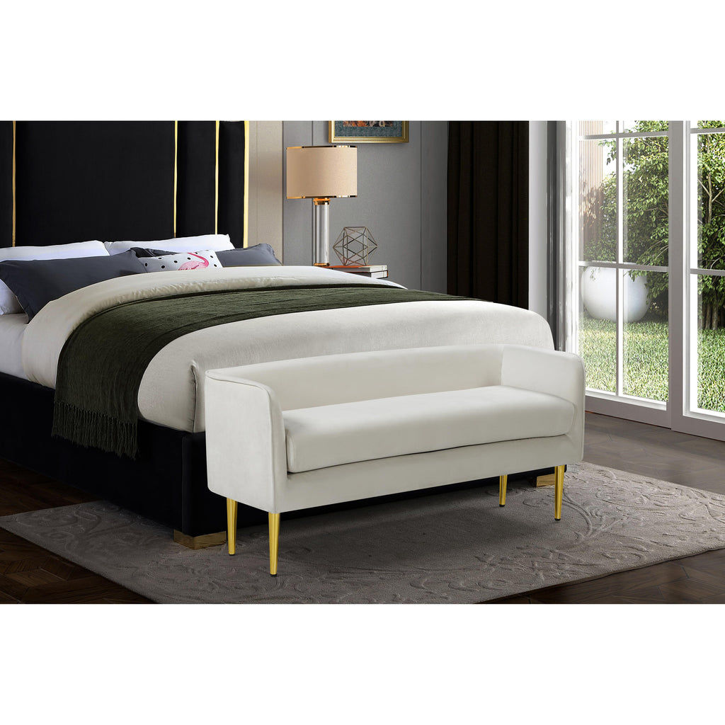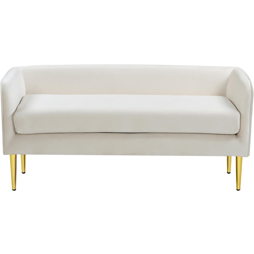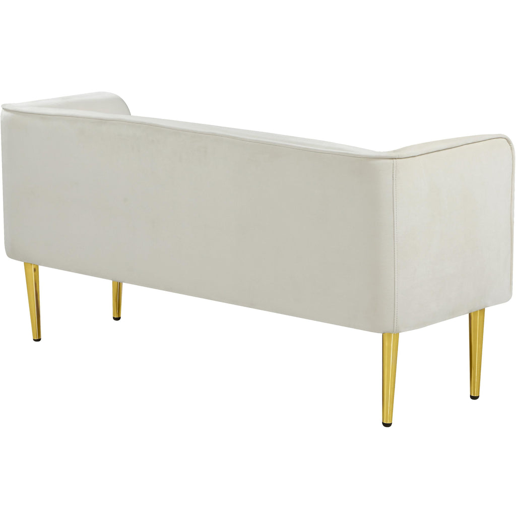 Sit or recline in exquisite comfort on this Audrey bench from Meridian Furniture. The cream velvet is smooth and soothing to touch, perfect for relaxing after a long day of activities. Underneath the bench are four golden legs for sturdy support with caps on each leg to protect your floors. The contemporary design suits modern households while the 20-pound weight makes it easy to move around as needed. Sit the bench in the living room for extra seating or by the front door for putting on shoes.