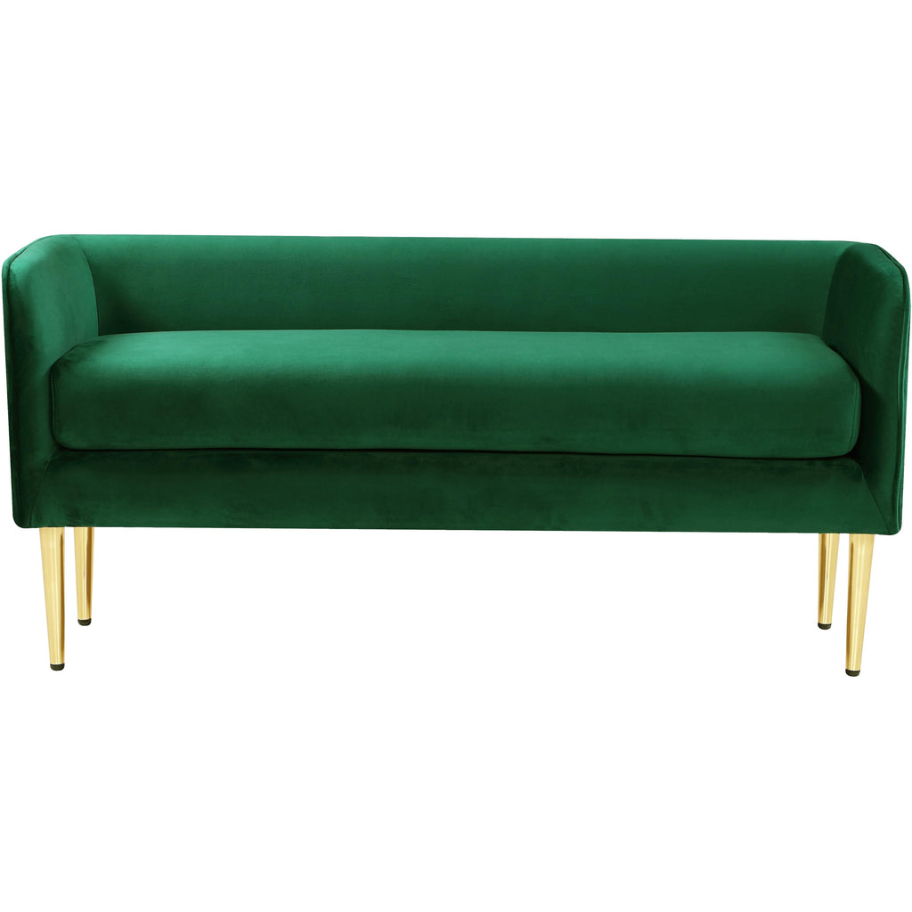 Sit or recline in exquisite comfort on this Audrey bench from Meridian Furniture. The green velvet is smooth and soothing to touch, perfect for relaxing after a long day of activities. Underneath the bench are four golden legs for sturdy support with caps on each leg to protect your floors. The contemporary design suits modern households while the 20-pound weight makes it easy to move around as needed. Sit the bench in the living room for extra seating or by the front door for putting on shoes.