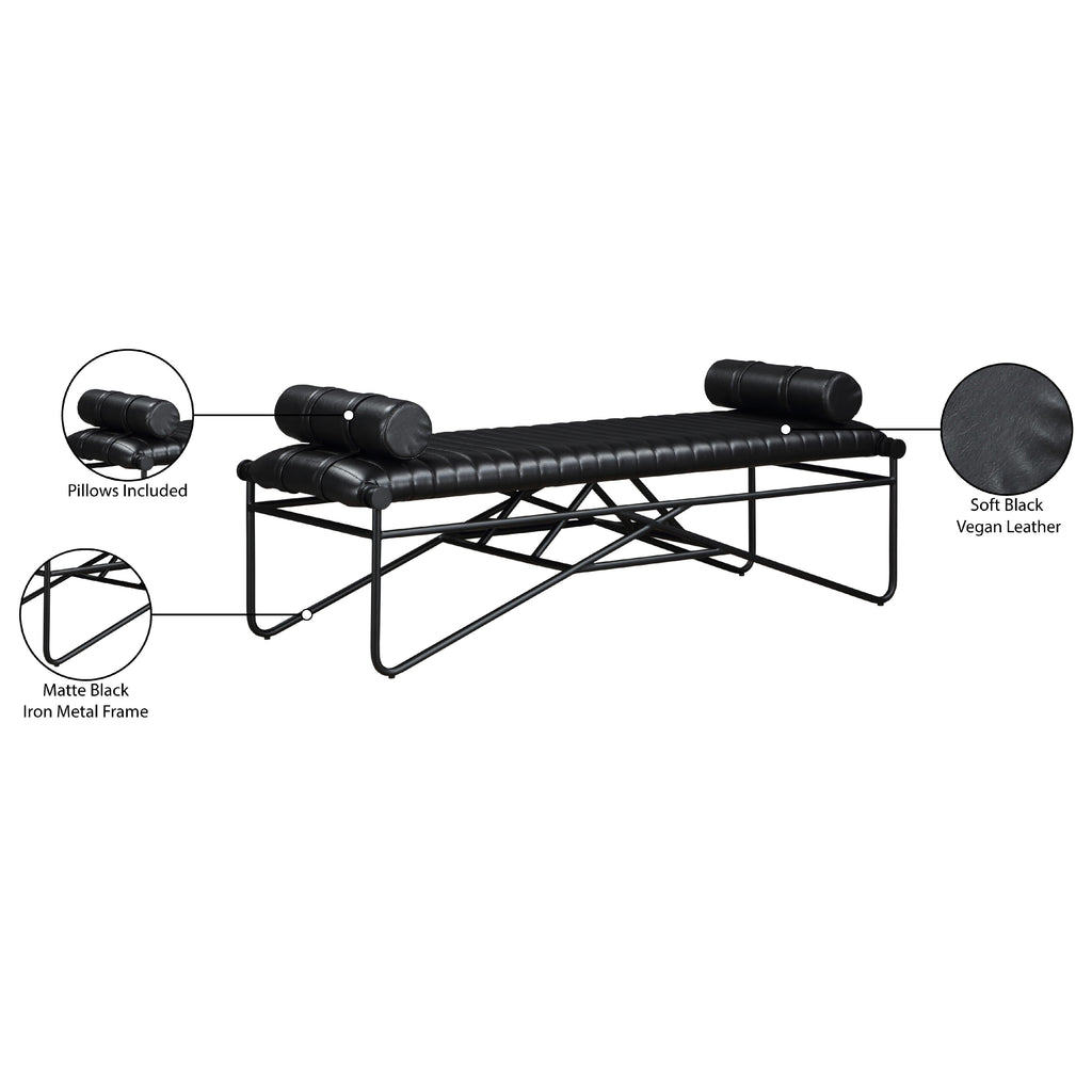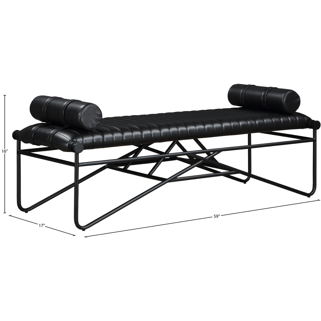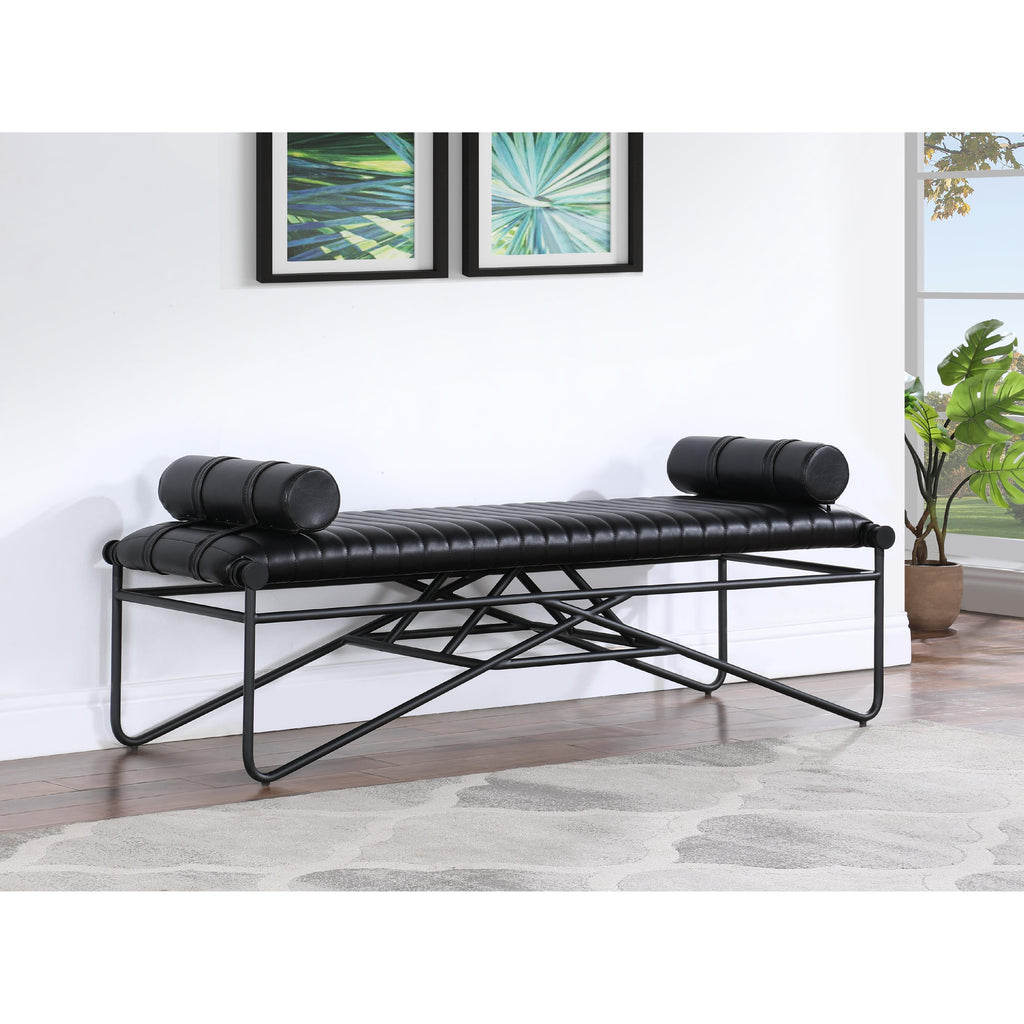 Elevate your space effortlessly with this Gatsby Black Vegan Leather Bench. Swathed in soft black faux leather and anchored by a matte black iron metal frame, it boasts a contemporary design that's both sleek and stylish. The included rolled pillows give this bench an upscale yet comfortable look. Whether gracing your entryway with a touch of elegance or providing a chic accent at the foot of your bed, this versatile piece is sure to impress. Upgrade your home decor with this lovely vegan leather bench to give any space a touch of sophistication.