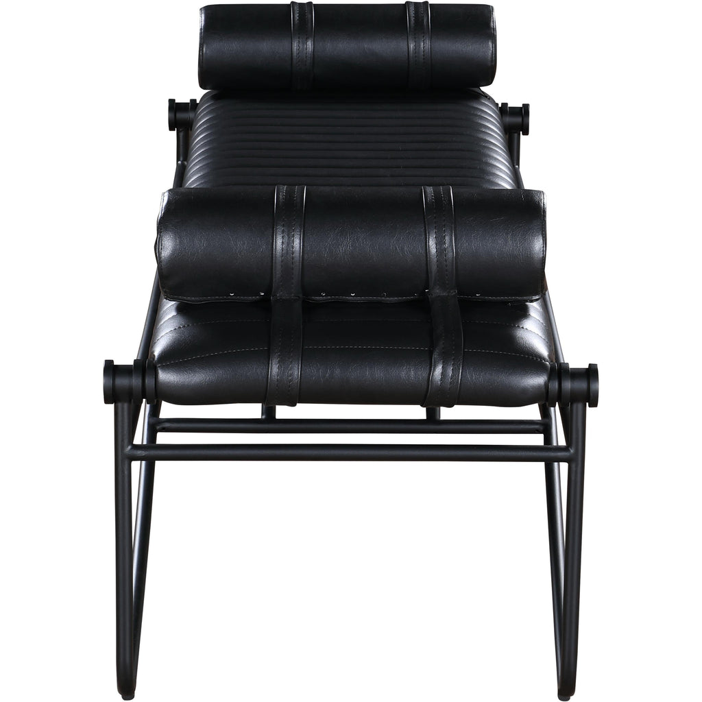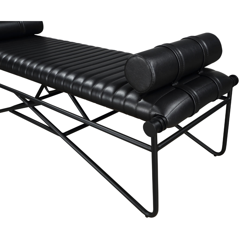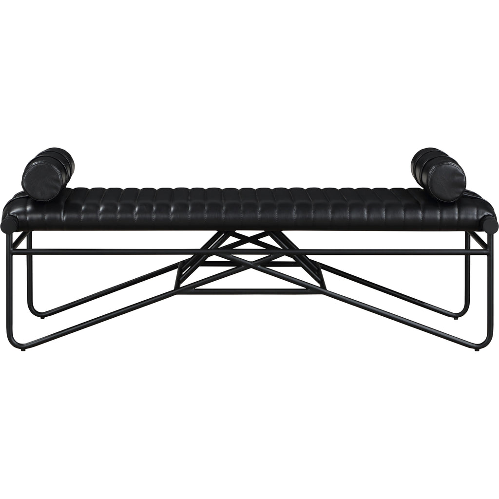 Elevate your space effortlessly with this Gatsby Black Vegan Leather Bench. Swathed in soft black faux leather and anchored by a matte black iron metal frame, it boasts a contemporary design that's both sleek and stylish. The included rolled pillows give this bench an upscale yet comfortable look. Whether gracing your entryway with a touch of elegance or providing a chic accent at the foot of your bed, this versatile piece is sure to impress. Upgrade your home decor with this lovely vegan leather bench to give any space a touch of sophistication.
