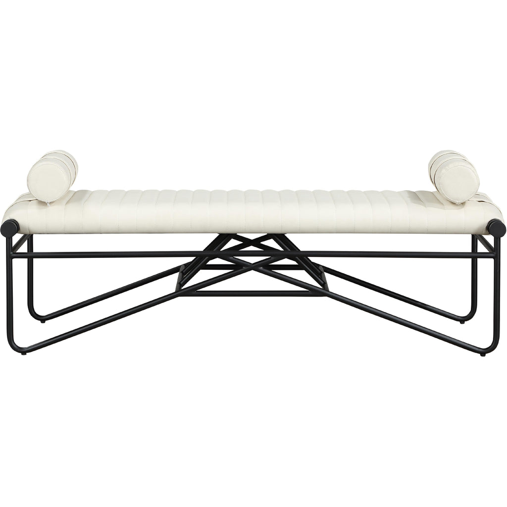 Elevate your space effortlessly with this Gatsby Cream Vegan Leather Bench. Swathed in soft cream faux leather and anchored by a matte black iron metal frame, it boasts a contemporary design that's both sleek and stylish. The included rolled pillows give this bench an upscale yet comfortable look. Whether gracing your entryway with a touch of elegance or providing a chic accent at the foot of your bed, this versatile piece is sure to impress. Upgrade your home decor with this lovely vegan leather bench to give any space a touch of sophistication.