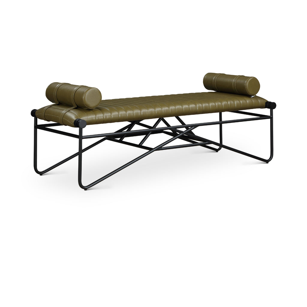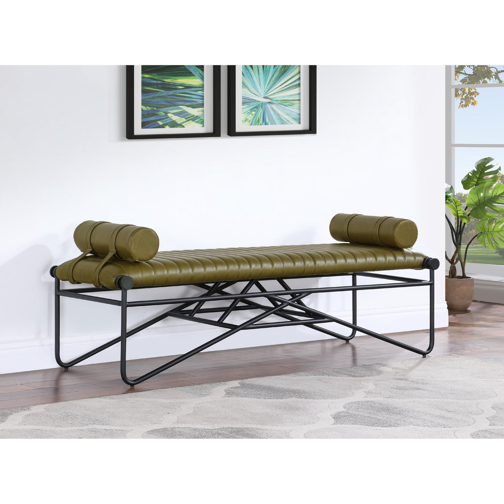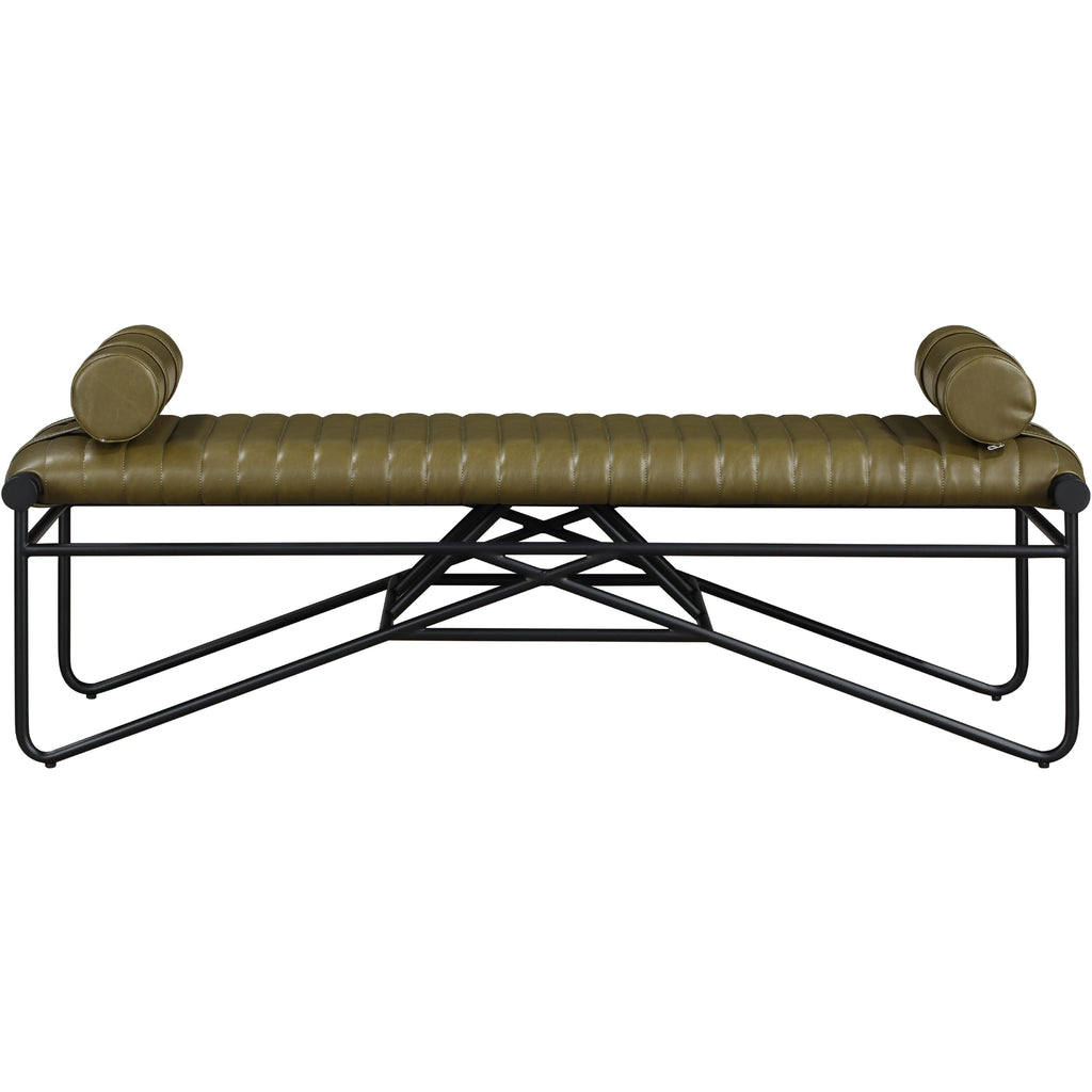 Elevate your space effortlessly with this Gatsby Olive Vegan Leather Bench. Swathed in soft olive faux leather and anchored by a matte black iron metal frame, it boasts a contemporary design that's both sleek and stylish. The included rolled pillows give this bench an upscale yet comfortable look. Whether gracing your entryway with a touch of elegance or providing a chic accent at the foot of your bed, this versatile piece is sure to impress. Upgrade your home decor with this lovely vegan leather bench to give any space a touch of sophistication.
