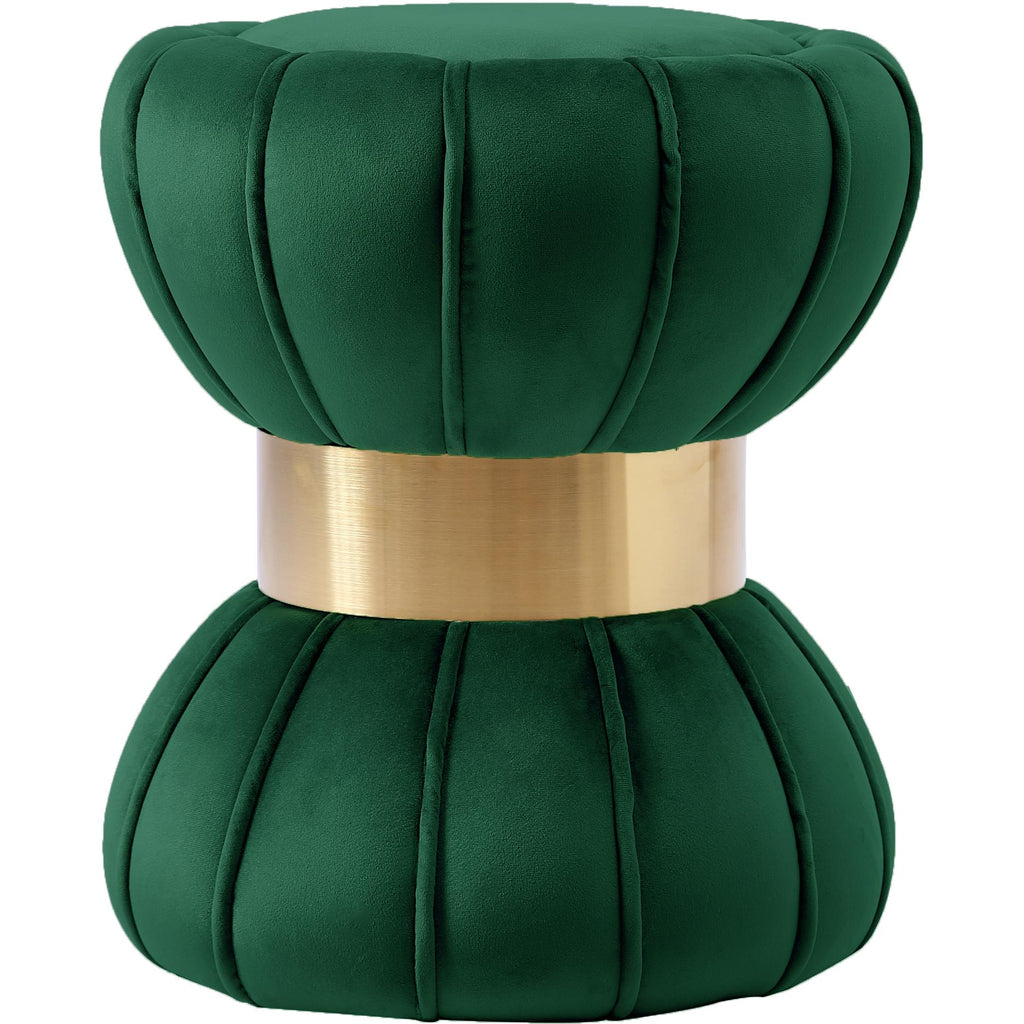 Add modern sophistication to your living space with this chic green velvet Vino ottoman stool. Plush green velvet curves are bound by a gold stainless steel band in its center, creating an hourglass shape that is edgy and complements your contemporary home decor. Place this lush ottoman stool next to your vanity in your bedroom, so you'll have a comfy place to sit while you do your hair and put on your makeup.