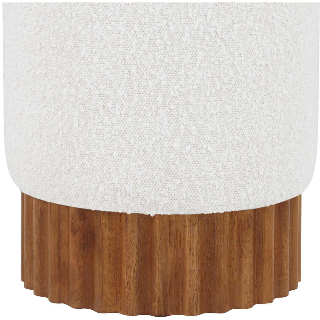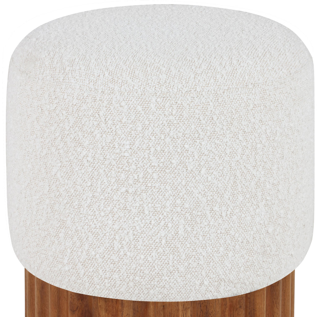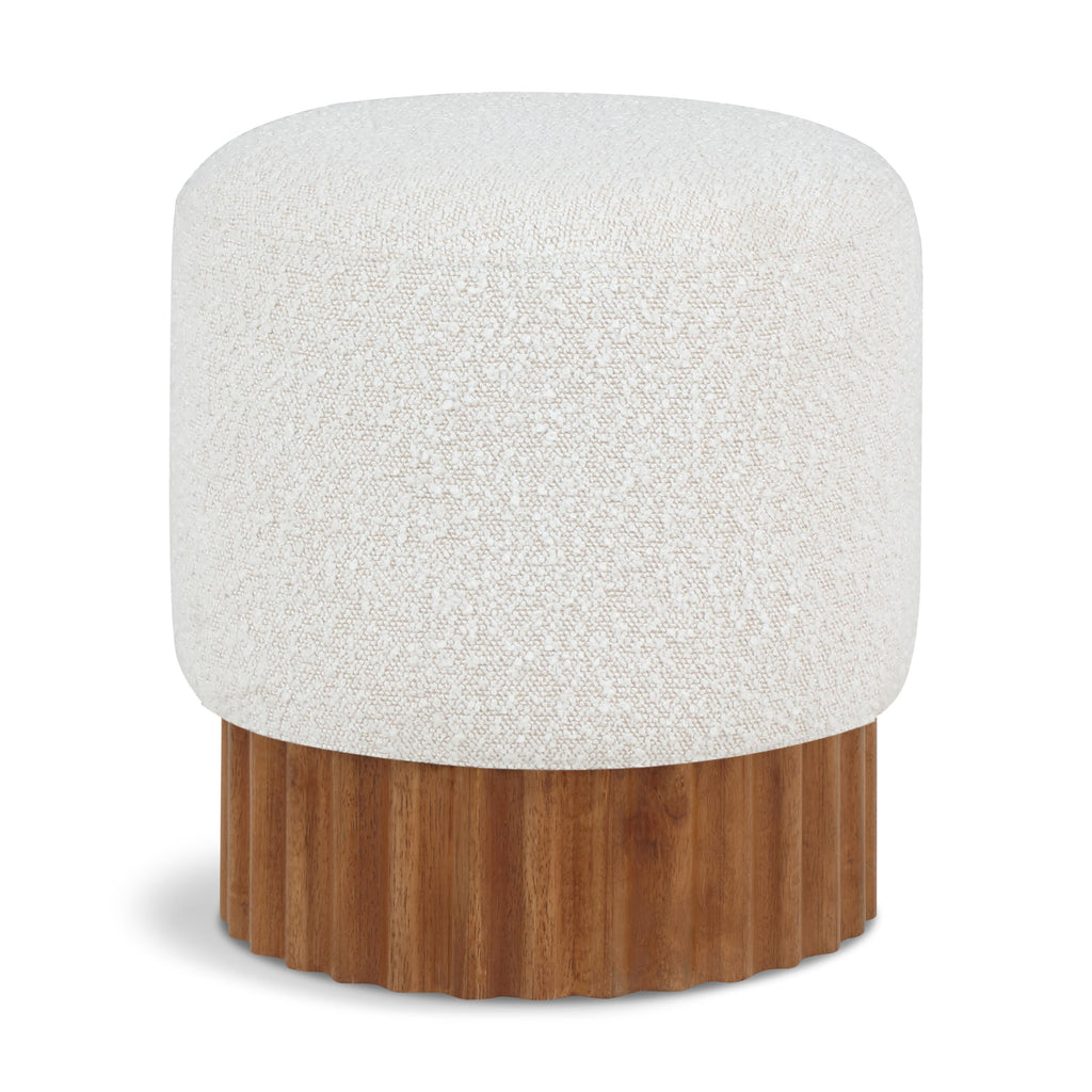 Indulge in the luxurious texture of the Veranda Boucle Fabric Ottoman/Stool. It boasts a rich cream boucle fabric that is paired with an elegant and sturdy solid wood base, featuring a walnut finish that highlights the beautiful wood grain patterns. This unique combination of materials creates a perfect blend of style and durability, making it an ideal addition to any modern or traditional interior design.