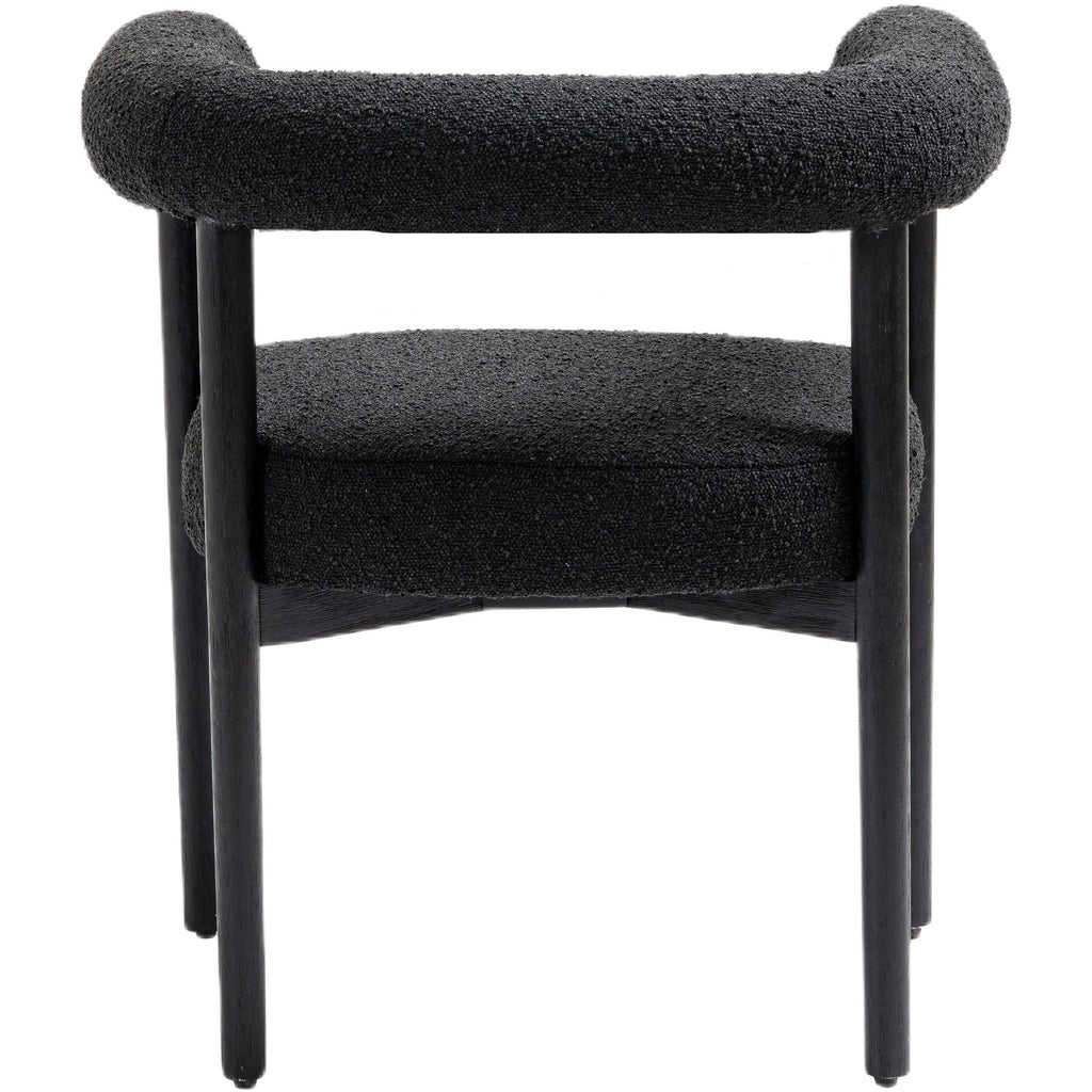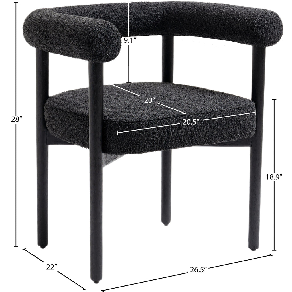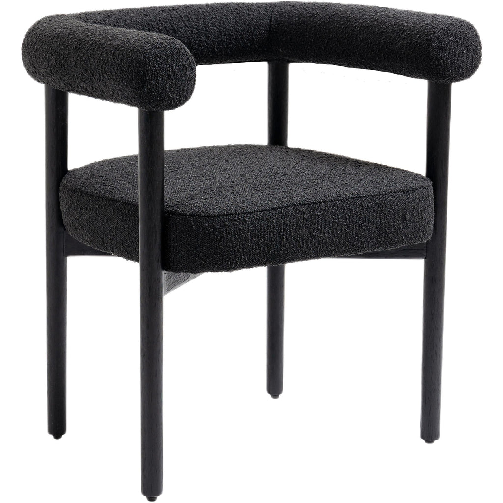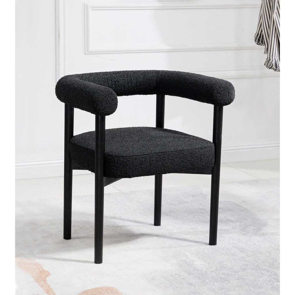 Perfect the look of your dining room with this Hyatt boucle fabric dining chair. Add two, four, or more of these sumptuously appointed dining chairs to the mix to add an elegant vibe for meals large and small. The solid wood chair frame is finished in black to coordinate with the sophisticated feel of the rich black boucle fabric upholstery. A curvy back drives home the modern feel of this lovely chair.