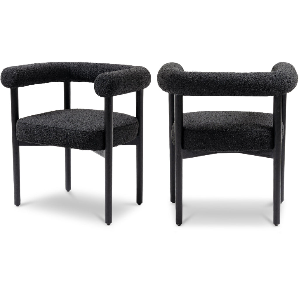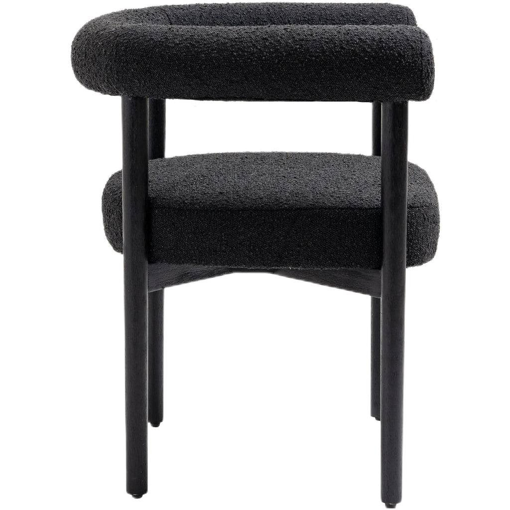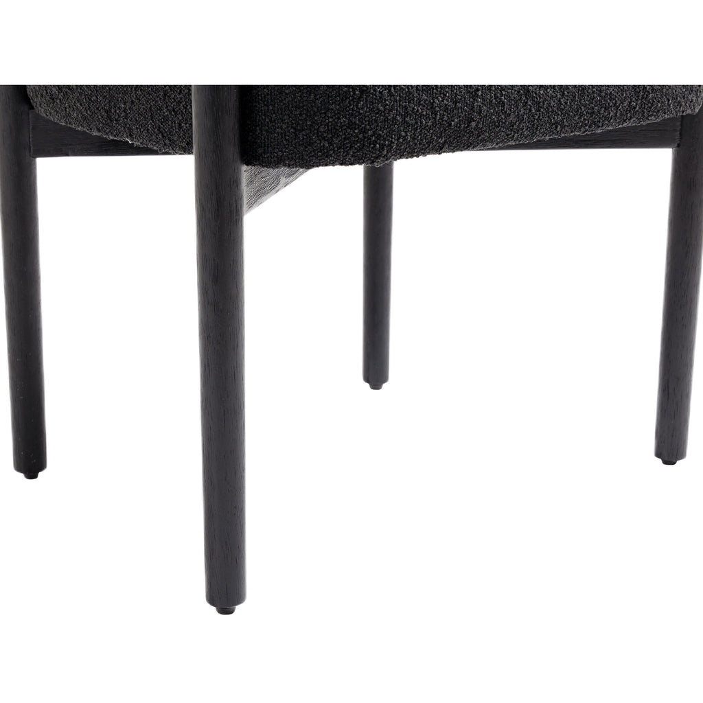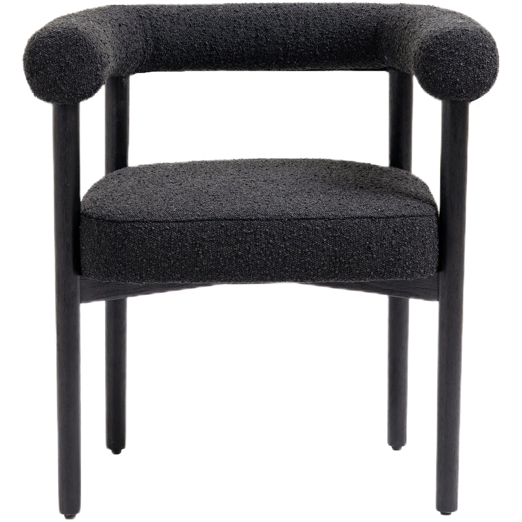 Perfect the look of your dining room with this Hyatt boucle fabric dining chair. Add two, four, or more of these sumptuously appointed dining chairs to the mix to add an elegant vibe for meals large and small. The solid wood chair frame is finished in black to coordinate with the sophisticated feel of the rich black boucle fabric upholstery. A curvy back drives home the modern feel of this lovely chair.