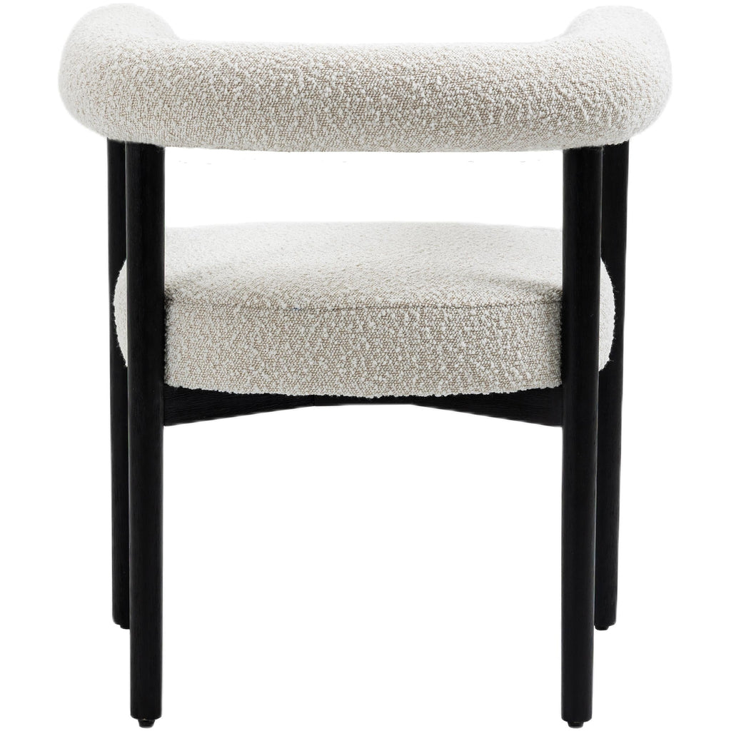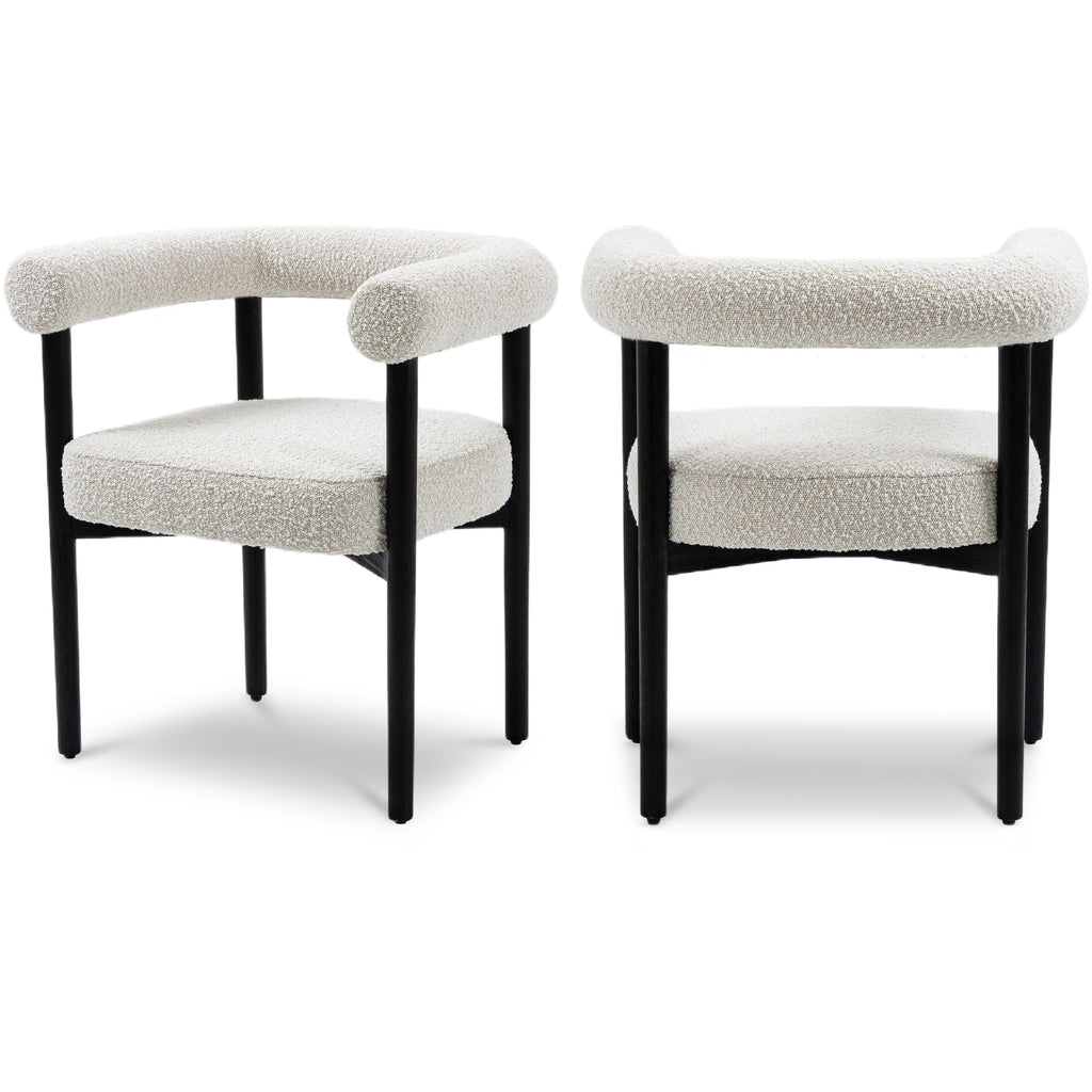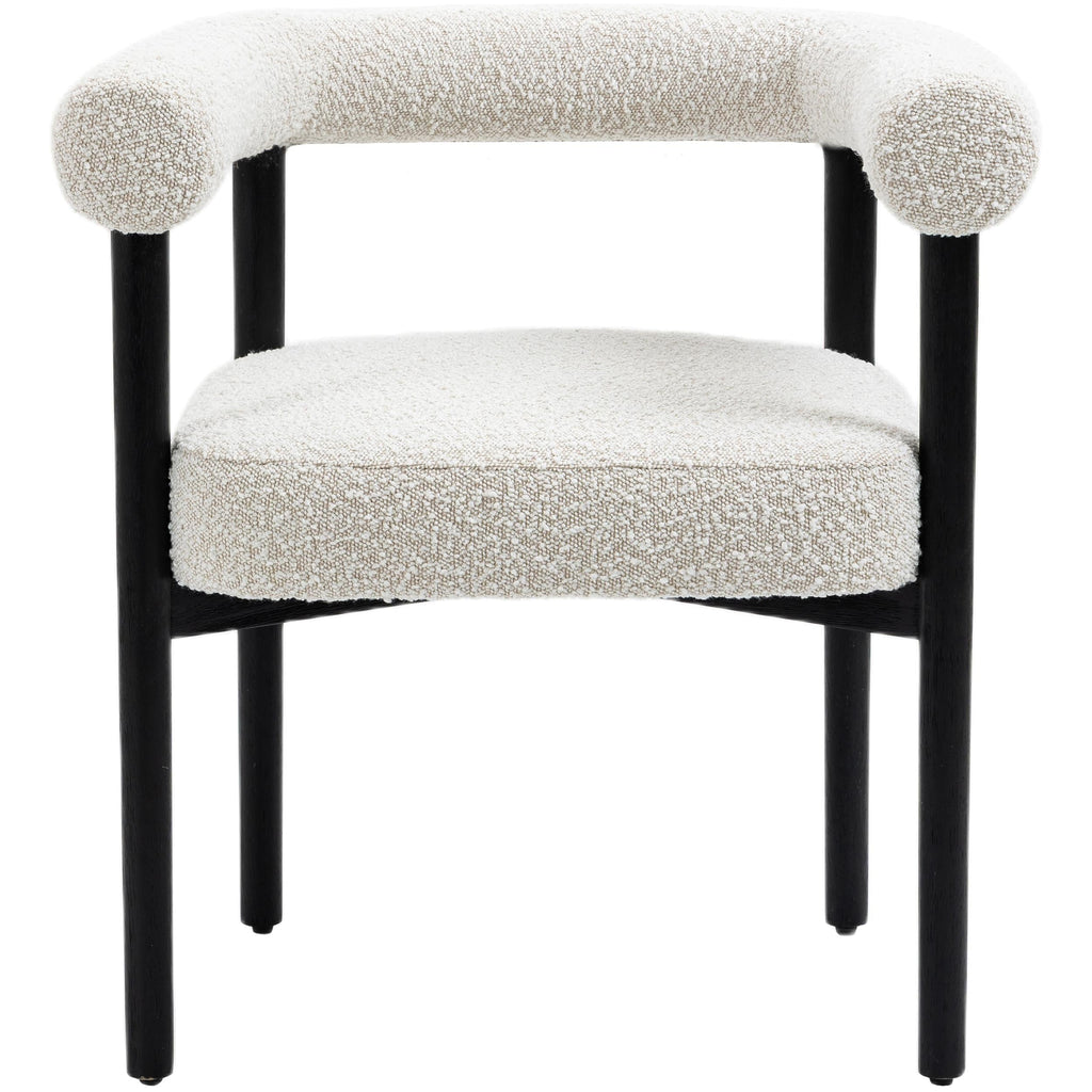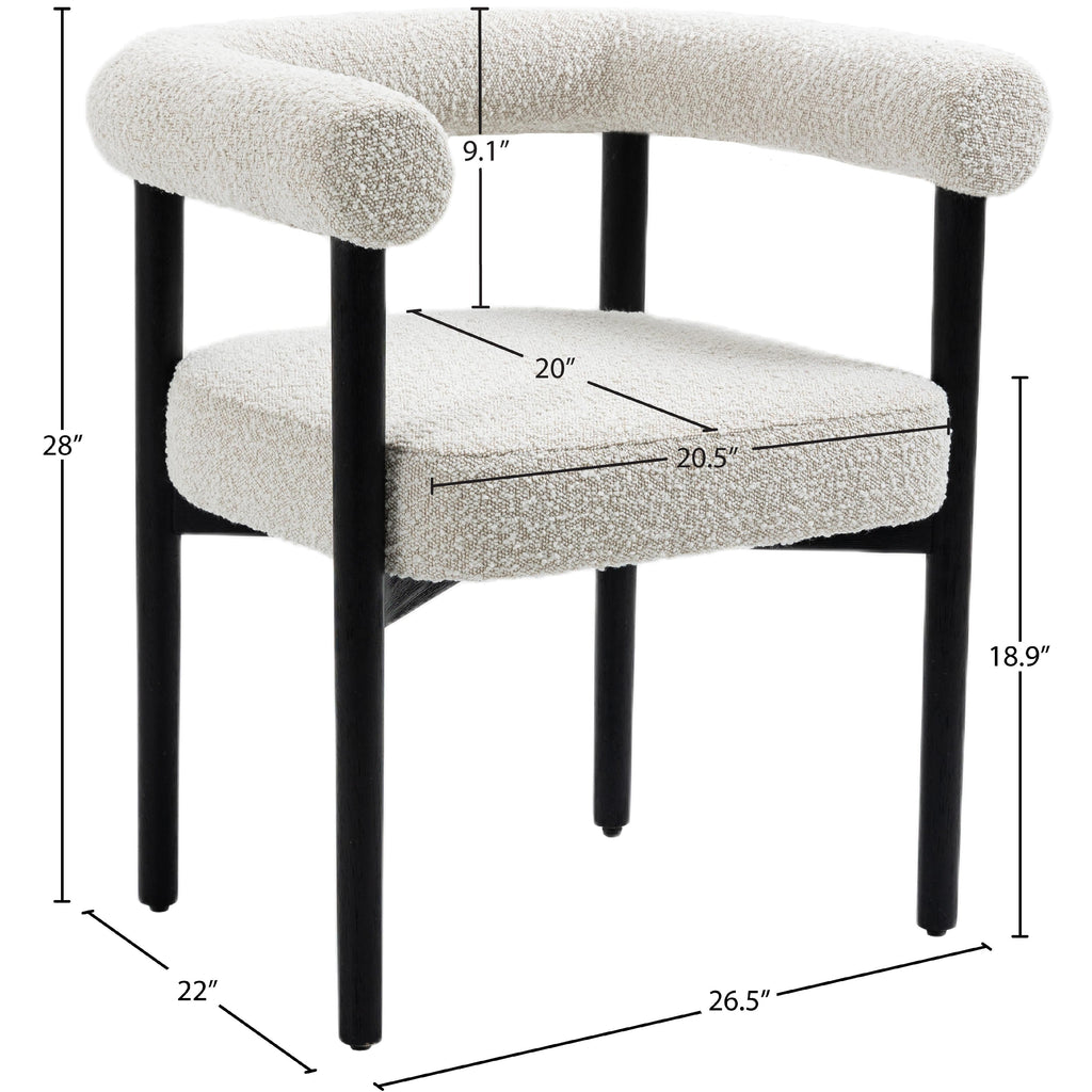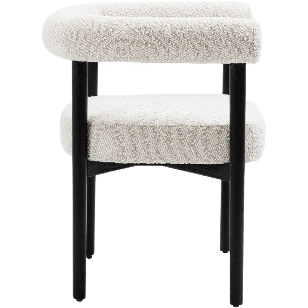 Perfect the look of your dining room with this Hyatt boucle fabric dining chair. Add two, four, or more of these sumptuously appointed dining chairs to the mix to add an elegant vibe for meals large and small. The solid wood chair frame is finished in black to coordinate with the sophisticated feel of the rich cream boucle fabric upholstery. A curvy back drives home the modern feel of this lovely chair.
