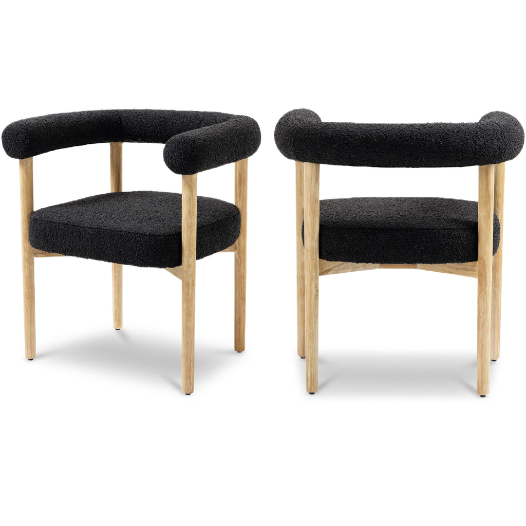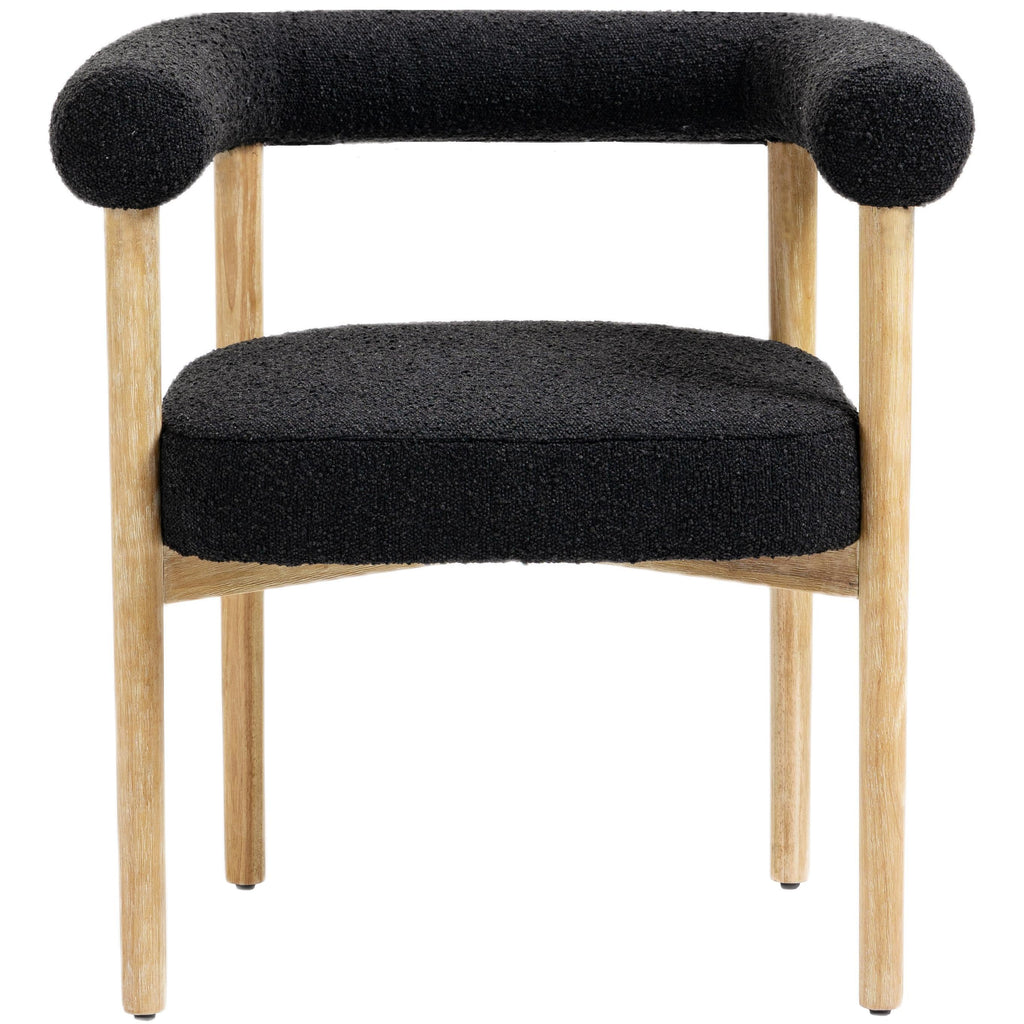 Perfect the look of your dining room with this Hyatt boucle fabric dining chair. Add two, four, or more of these sumptuously appointed dining chairs to the mix to add an elegant vibe for meals large and small. The solid wood chair frame with a natural finish coordinates with the sophisticated feel of the rich black boucle fabric upholstery. A curvy back drives home the modern feel of this lovely chair.