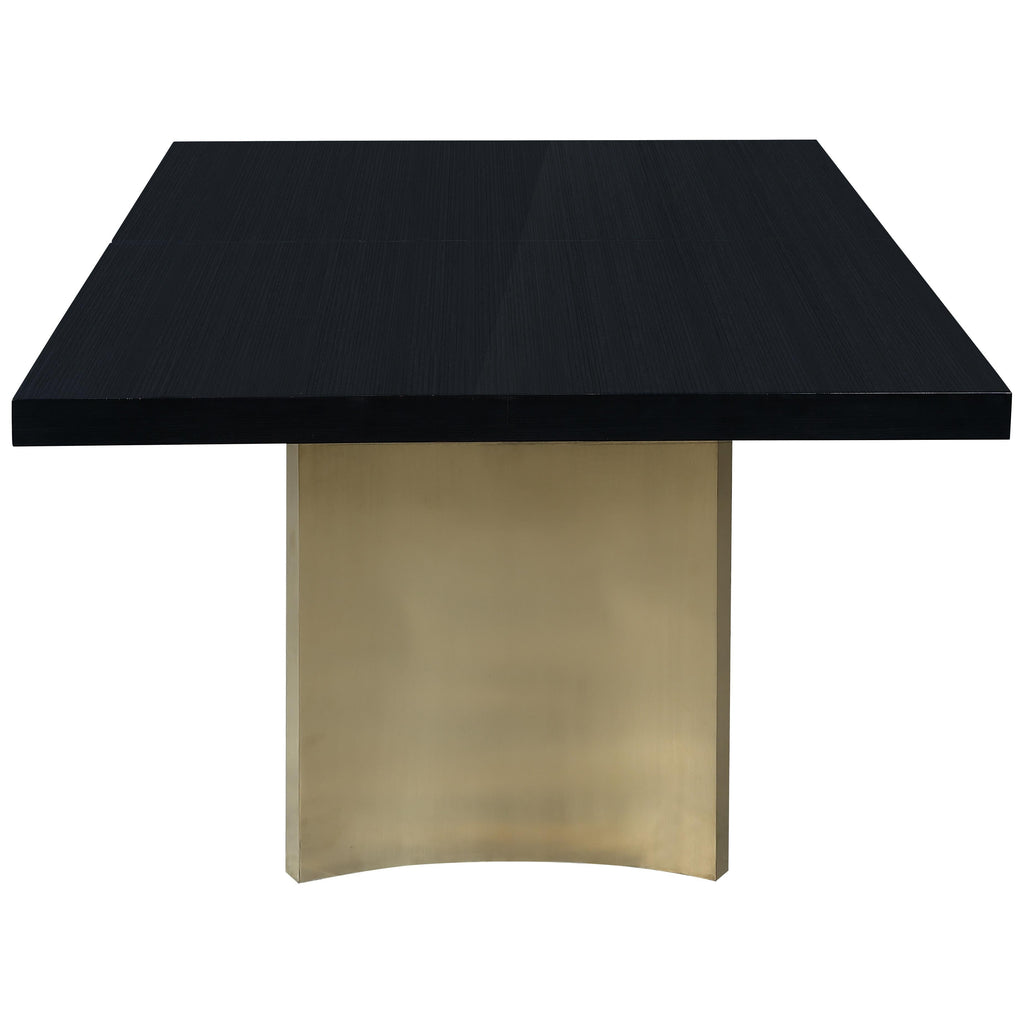 Enjoy oodles of elbow room with this Immerse dining table. Designed to accommodate the whole gang for meals large and small, this pretty table features a rich black lacquer top with wood grain details for an upscale presentation in your dining room space. A steel base supports the amply sized top and features a brushed gold finish for an elegantly eye-catching look.