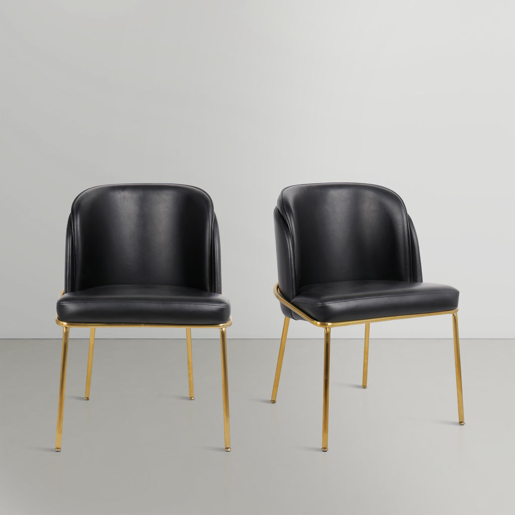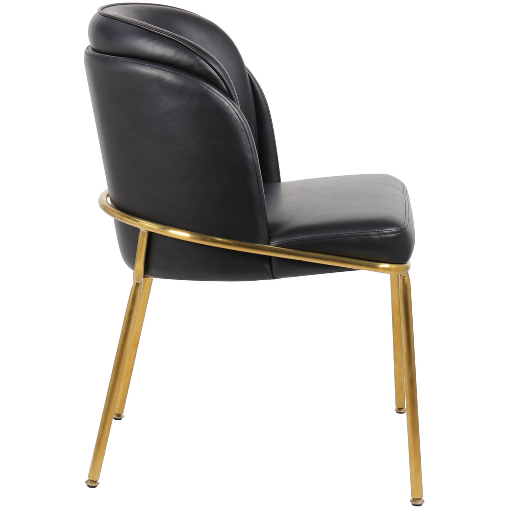 Give your dining room an upscale look with this Jagger vegan leather dining chair. The seat and back of this lovely chair comes upholstered in black vegan leather material that looks so genuine, only you will know it's not the real thing. Brushed gold iron legs on this chair lend it an upscale look and adds to its overall contemporary panache.