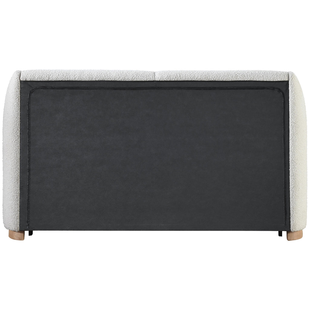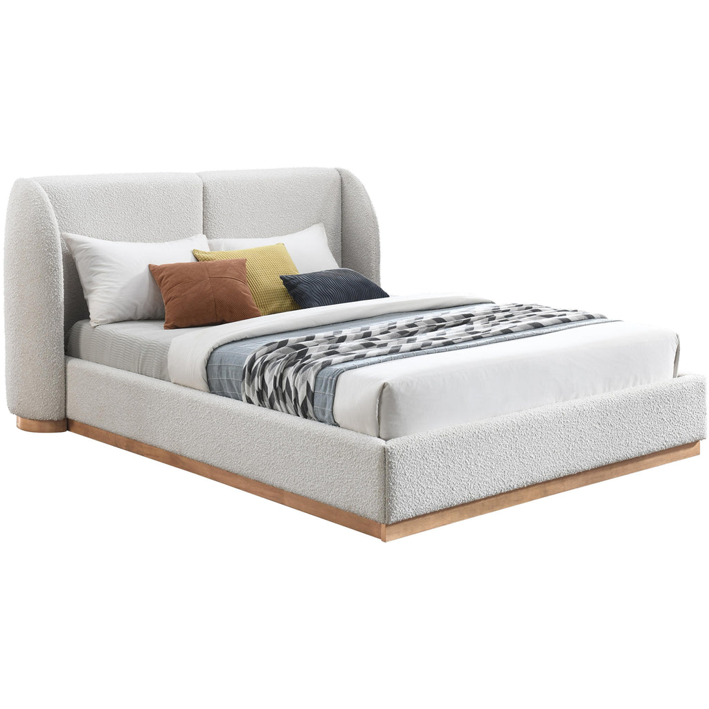 Add showstopping appeal to your bedroom sanctuary with this Jardin boucle fabric full bed. Cream boucle fabric covers this full bed's headboard and side rails, adding soft, sumptuous appeal to its allover aesthetic. The winged headboard is softly padded for comfort against your back and neck while you lounge around, reading or watching television. A natura oak finish on the solid wood base adds a distinctly sophisticated finish. Use this art-deco style bed with just a mattress if desired; box springs are not necessary.