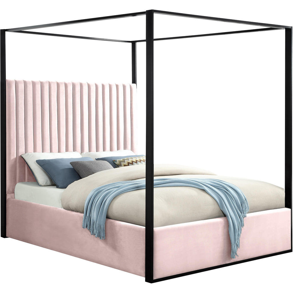 Dream big in the Jax pink velvet canopy bed. This handsome Meridian Furniture bed has a channel tufted headboard, giving the bed a regal and sophisticated look. The headboard is tufted for added elegance, and the bed comes with a matte black steel canopy, adding to its overall elegance and grandeur. pink velvet fabric used on the sides and headboard gives it a luxe vibe, and the headboard is heavily padded, making it an ideal backrest for reading or watching TV.