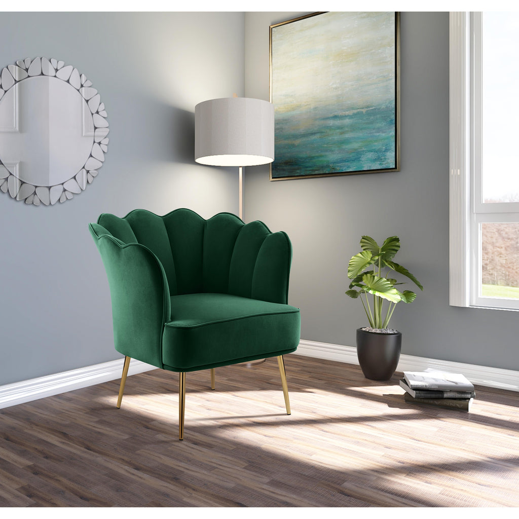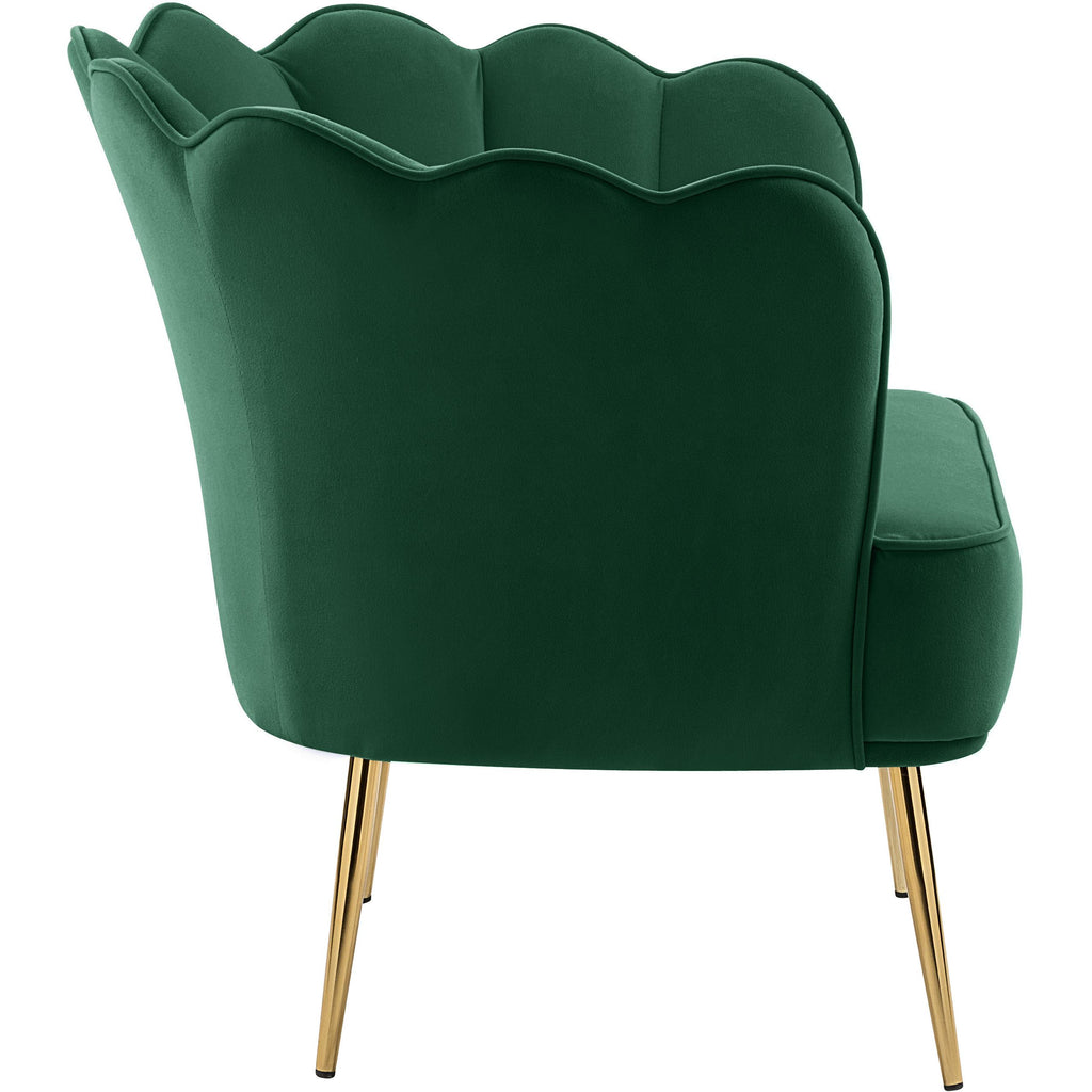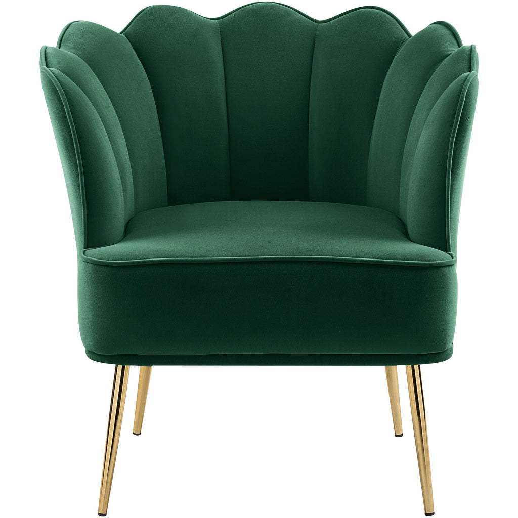 Rest your bones like an MVP when you're seated in this Jester velvet accent chair. This fun chair features a sculpted back upholstered in chic rich green velvet with a shell motif and deeply tufted channels that cradle your body in full comfort while you get comfortable. The base is made from metal for long-lasting service, and the legs are finished in gold for a beautiful, contemporary touch.