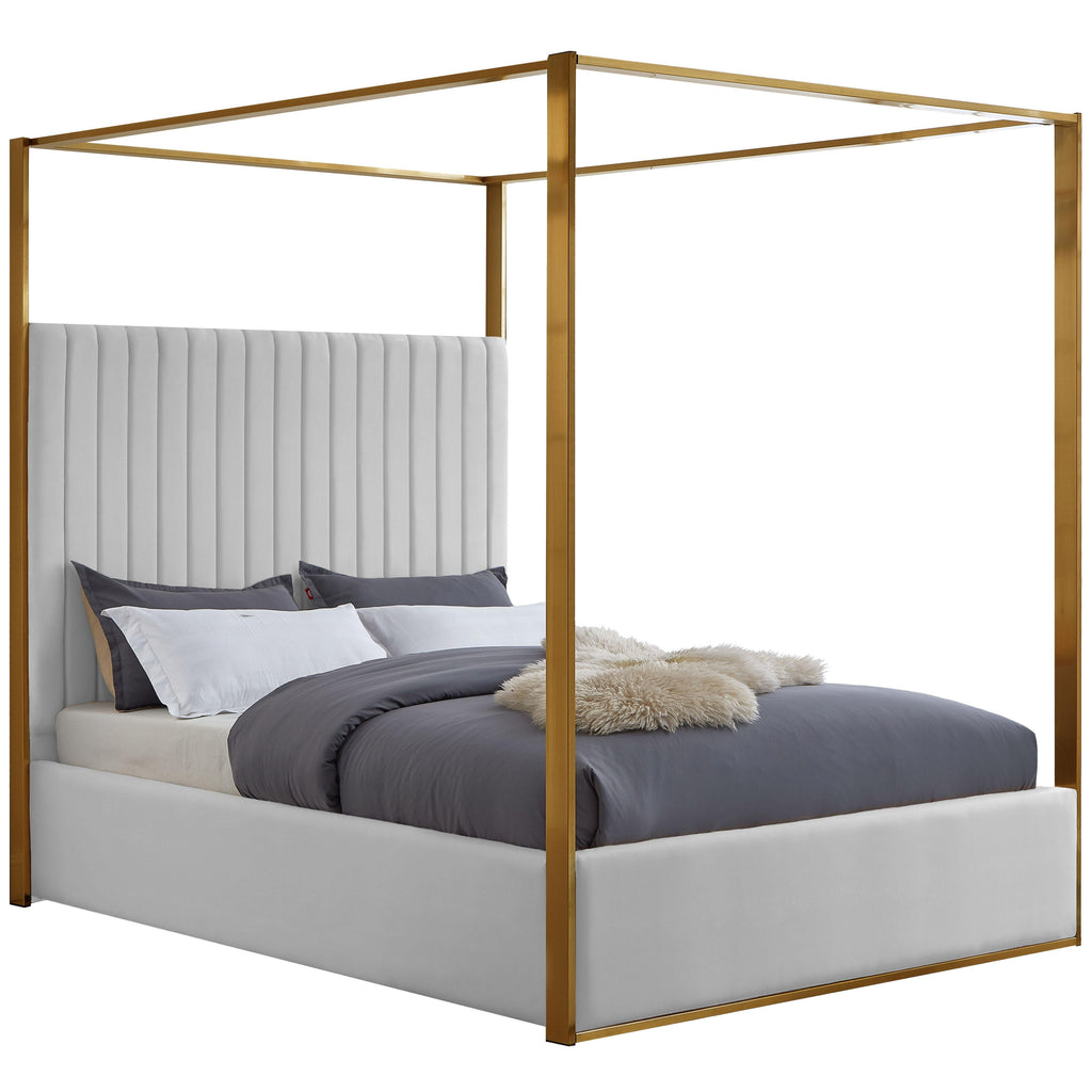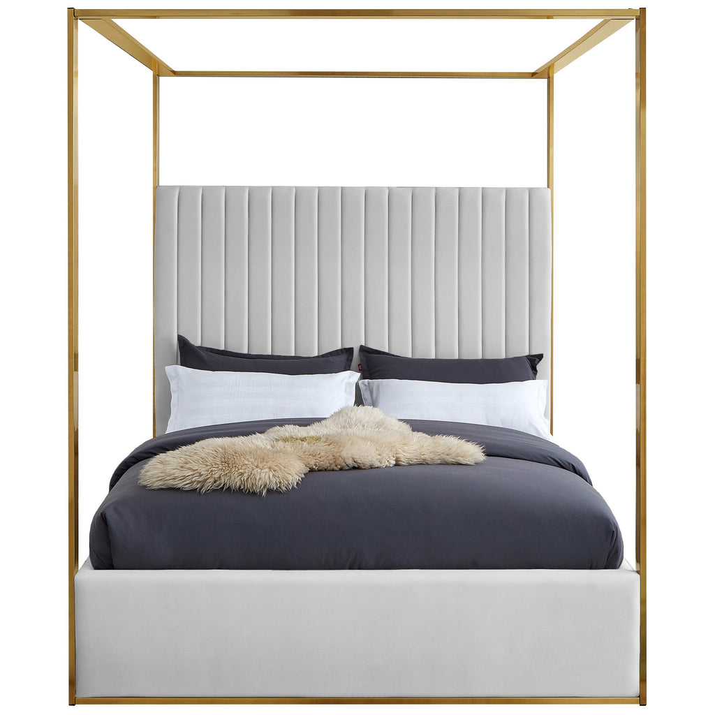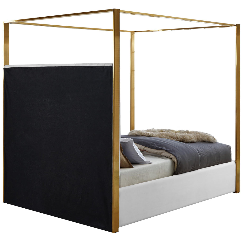 Dream big in the Jones white velvet canopy bed. This handsome Meridian Furniture bed has a channel tufted headboard, giving the bed a regal and sophisticated look. The headboard is tufted for added elegance, and the bed comes with a brushed brass metal canopy, adding to its overall elegance and grandeur. White velvet fabric used on the sides and headboard gives it a luxe vibe, and the headboard is heavily padded, making it an ideal backrest for reading or watching TV.