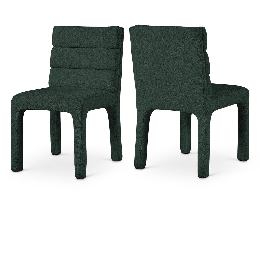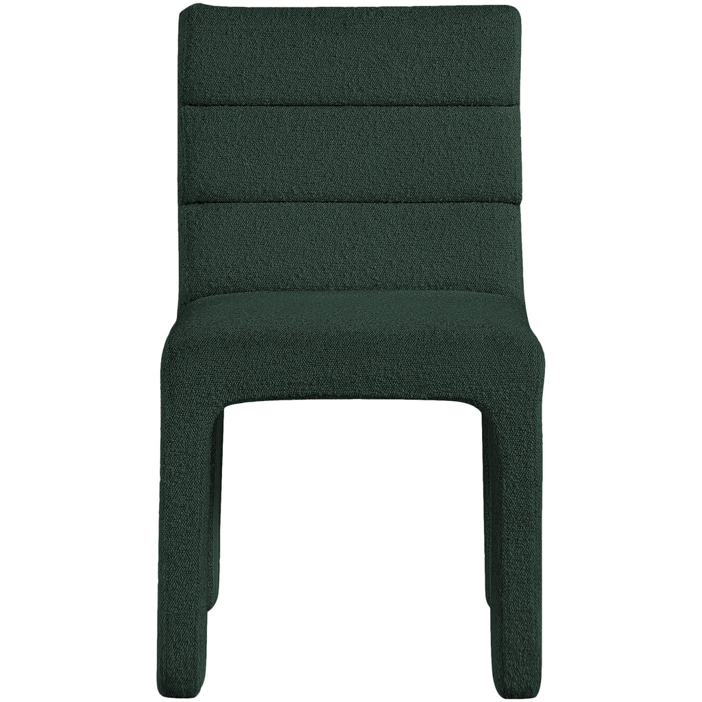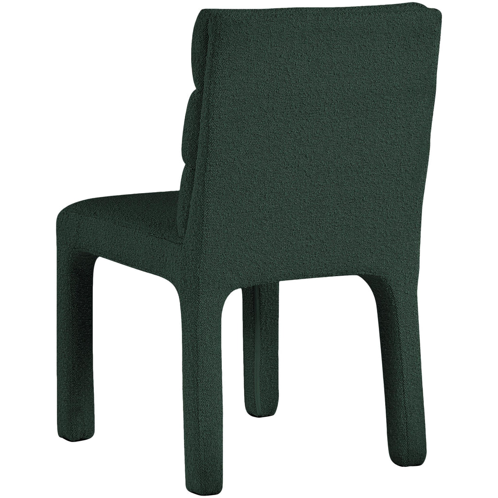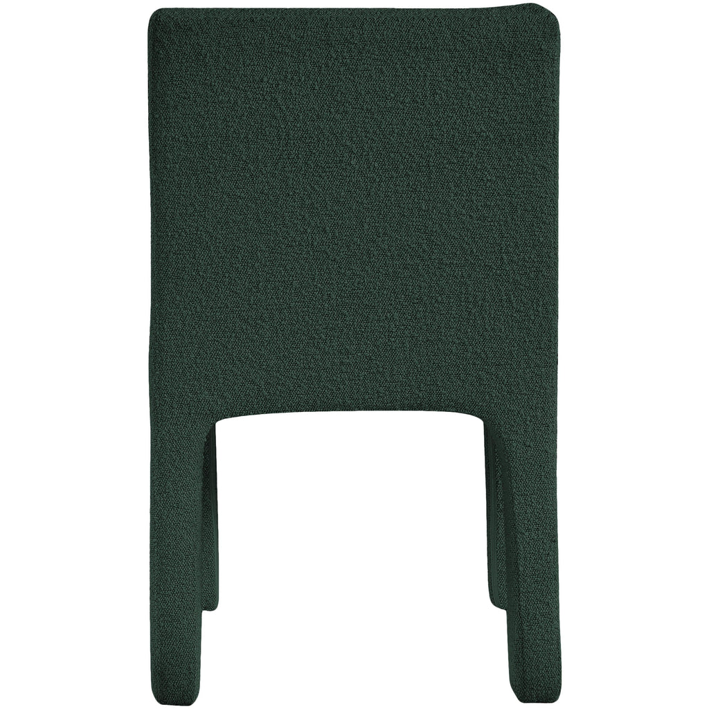 Comfort is key with this Kai boucle fabric dining chair. Stunningly elegant yet boldly understated by design, this dining chair is an ideal addition to your dining room setup. The metal frame ensures lasting durability while the green boucle fabric upholstery gives the chair a sleek and modish look. Tufting on the back adds to the chair's overall comfort level. Pair several of these chairs with your favorite dining table for a complete look.