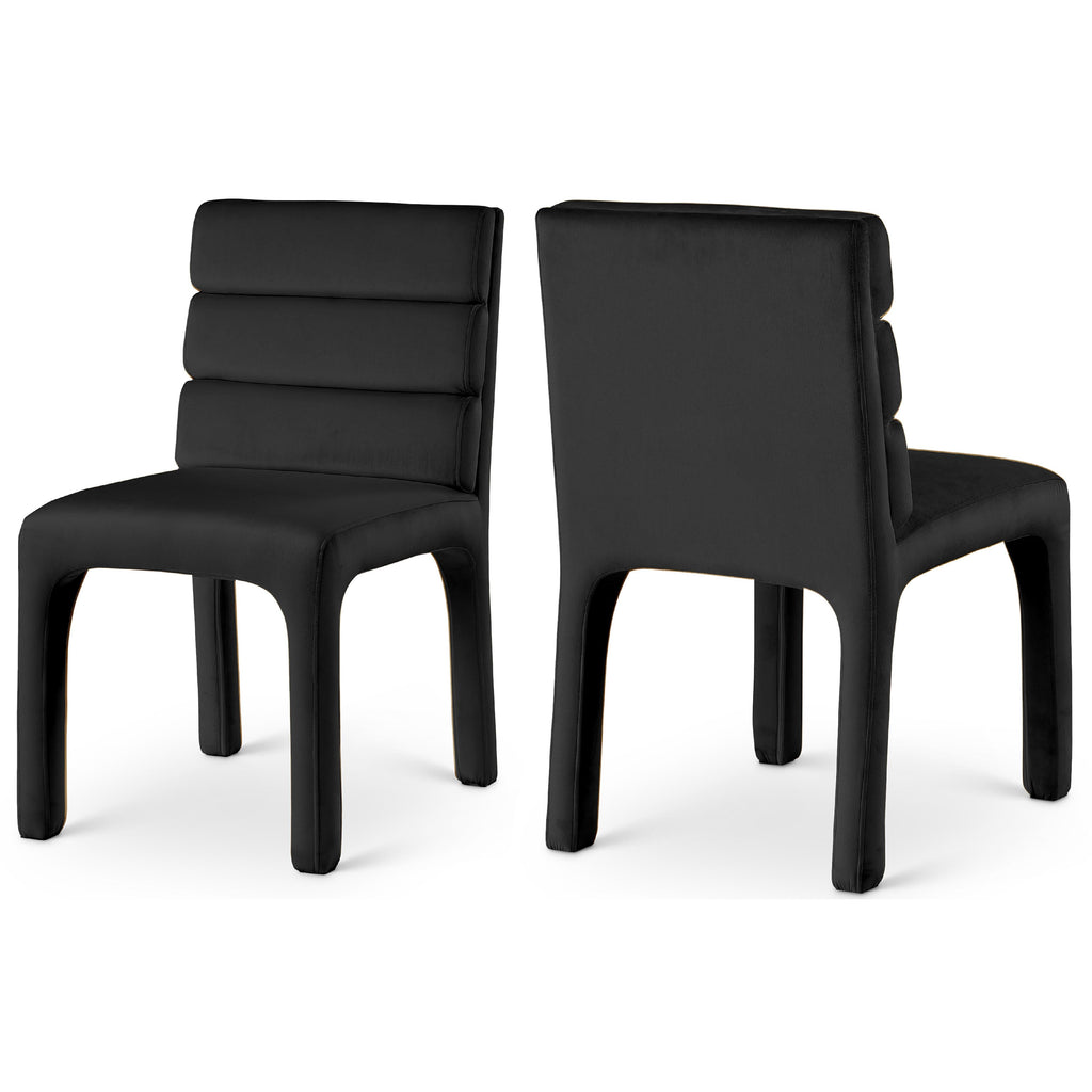 Create a refined yet modern vibe in your dining room with the addition of these Kai velvet dining chairs to your space. These lovely chairs feature a contemporary look that makes them the center of attention. Luxurious black velvet upholster covers the chair's back, seat, and legs, lending it a soft-to-the-touch feel, and the back is padded with soft foam and channel tufted for added comfort dinner guests can appreciate.