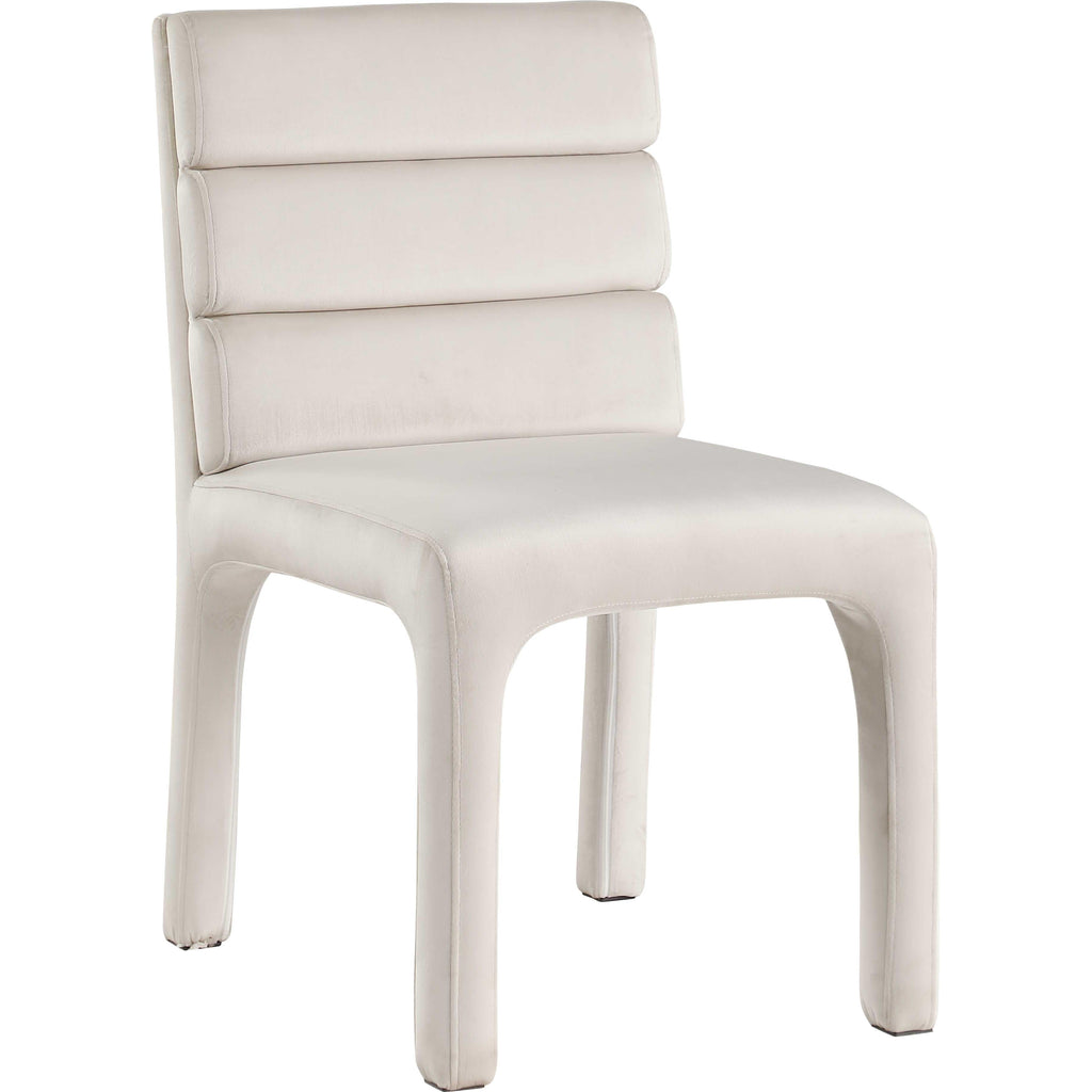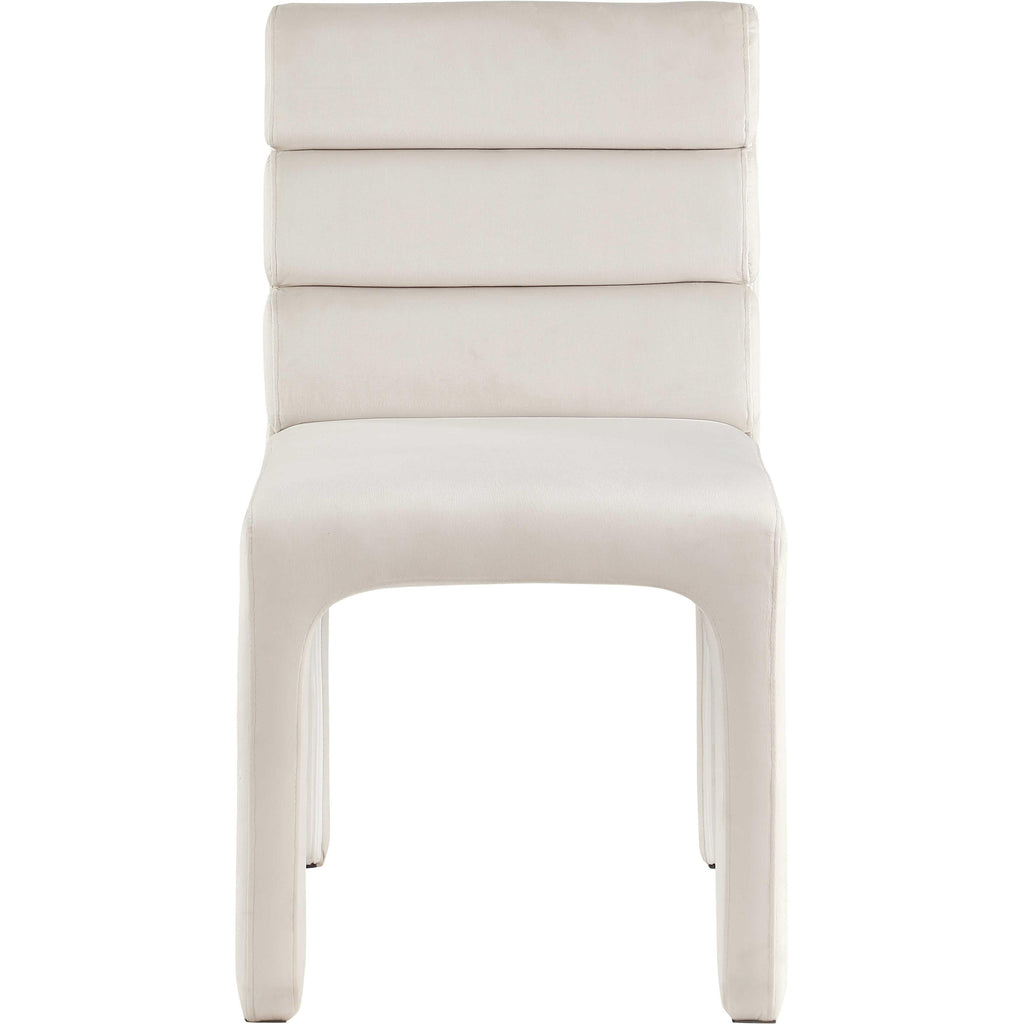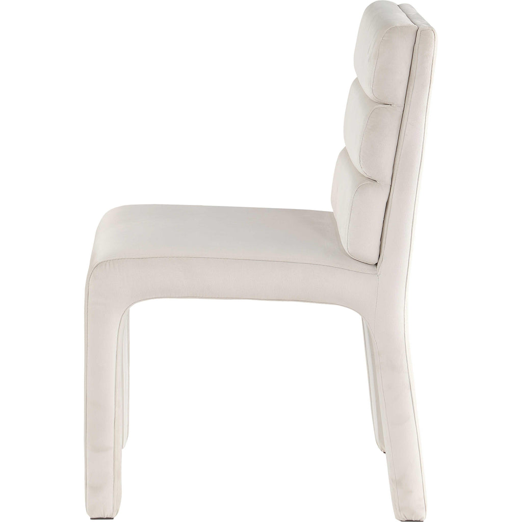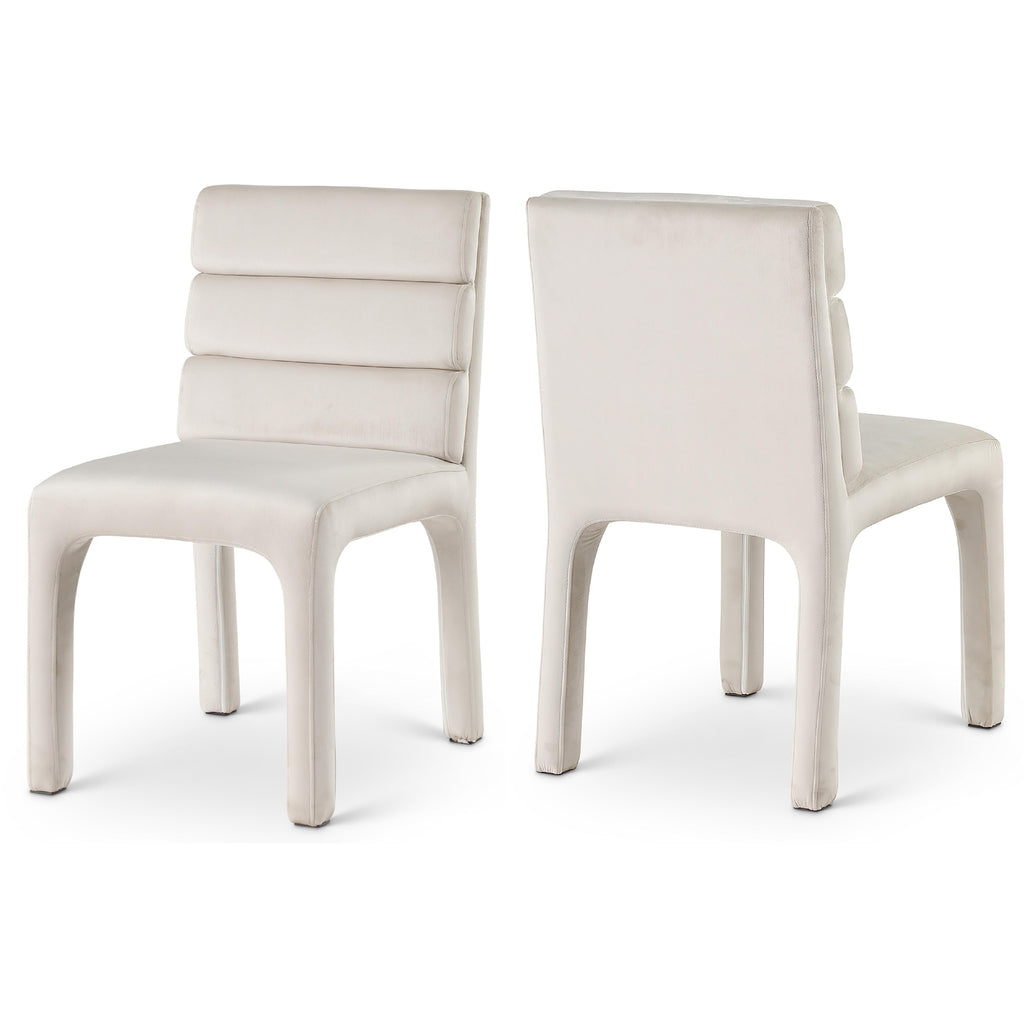 Create a refined yet modern vibe in your dining room with the addition of these Kai velvet dining chairs to your space. These lovely chairs feature a contemporary look that makes them the center of attention. Luxurious cream velvet upholster covers the chair's back, seat, and legs, lending it a soft-to-the-touch feel, and the back is padded with soft foam and channel tufted for added comfort dinner guests can appreciate.